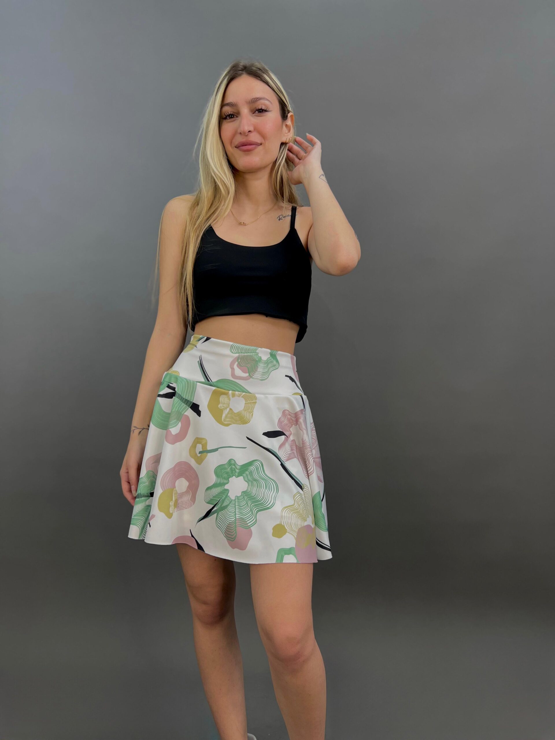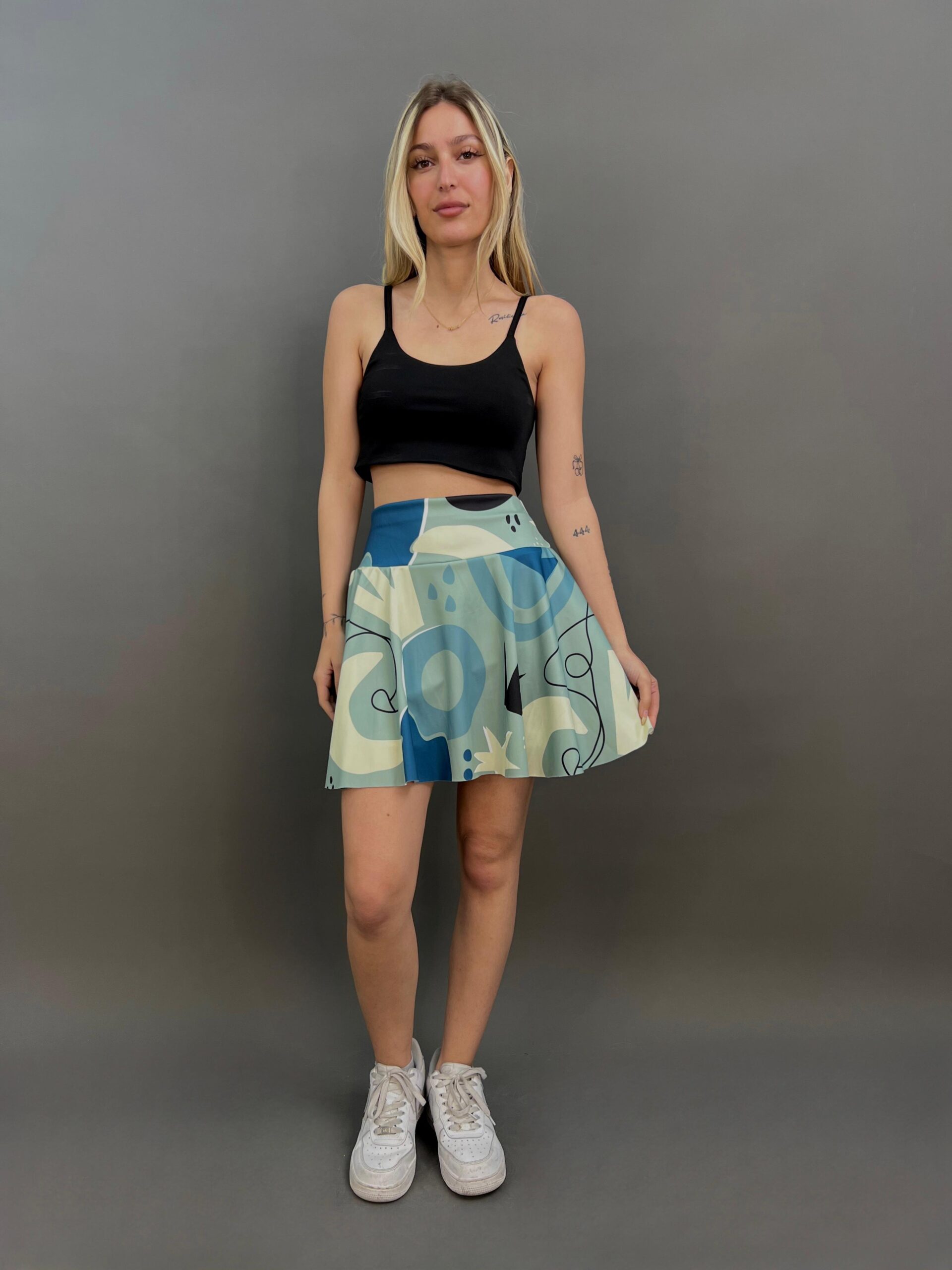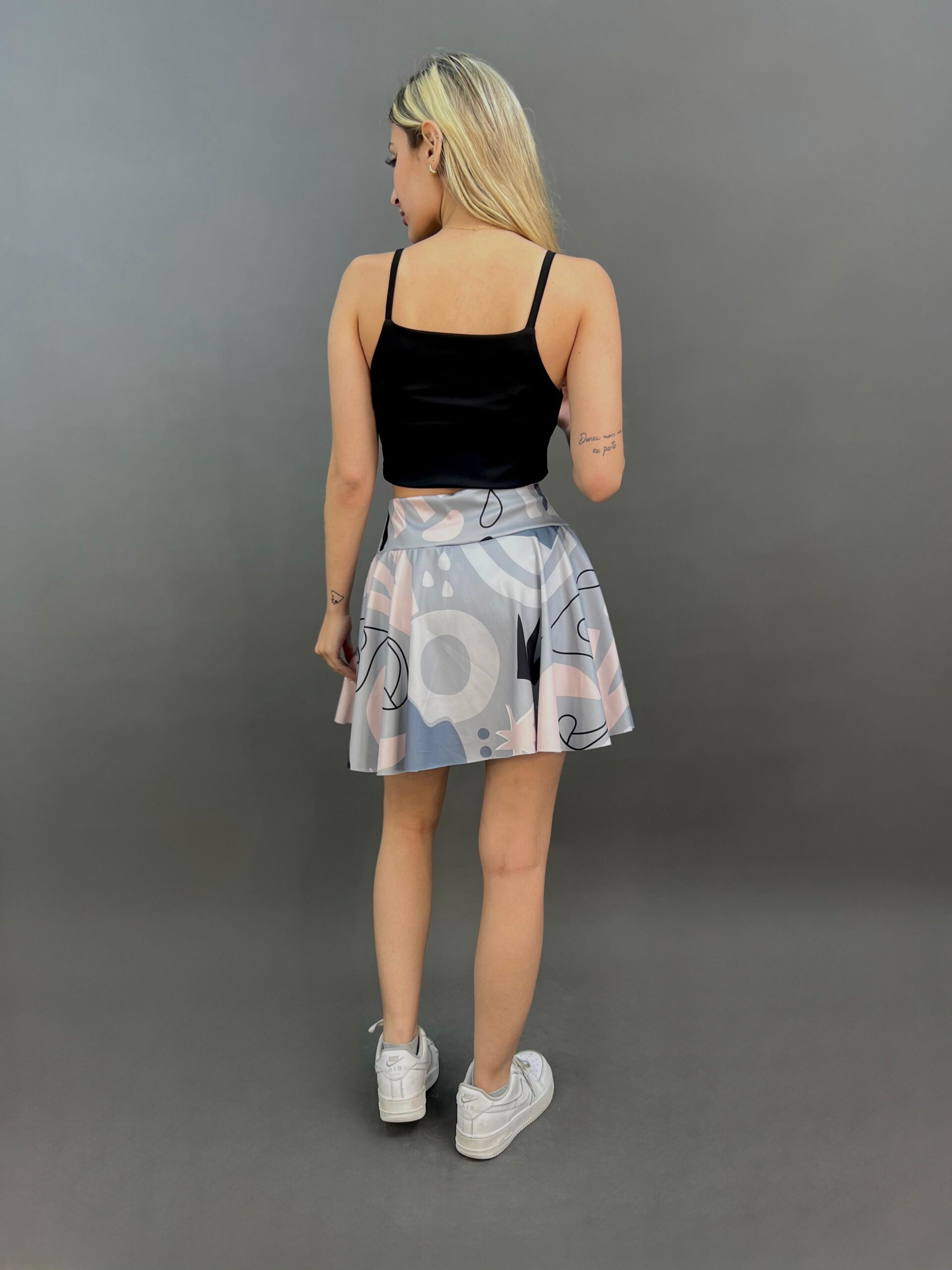 Serve looks on and off the court with this playful tennis skirt featuring a dynamic abstract print. Designed with built-in shorts for comfort and coverage, it combines sporty function with stylish flair — perfect for active days or casual outfits.