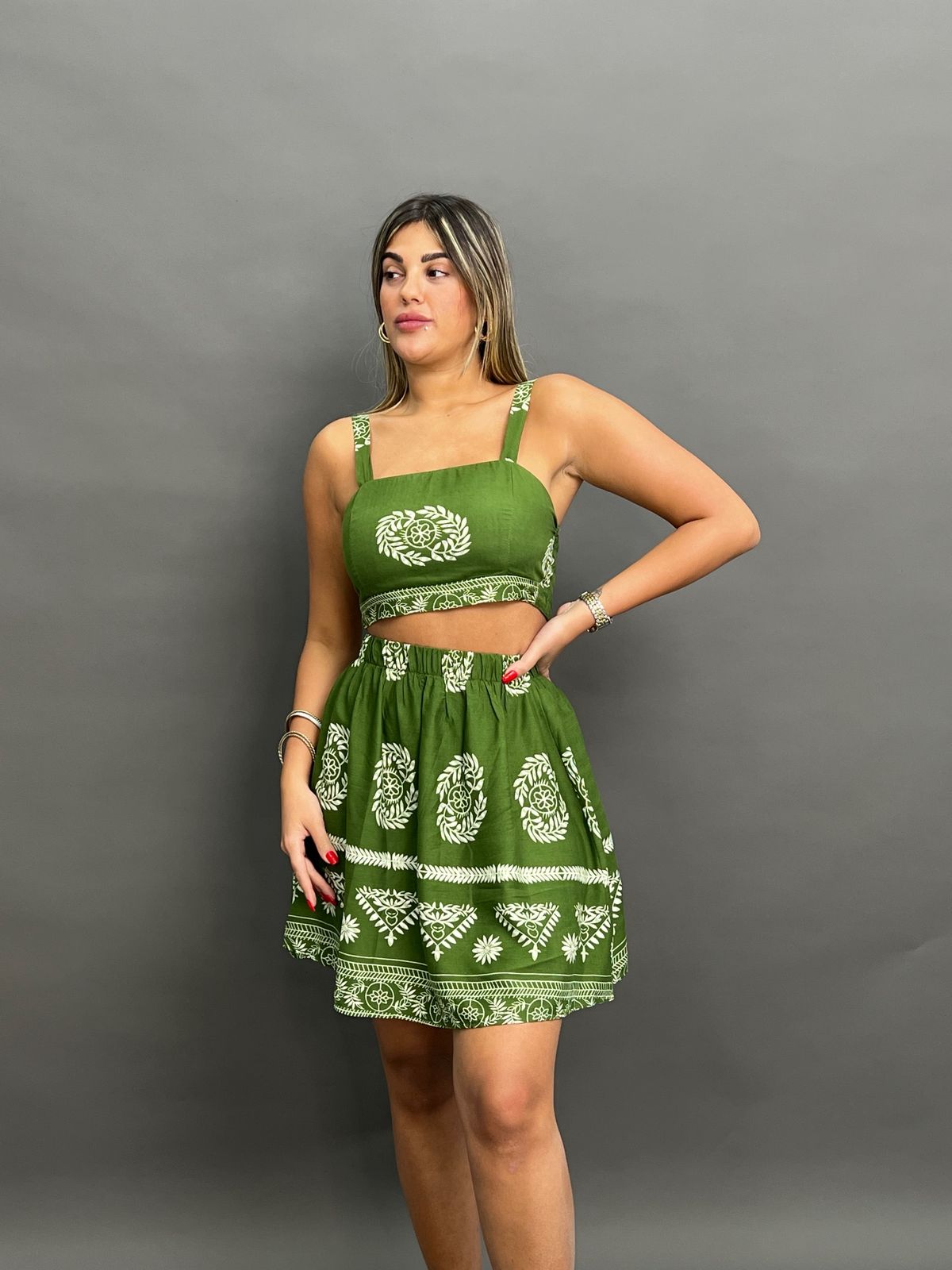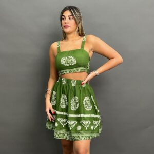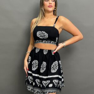 This stylish coordinated set features a cropped camisole top and a matching mini skirt, both adorned with an intricate, eye-catching print. Perfect for a unique and fashionable look.