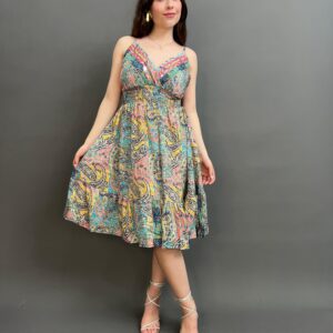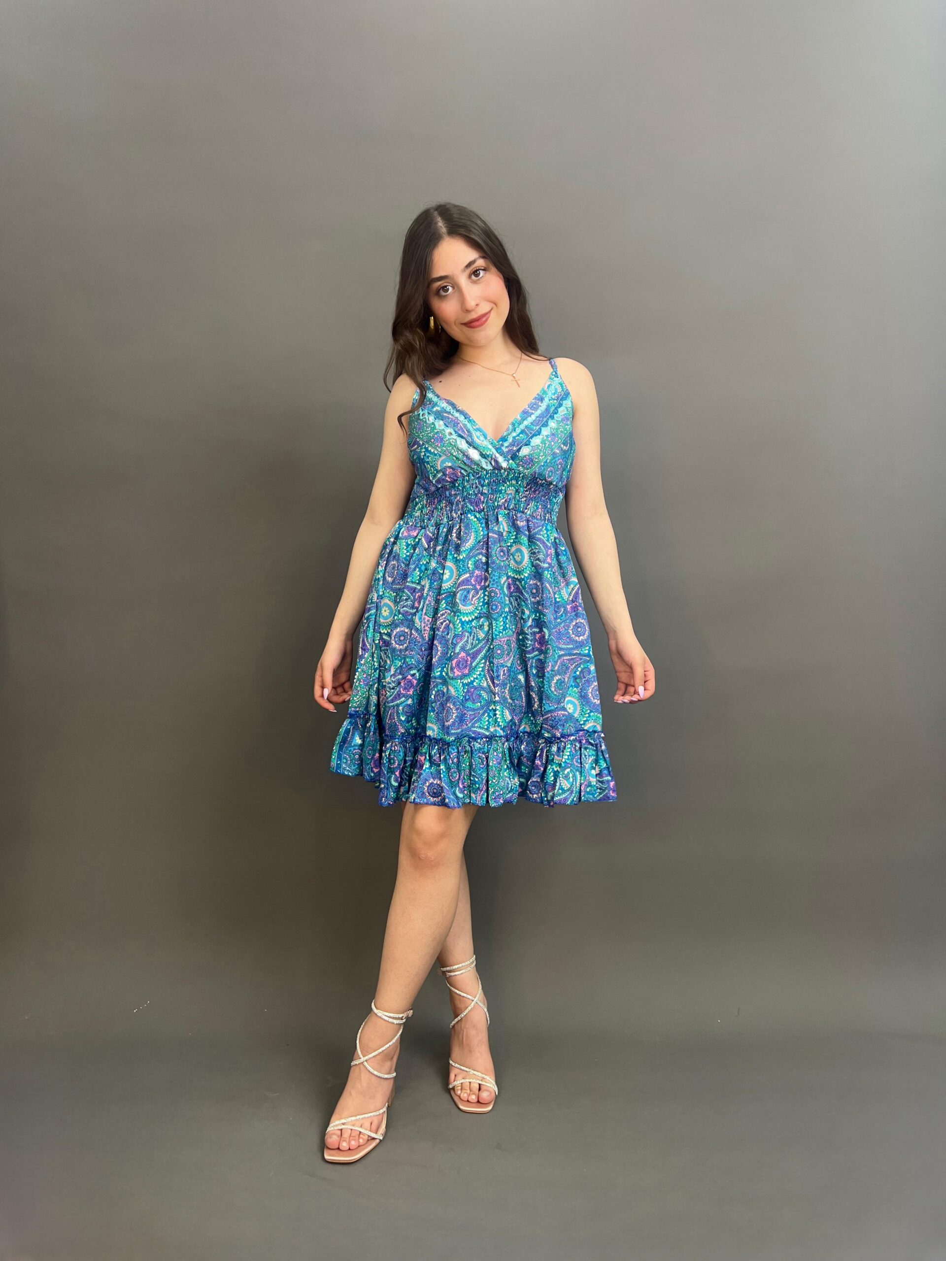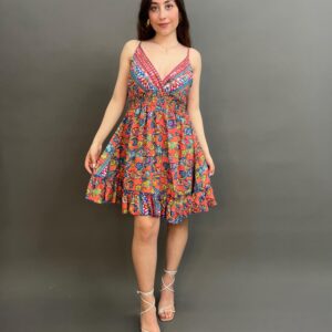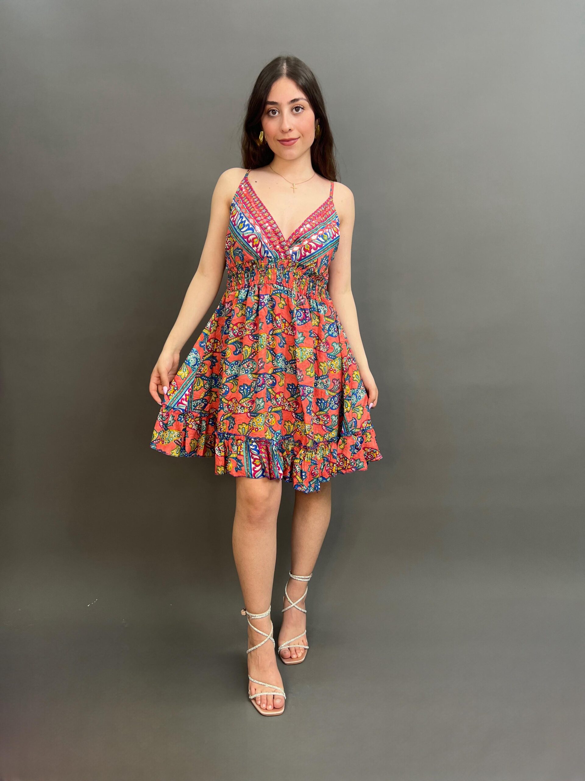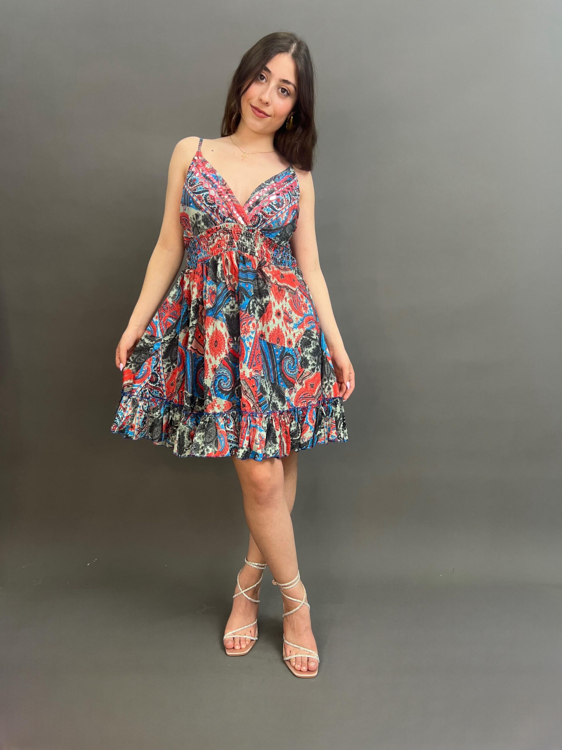 A breezy boho-inspired mini dress with a flattering V-neckline, smocked waist, and flared hem. Features a vibrant paisley print and adjustable straps for a comfortable, feminine fit. Perfect for sunny days and casual outings.