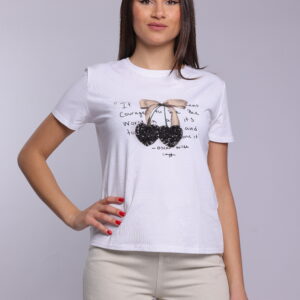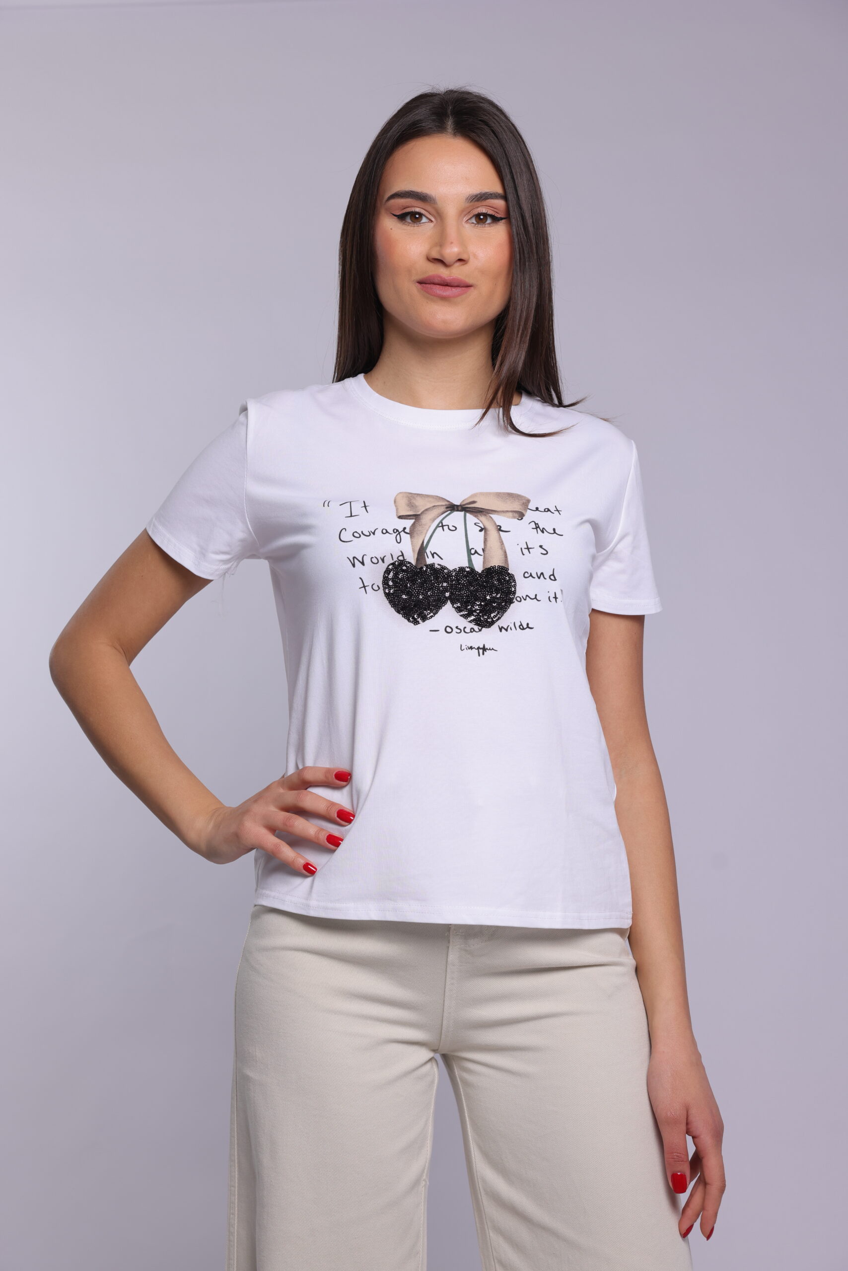 Effortlessly stylish with a touch of sparkle ✨ This graphic t-shirt features a statement bow design with shimmering sequin detail and an artistic quote print, giving it a chic yet casual vibe. Perfect for elevating your everyday outfits with a subtle statement.