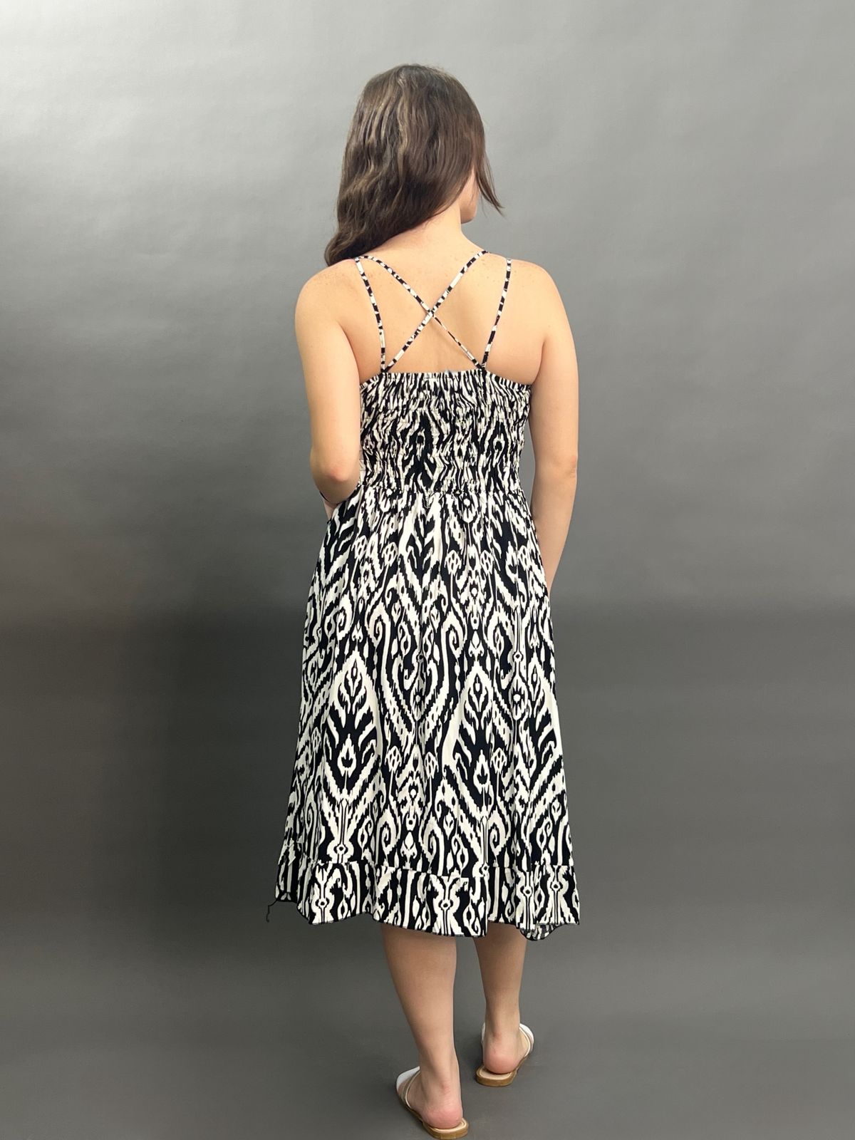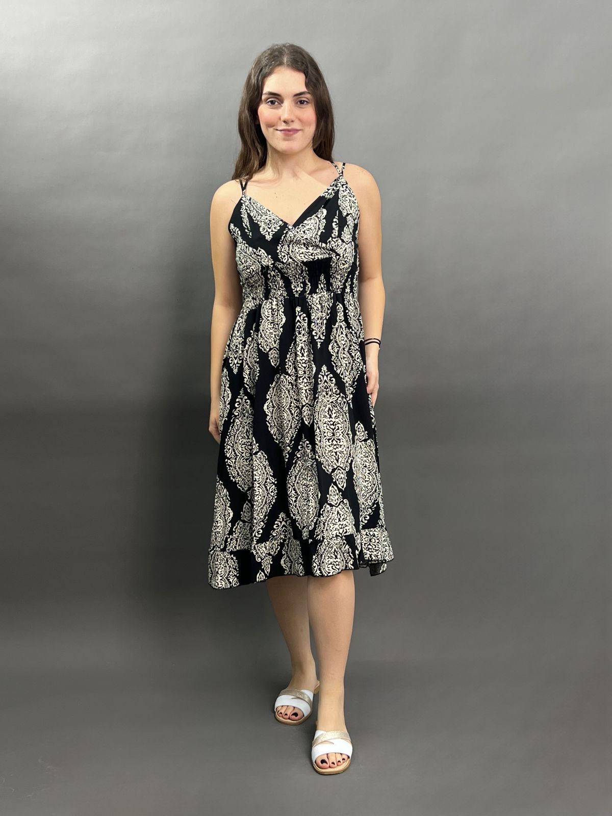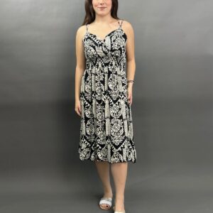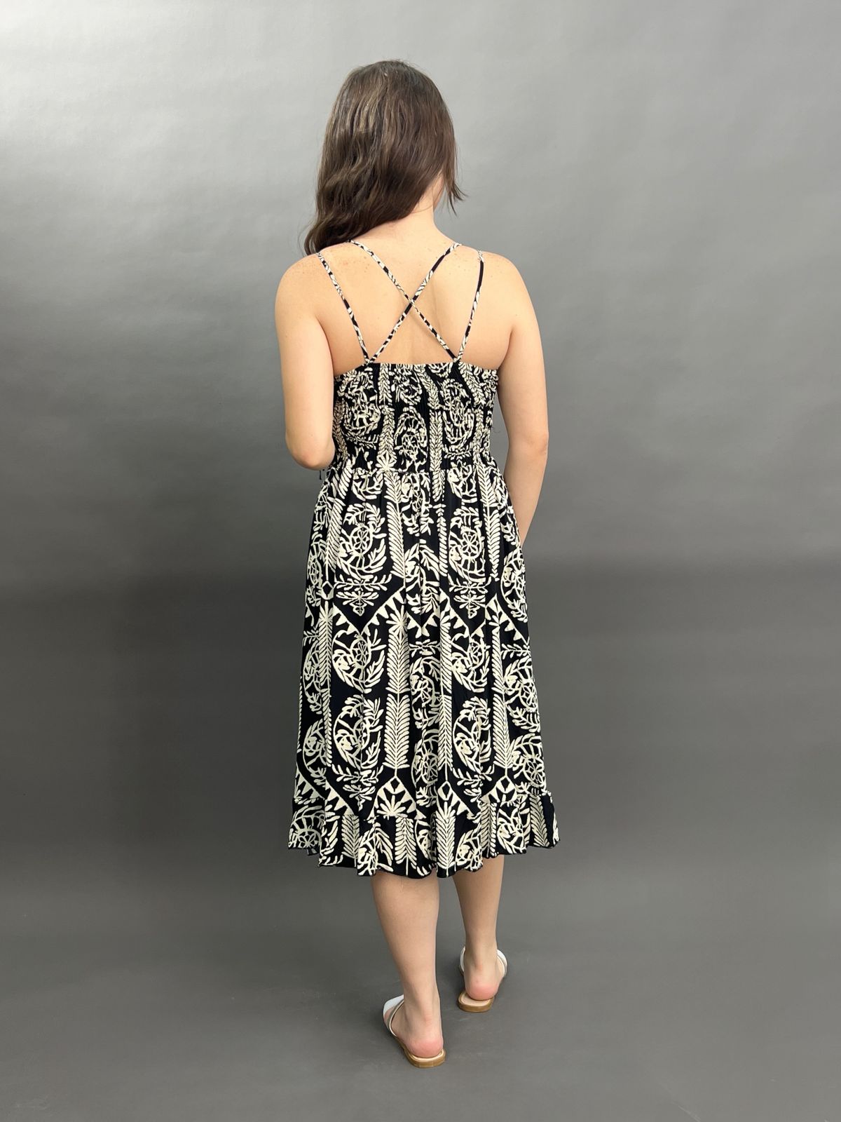 This charming midi dress features delicate spaghetti straps and a ruched bodice, leading to a flowing skirt that falls gracefully to the knee. Adorned with an intricate, global-inspired print, it’s a perfect choice for effortless style and comfort.