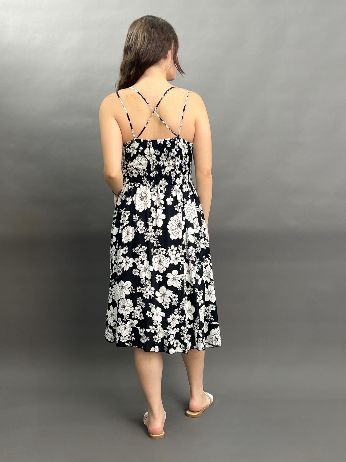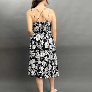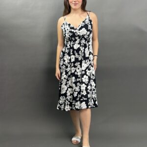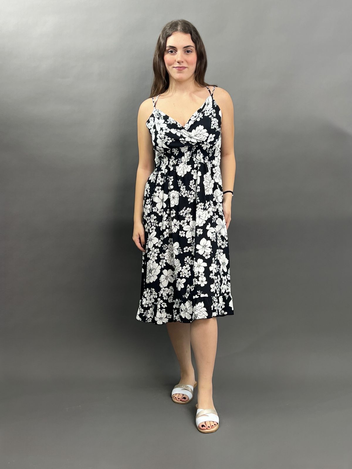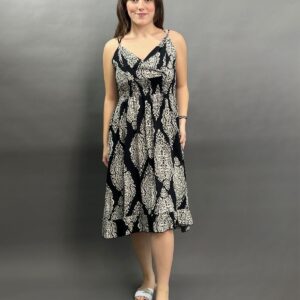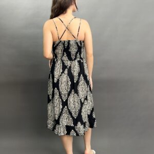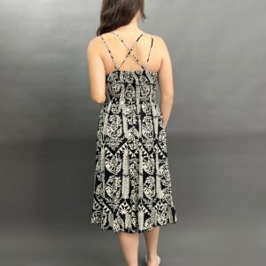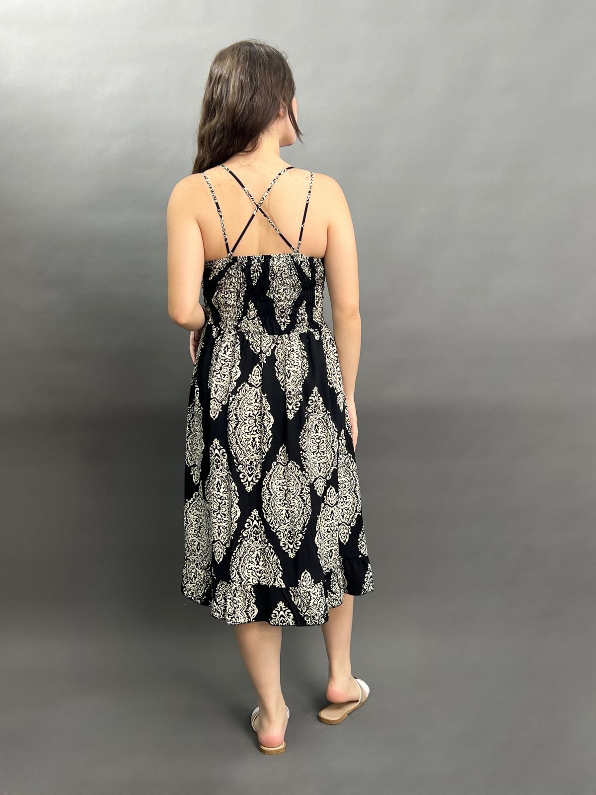 This charming midi dress features delicate spaghetti straps and a ruched bodice, leading to a flowing skirt that falls gracefully to the knee. Adorned with an intricate, global-inspired print, it’s a perfect choice for effortless style and comfort.