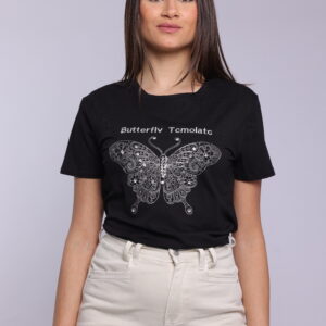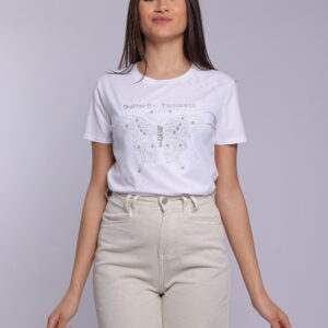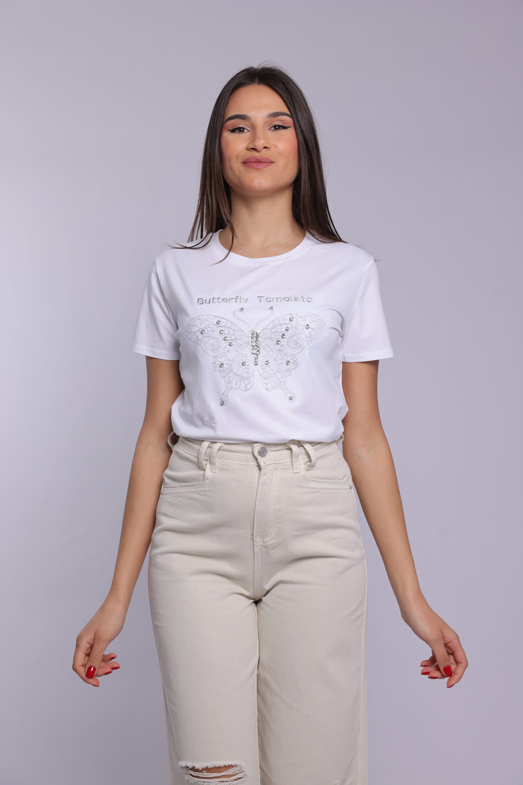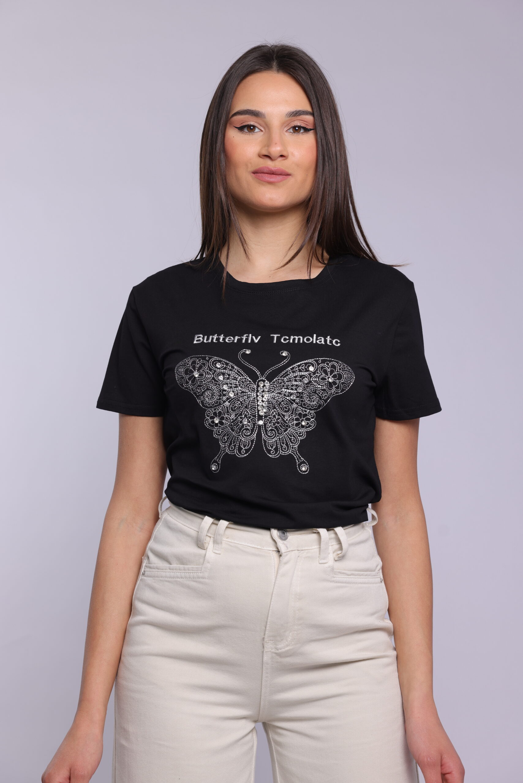 Elegant with a sparkling twist ✨ This statement t-shirt features a beautifully detailed butterfly design embellished with shimmering rhinestones. Feminine, eye-catching, and easy to style, it’s the perfect piece to elevate your everyday casual look.