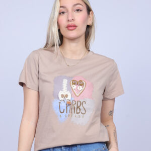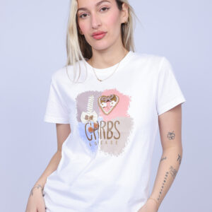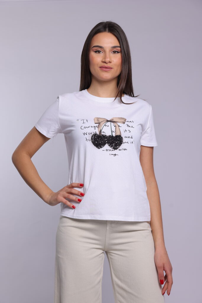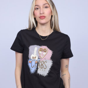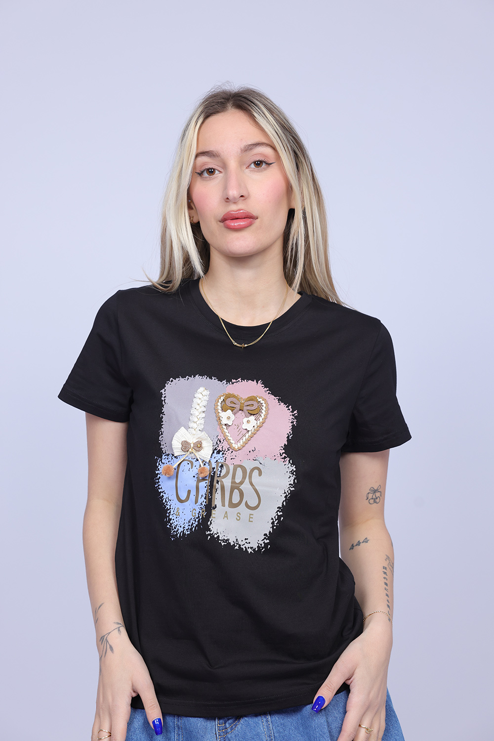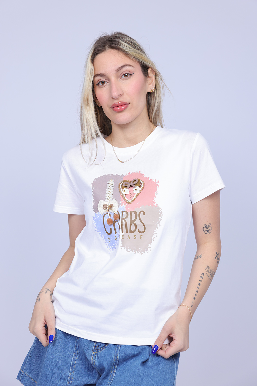 A stylish and playful T-shirt featuring a bold graphic design with decorative textured elements that add dimension and personality. The mix of artistic print and embellished details creates a unique fashion-forward look, making it a standout piece for casual outfits. Perfect for everyday wear, this T-shirt adds a fun and trendy touch to your wardrobe.