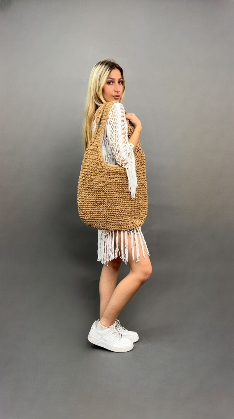 This spacious tote bag features a tightly woven texture and horizontal stripe detailing, designed with a slouchy, relaxed silhouette.