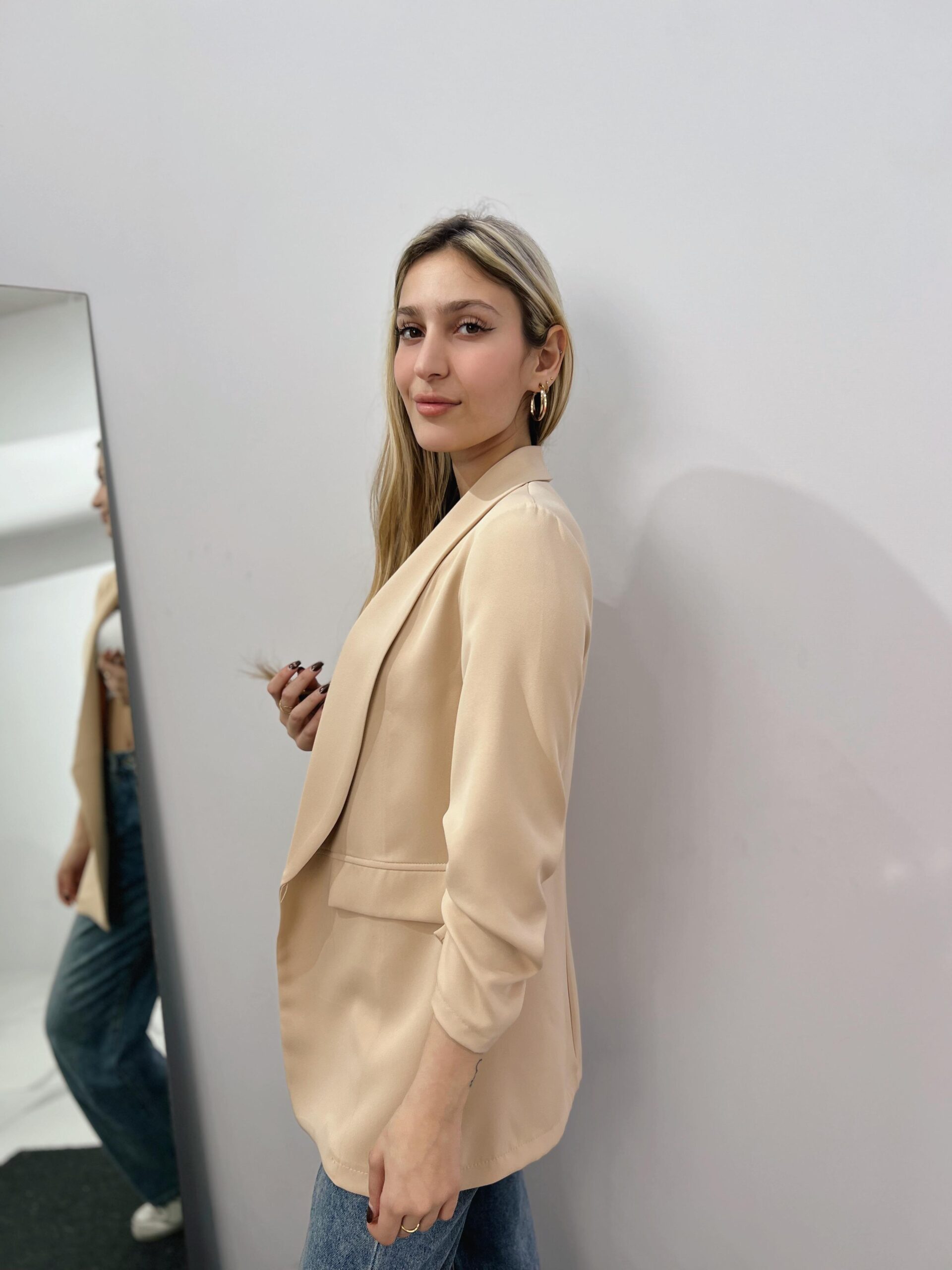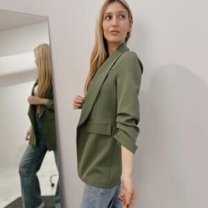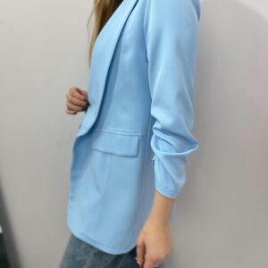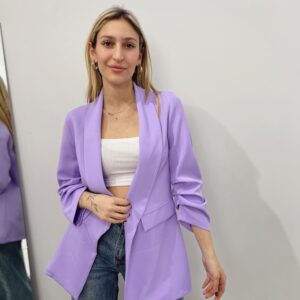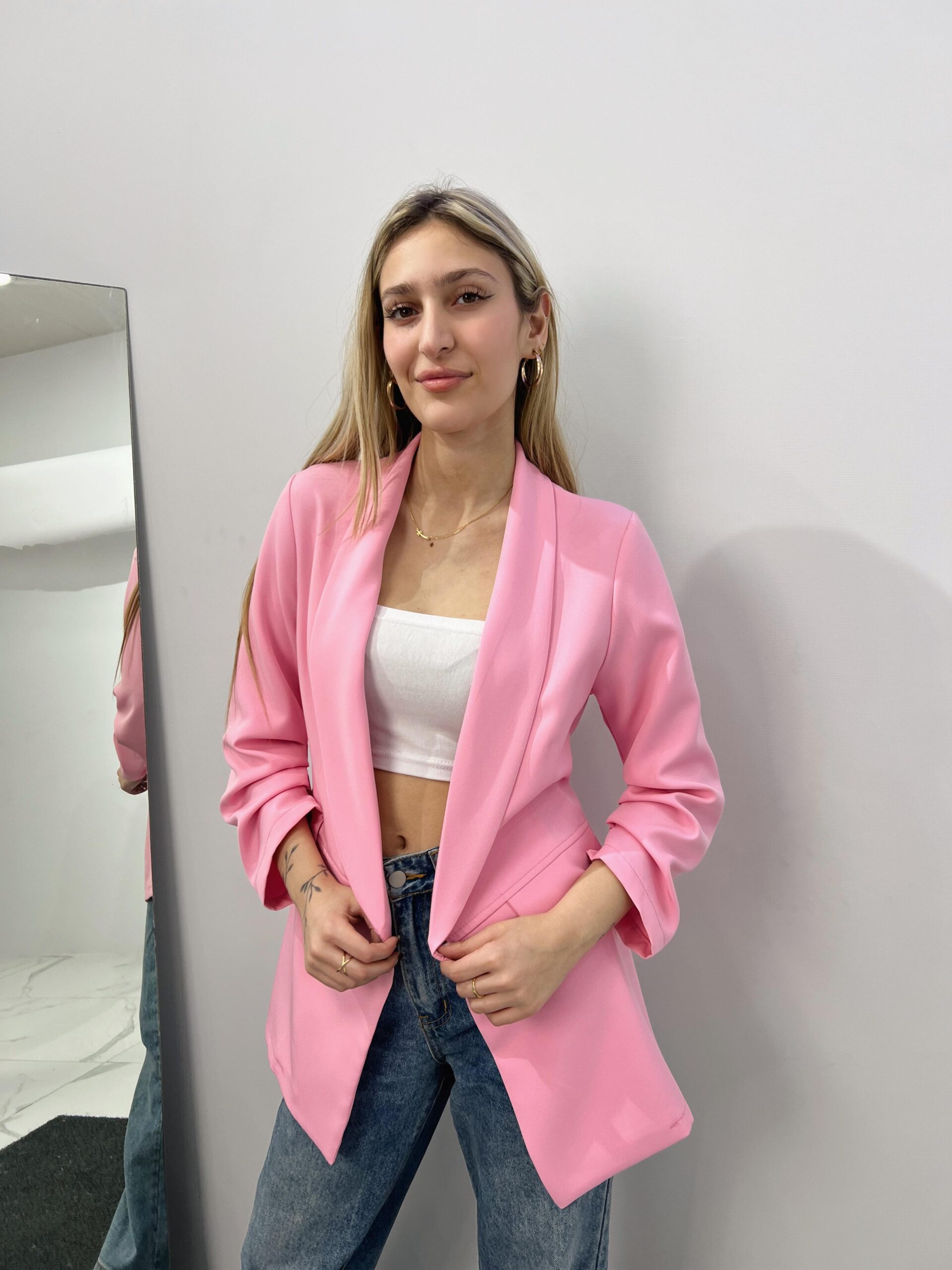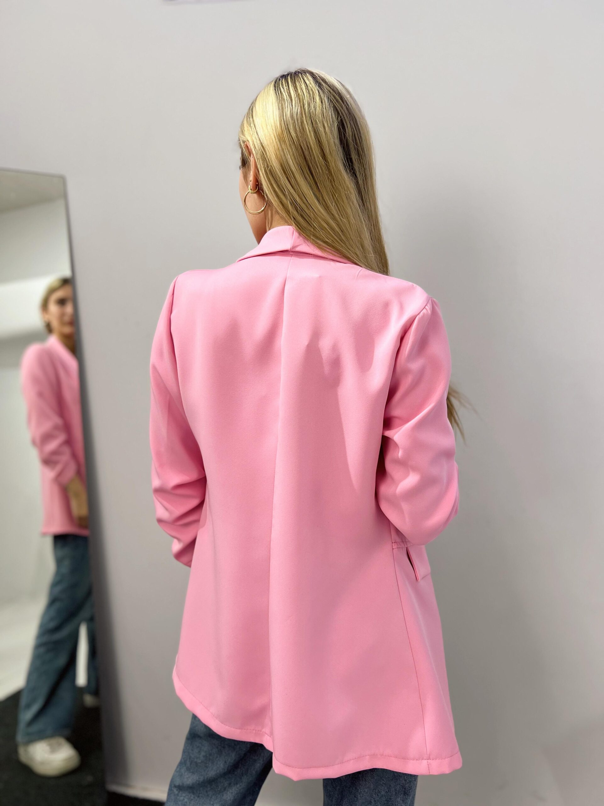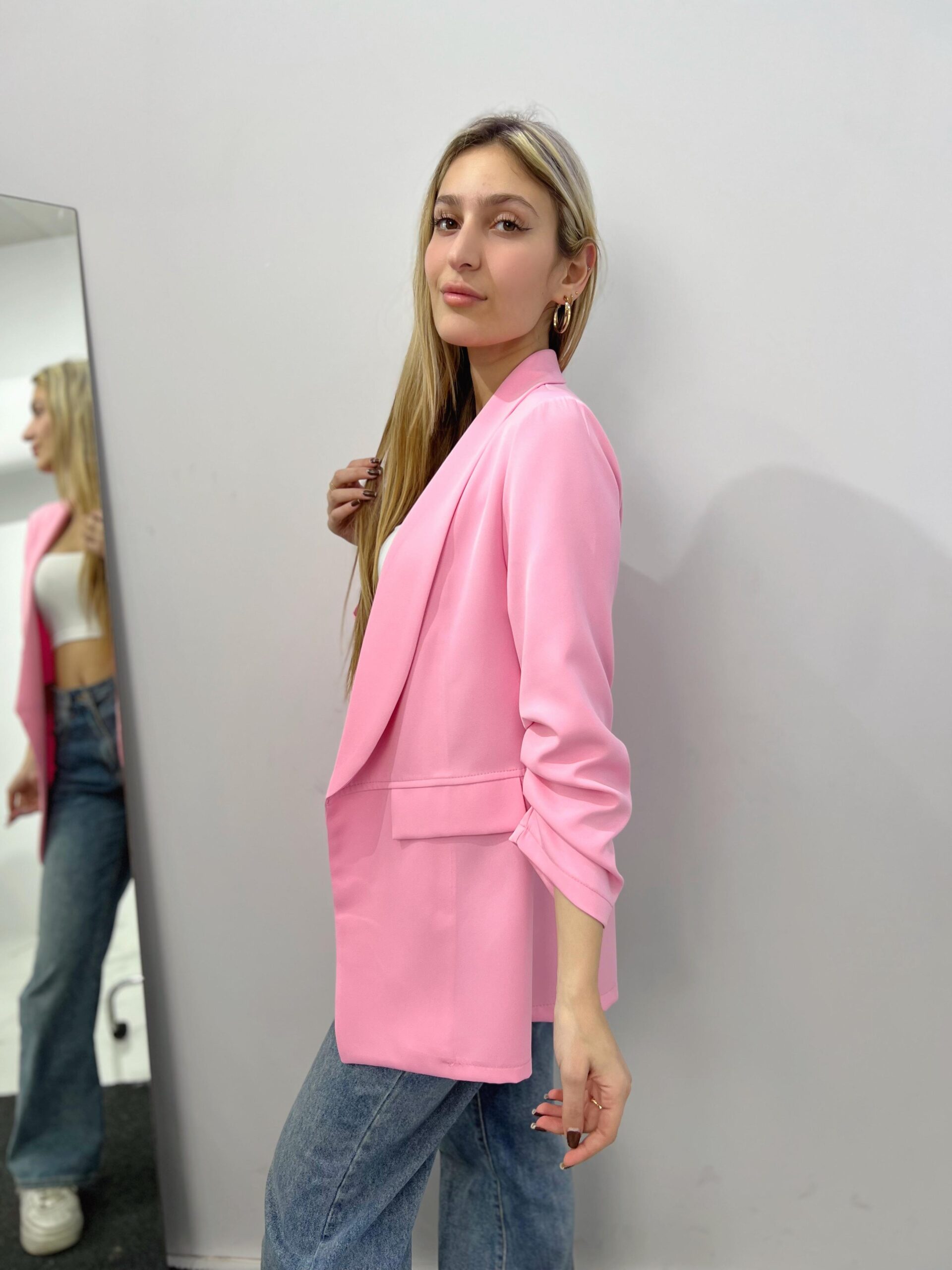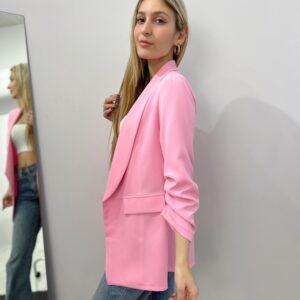 This elegant pink blazer features a tailored fit, draped open front, ruched sleeves, and stylish flap pocket details. Its high-quality fabric makes it perfect for both casual and formal looks.
