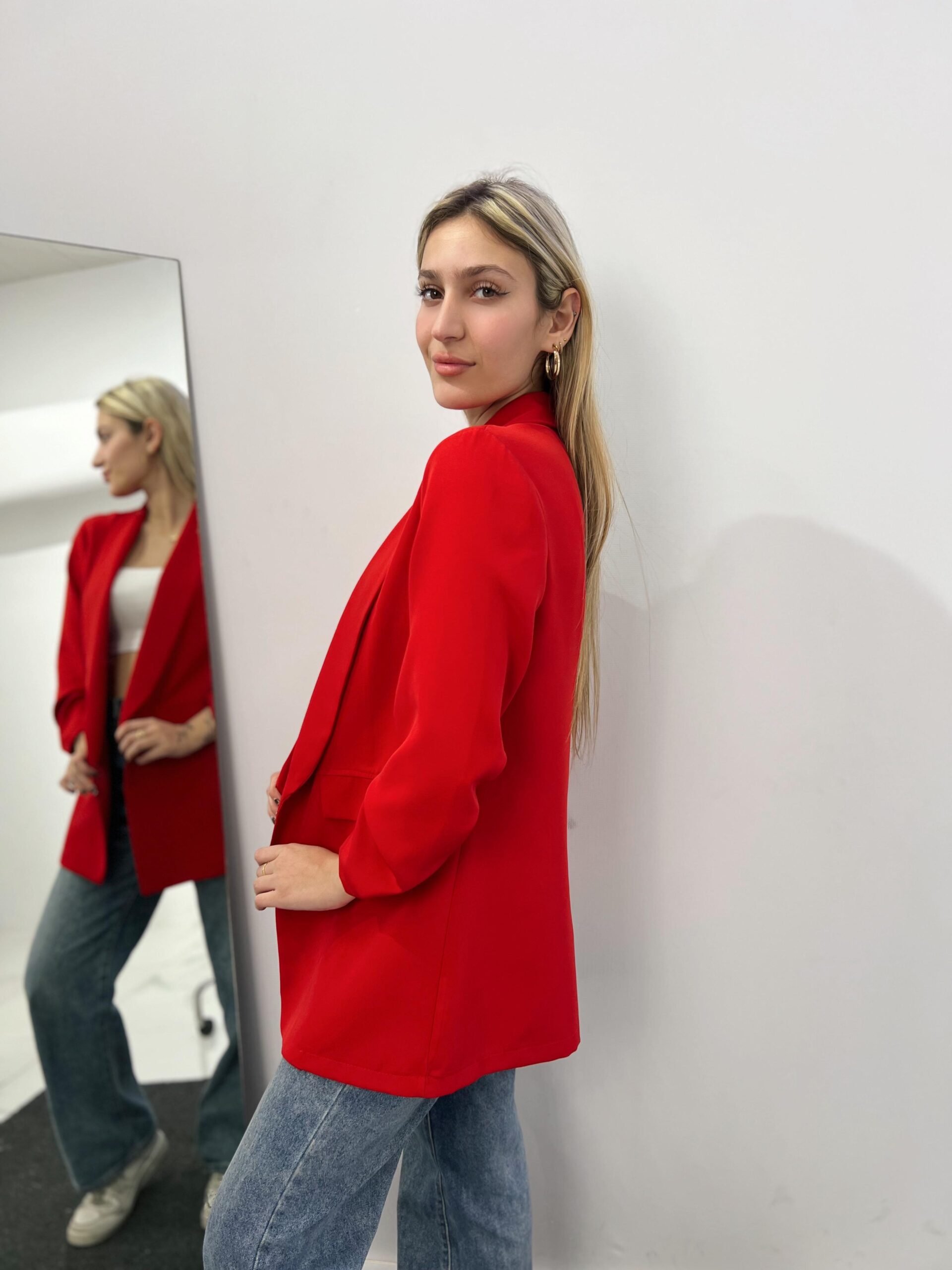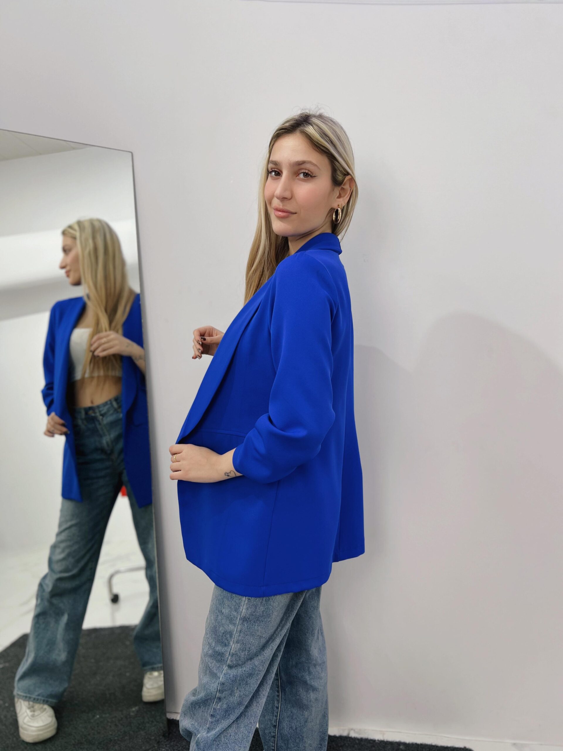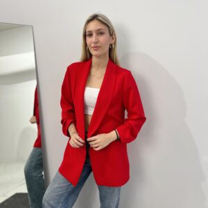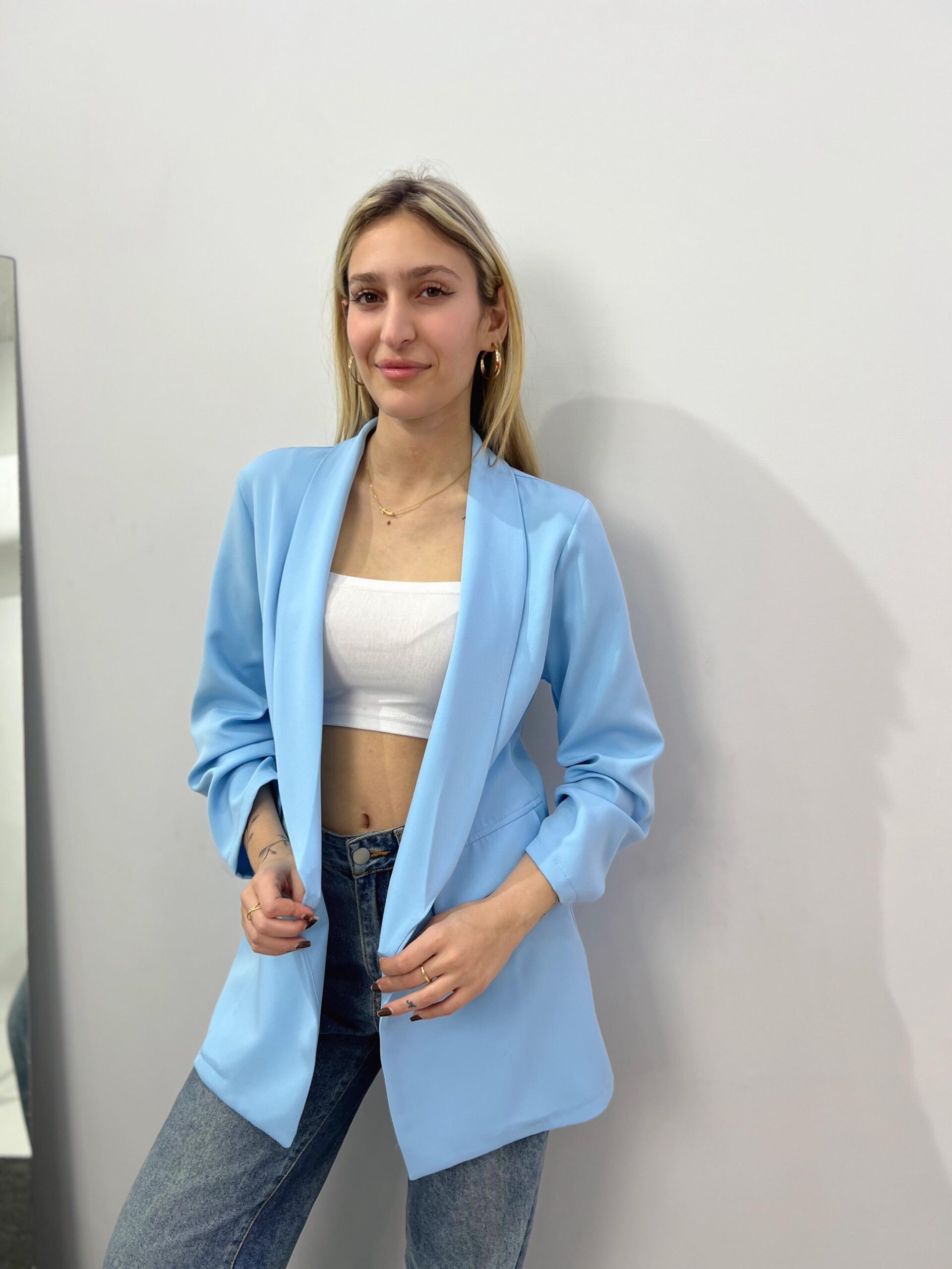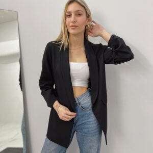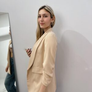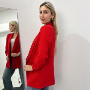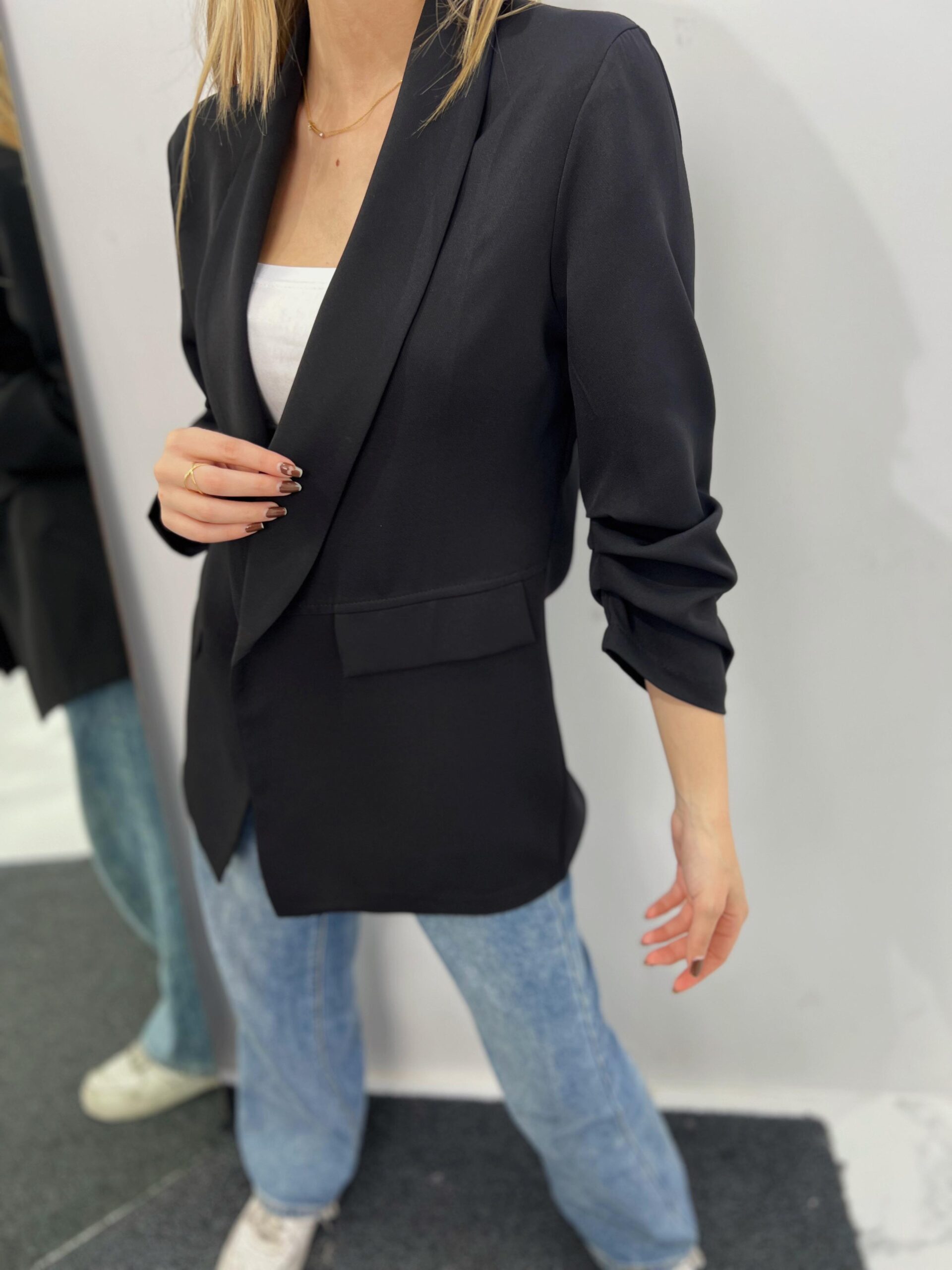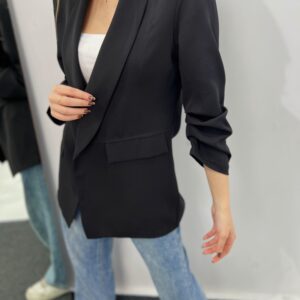 This elegant pink blazer features a tailored fit, draped open front, ruched sleeves, and stylish flap pocket details. Its high-quality fabric makes it perfect for both casual and formal looks.