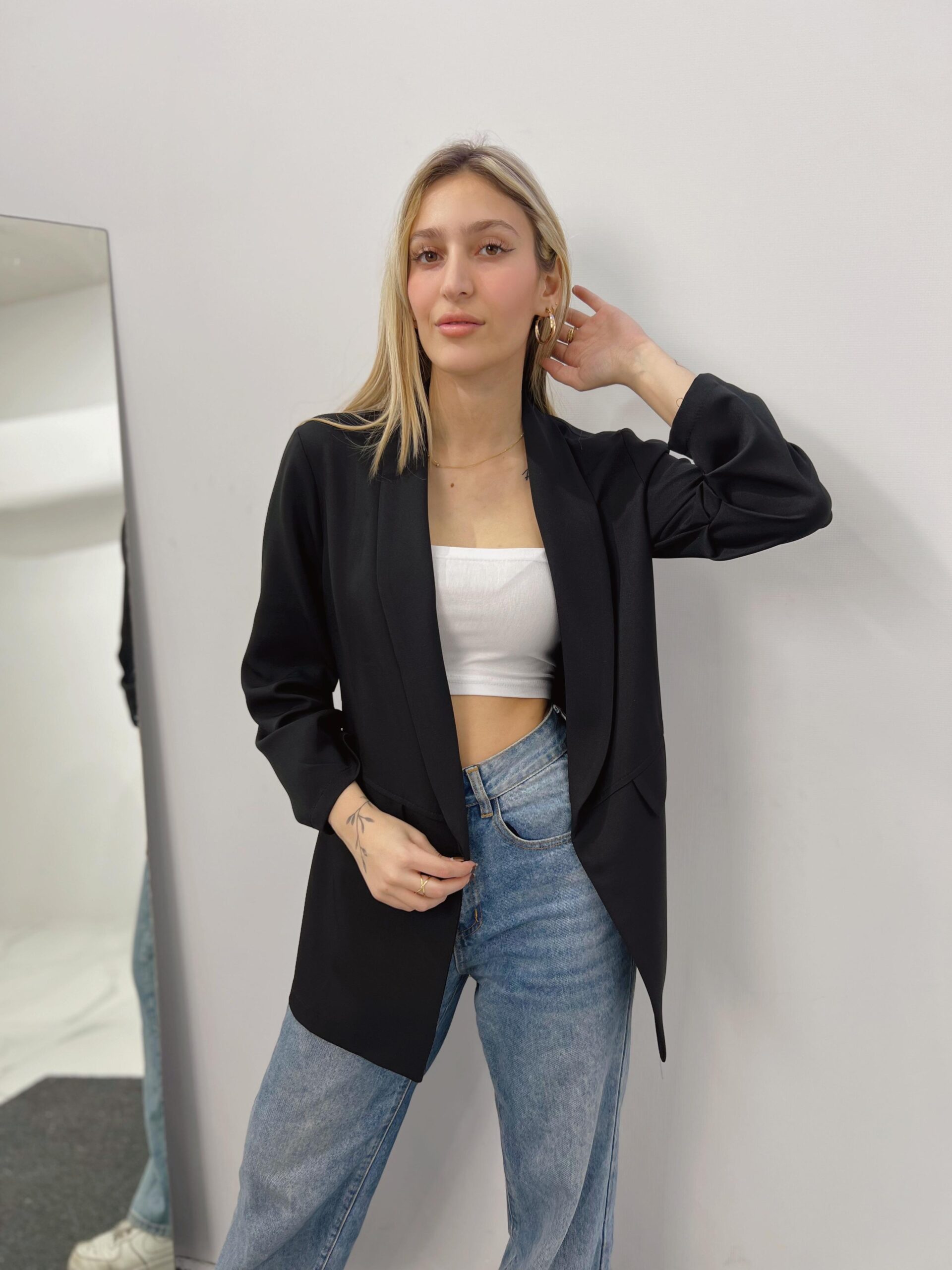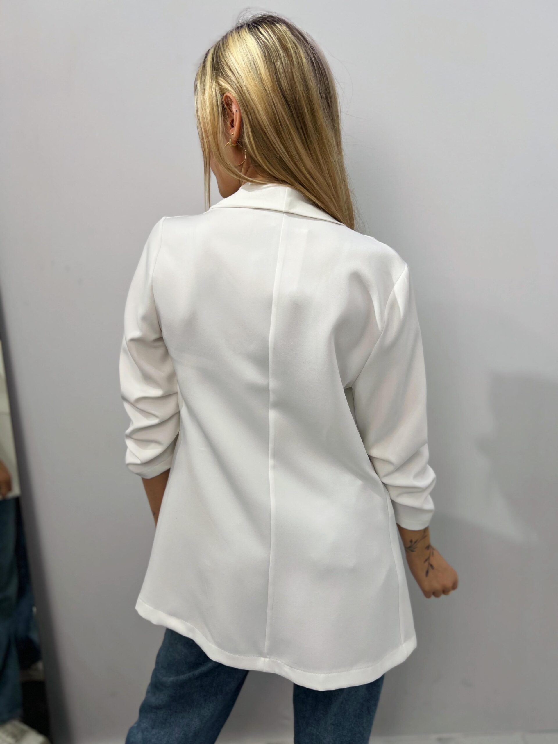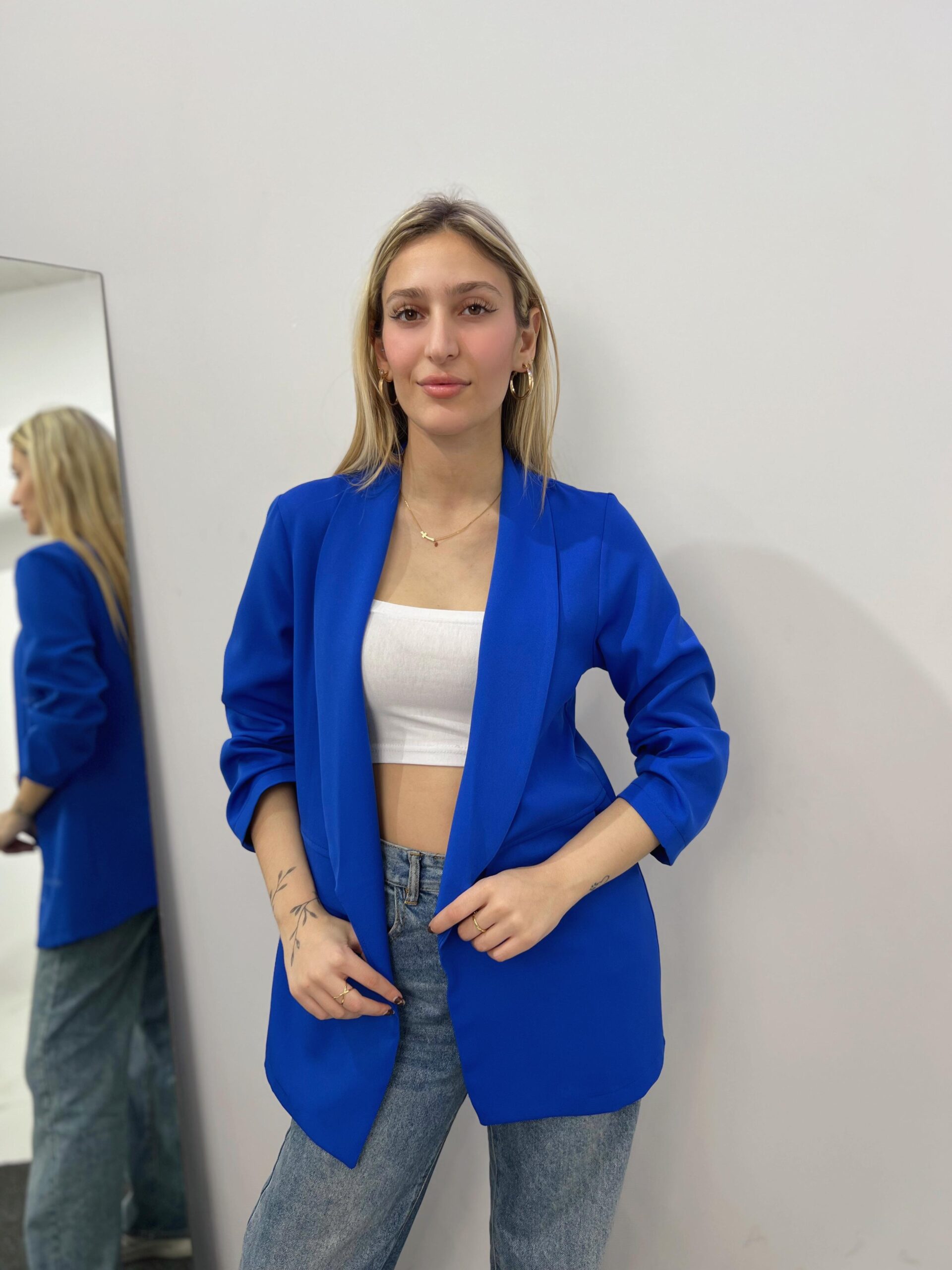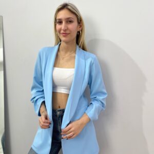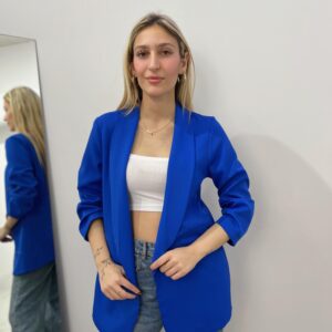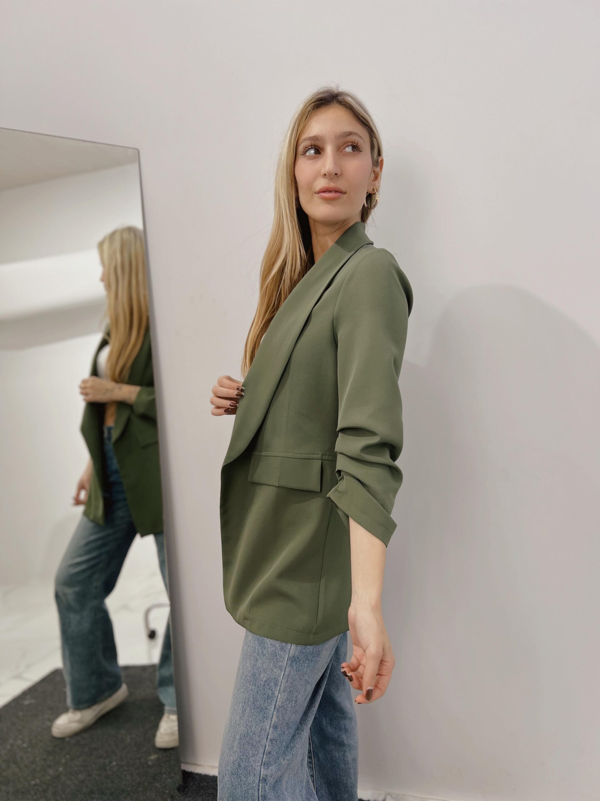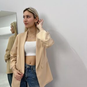 This elegant pink blazer features a tailored fit, draped open front, ruched sleeves, and stylish flap pocket details. Its high-quality fabric makes it perfect for both casual and formal looks.