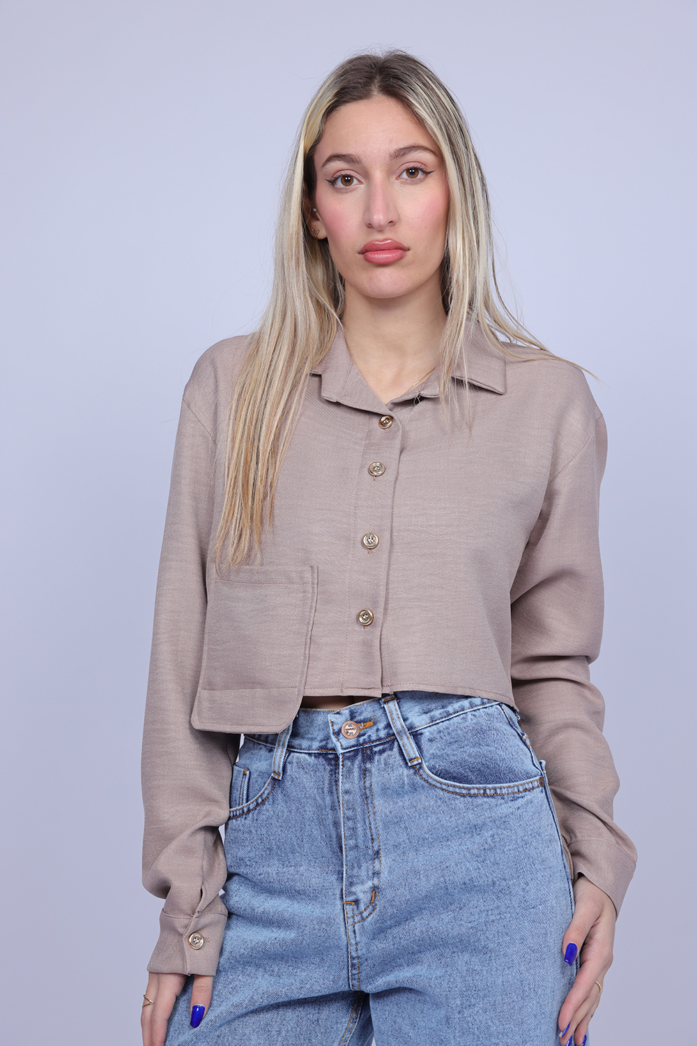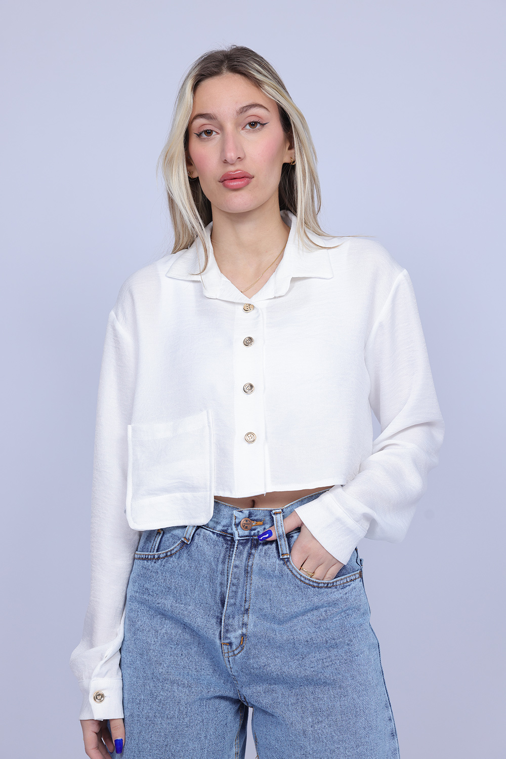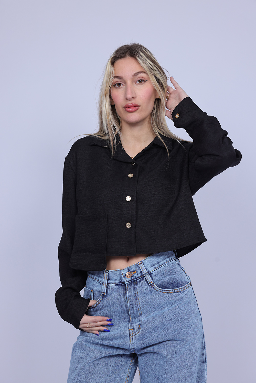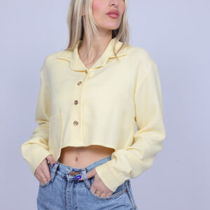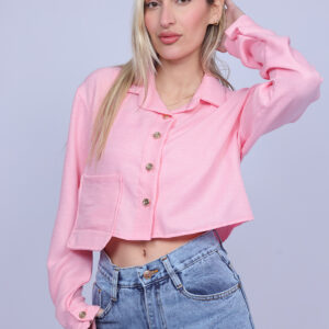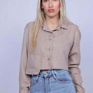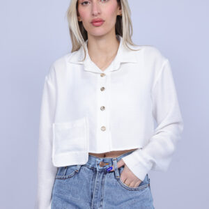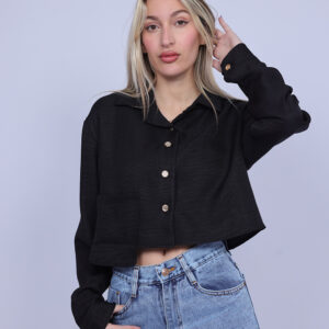 A stylish cropped shirt designed with a classic collar and front button closure for a modern yet timeless look. The lightweight fabric and relaxed silhouette create a comfortable fit, making it perfect for both casual and semi-dressy outfits. This versatile piece can be paired easily with high-waisted jeans, skirts, or tailored pants for an effortless everyday style.