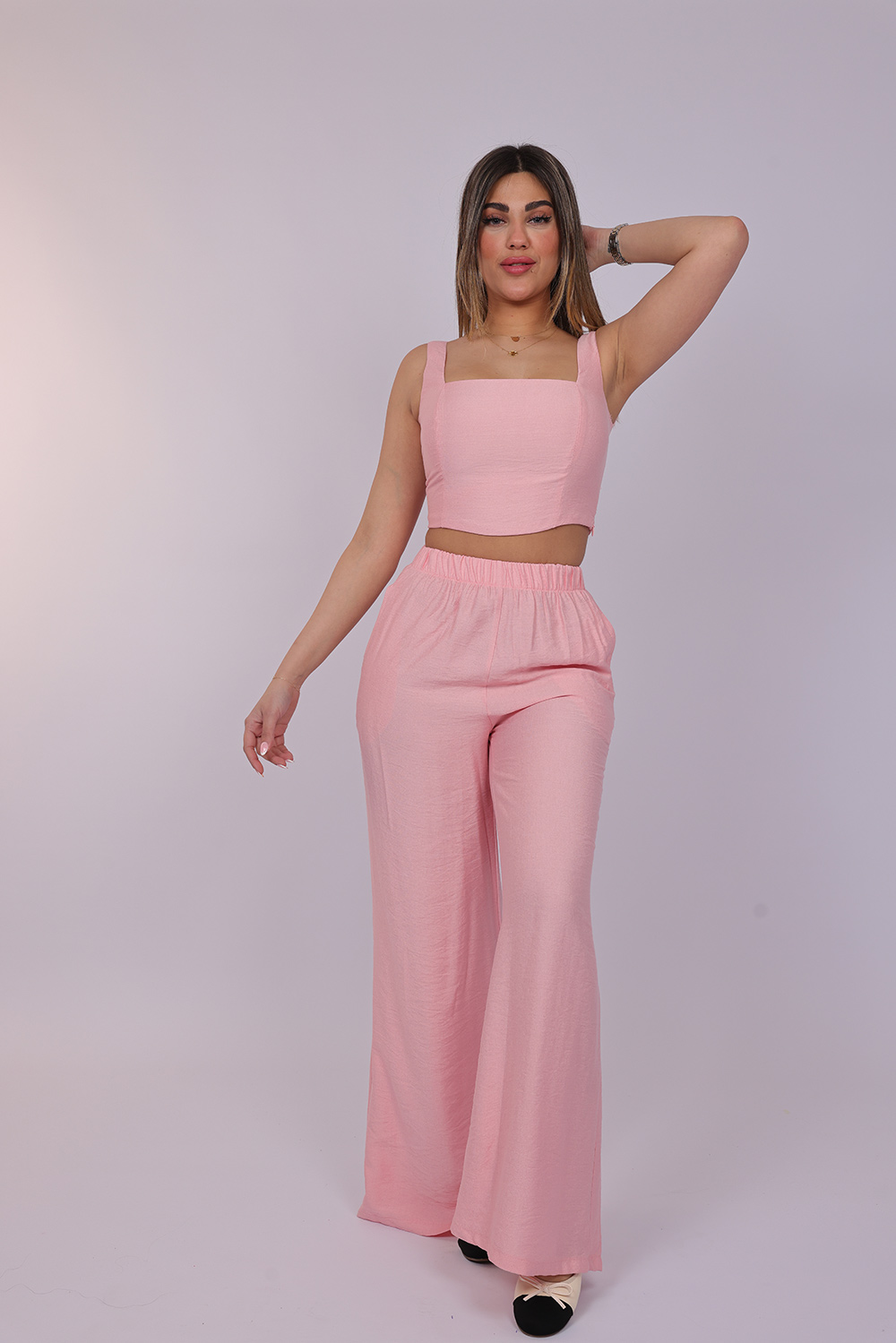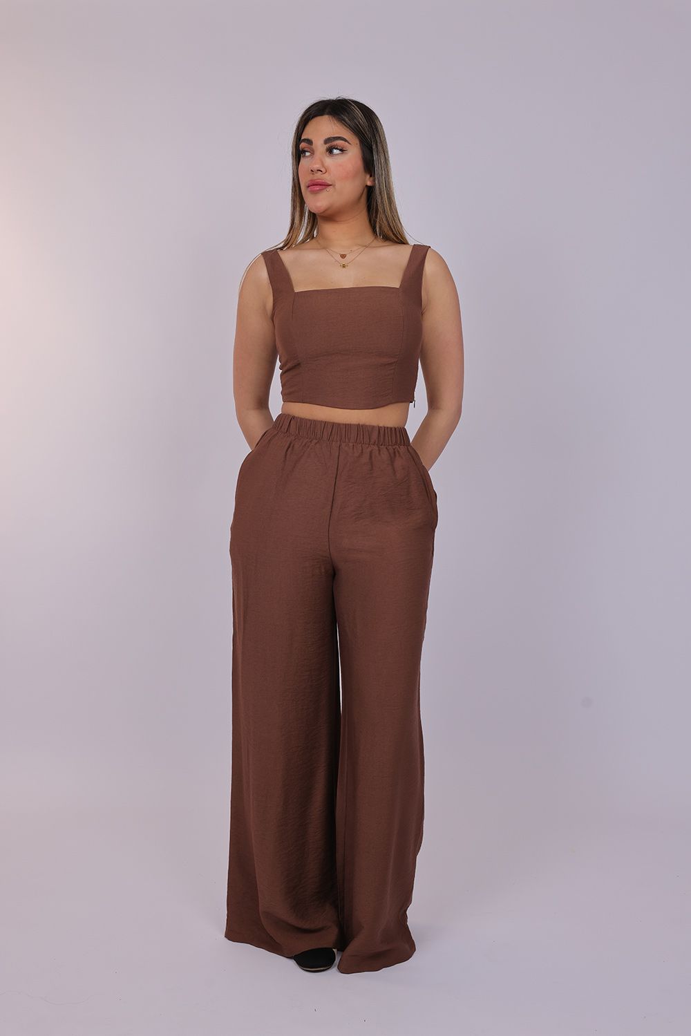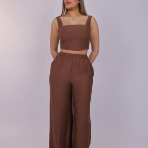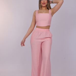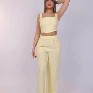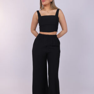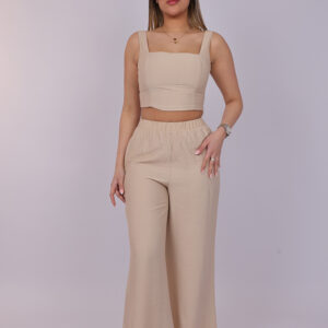 A chic two-piece set designed with a modern cropped top and flowing wide-leg pants. The structured square neckline and sleeveless design create a flattering and elegant look, while the high-waisted pants offer comfort with a relaxed silhouette. This stylish matching set is perfect for casual outings, summer events, or effortless everyday fashion.