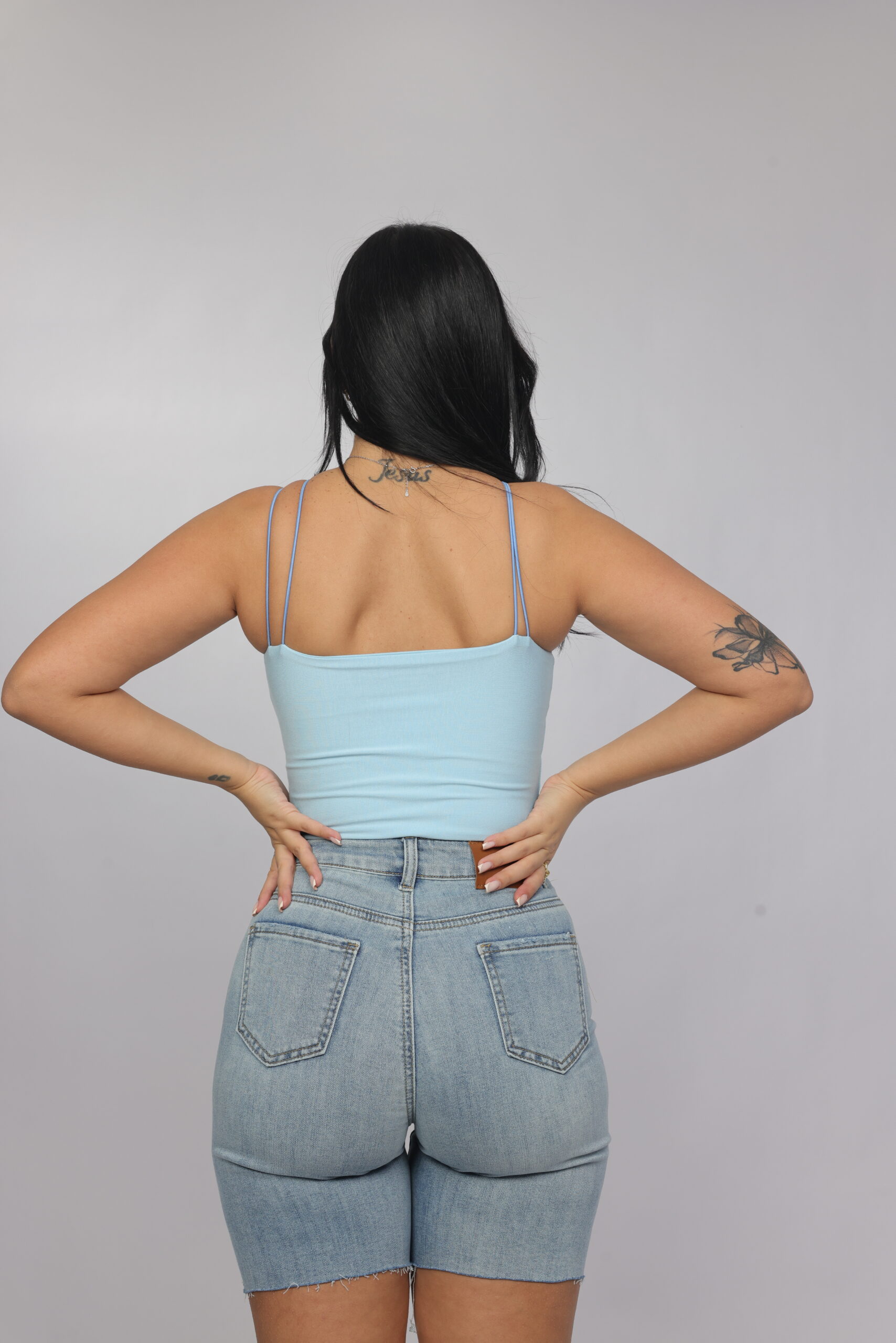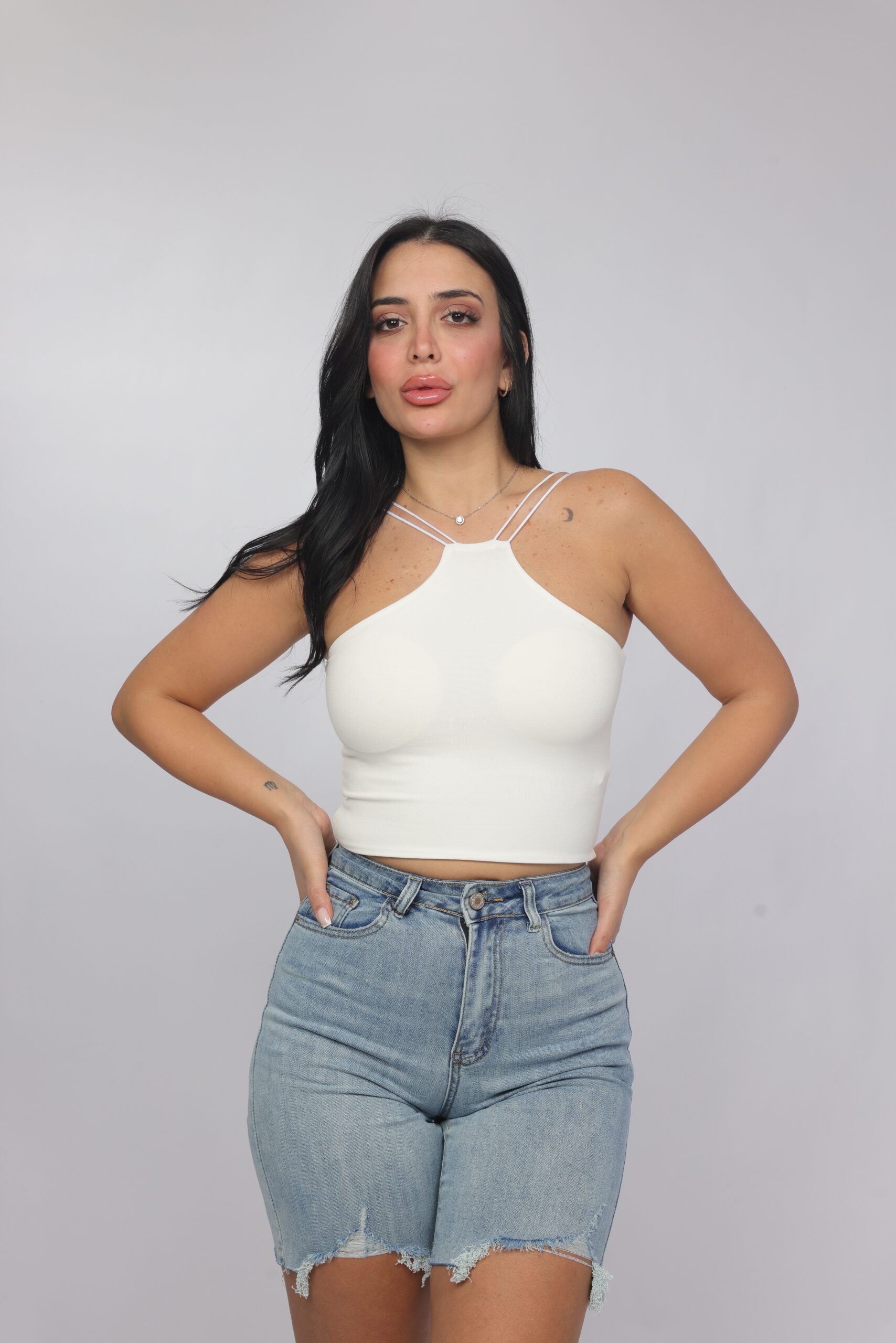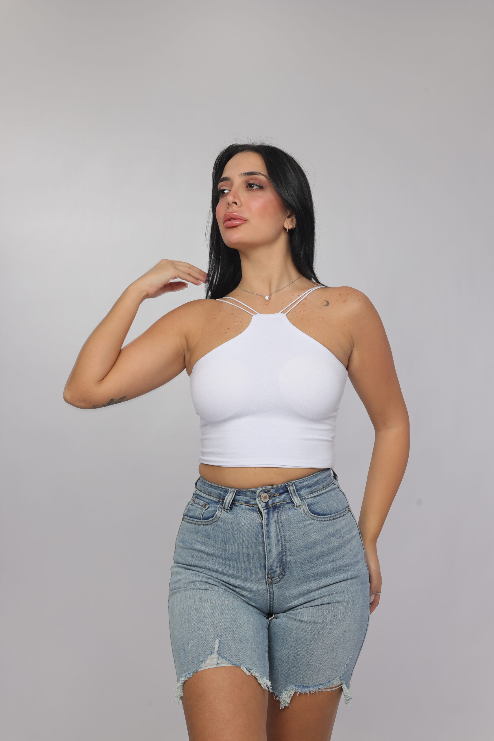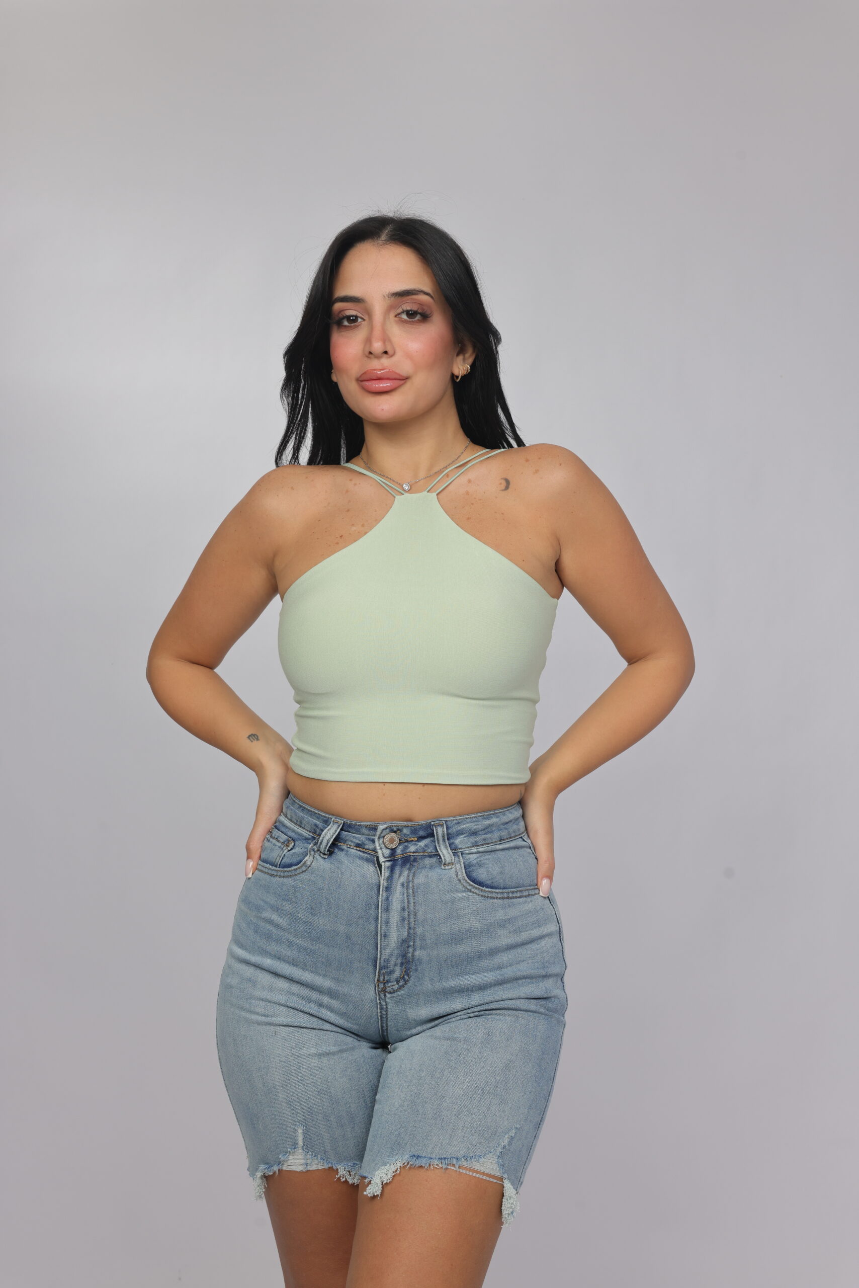 Elevate your summer essentials with this sleek cross-strap halter crop top. Designed with a high neckline and delicate double straps that frame the shoulders beautifully, this piece delivers a modern, flattering silhouette. The fitted cut enhances the shape while keeping the look minimal and chic — perfect for pairing with denim, skirts, or high-waisted trousers.