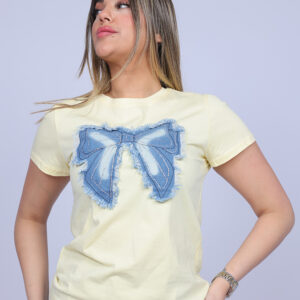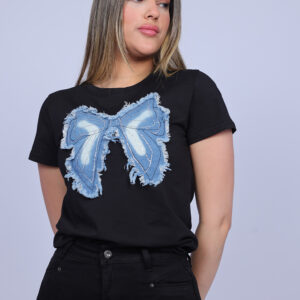 A chic and playful T-shirt designed with a large statement bow patch that adds texture and personality to a casual piece. The layered denim-style bow with decorative stitching and frayed edges creates a unique handcrafted look that stands out effortlessly. Perfect for elevating everyday outfits with a stylish feminine touch.