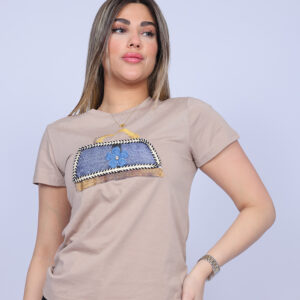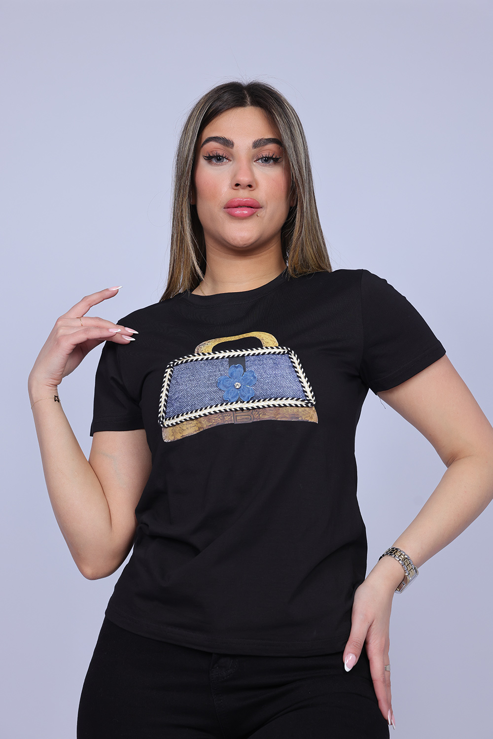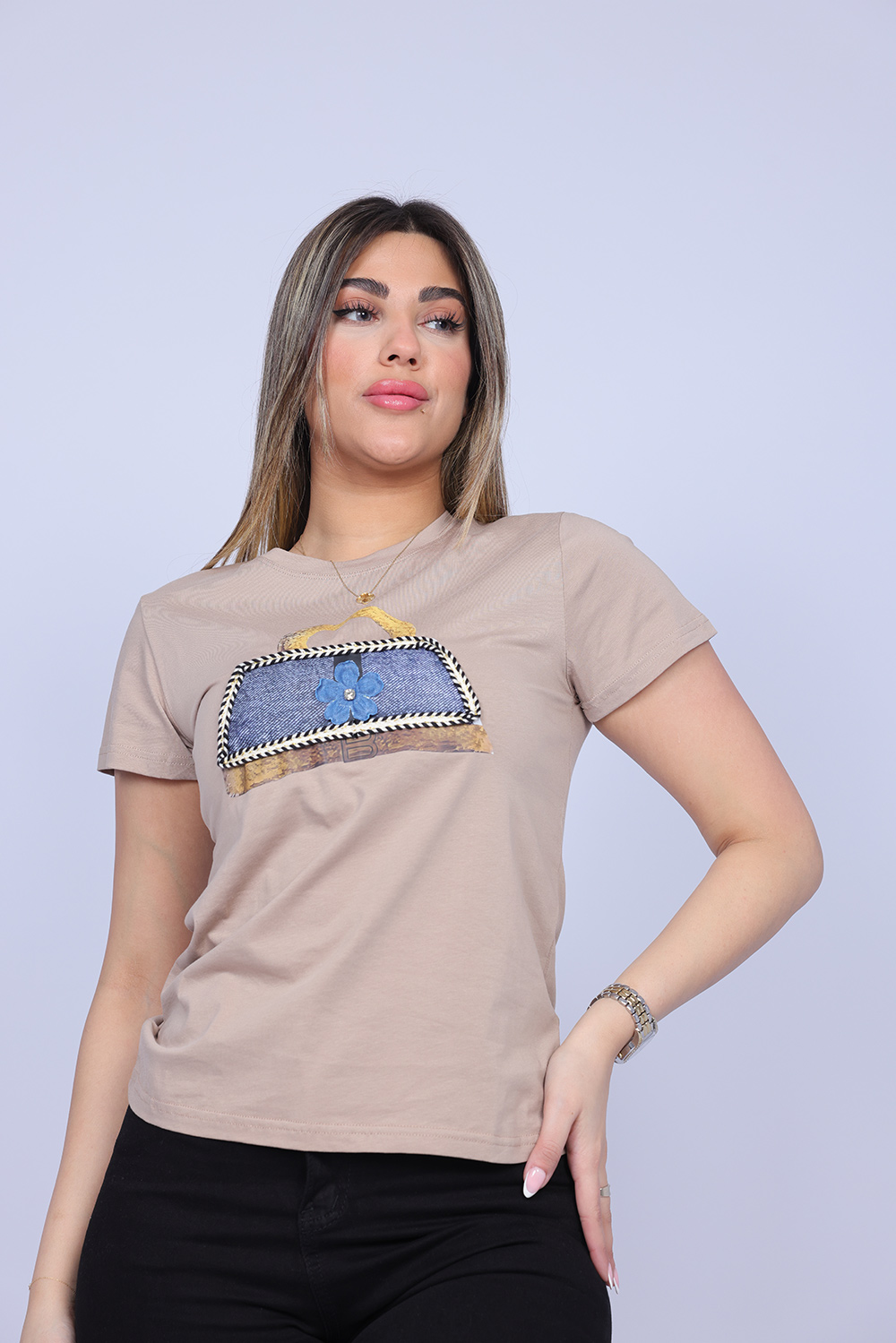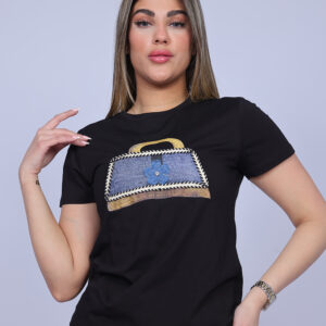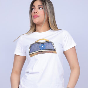 A trendy T-shirt featuring a stylish handbag-inspired graphic with textured denim-style detailing and decorative accents. The design blends playful fashion elements with a modern casual look, making it a standout piece for everyday outfits. Perfect for adding a fashionable touch to a relaxed style.