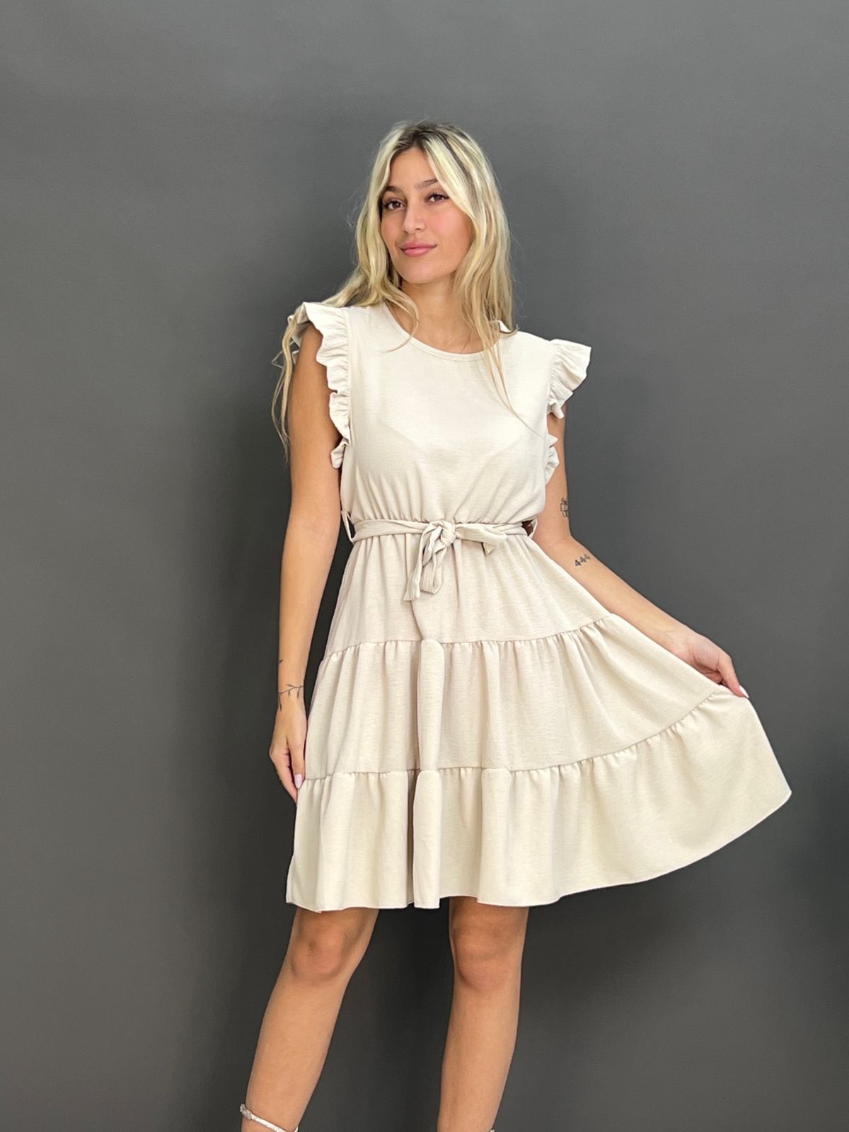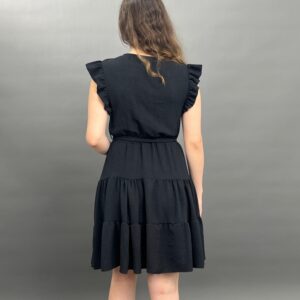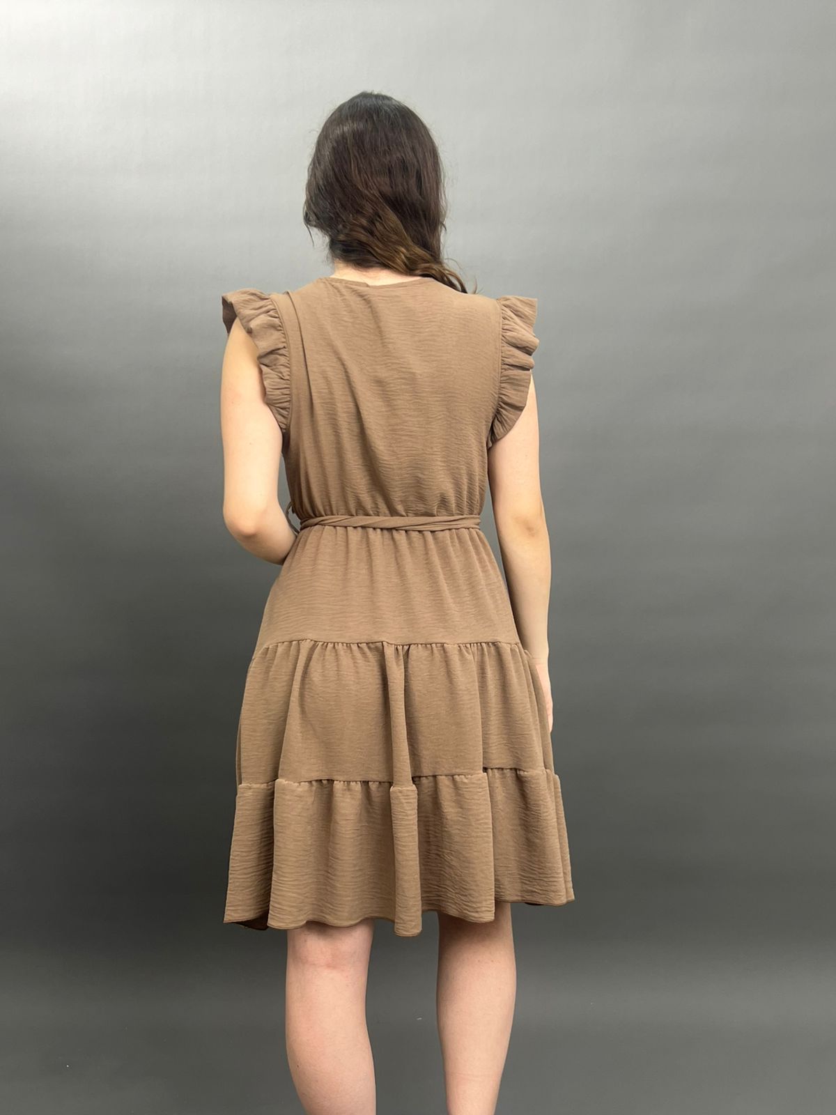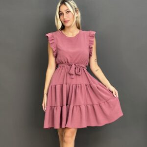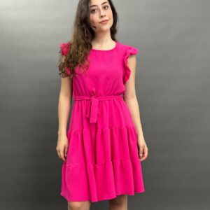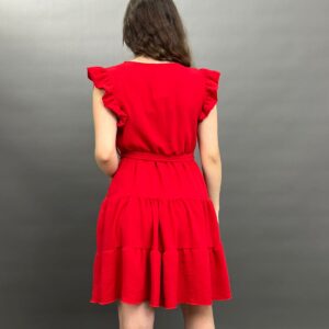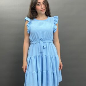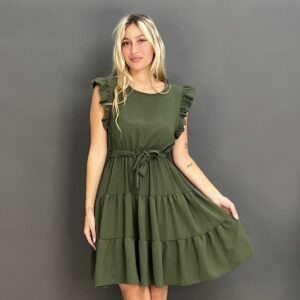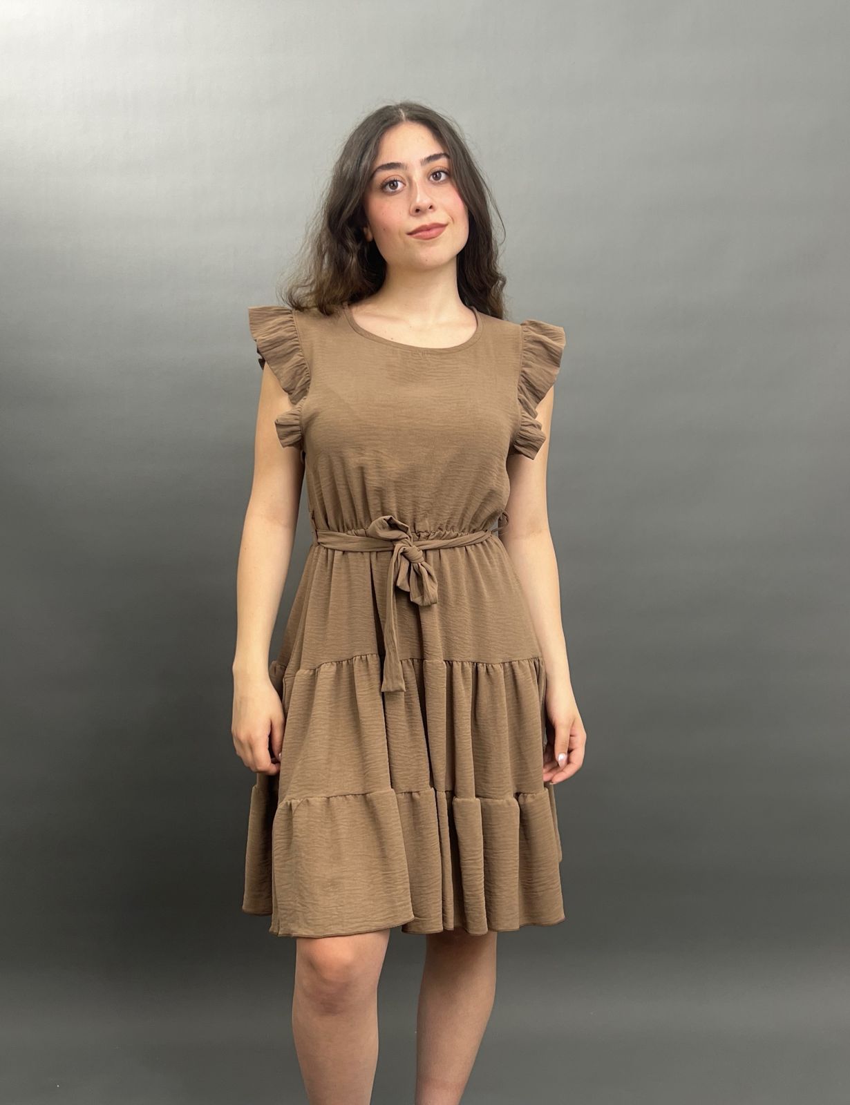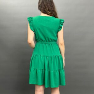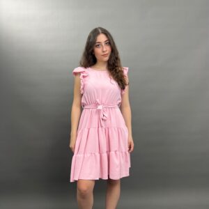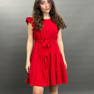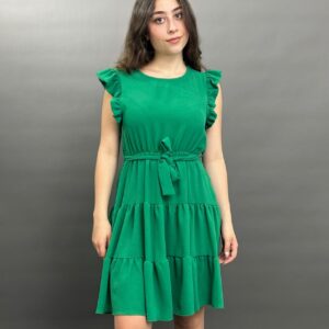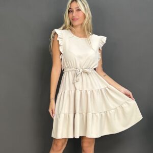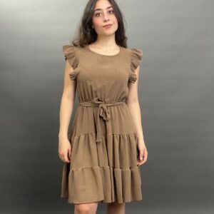 This charming dress features delicate ruffles on the shoulders and a flattering tie-waist design, creating a versatile and comfortable look for any occasion. Its flowing skirt offers a relaxed yet stylish silhouette.