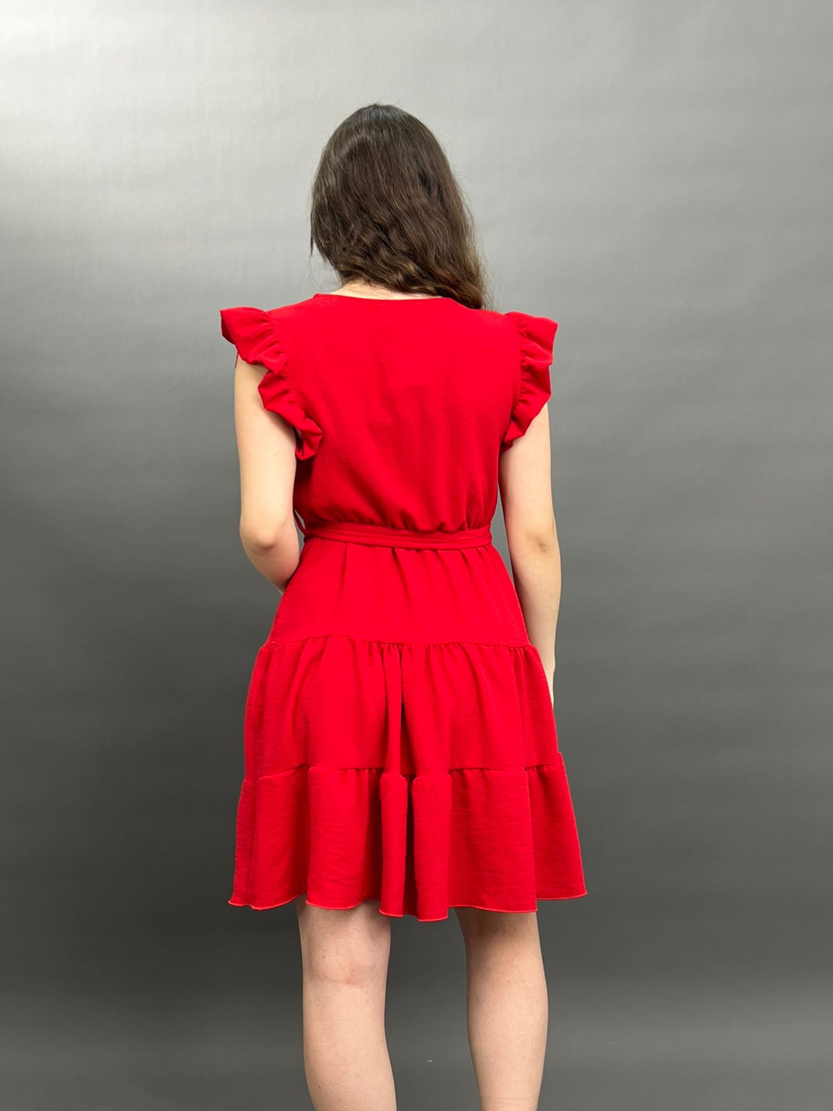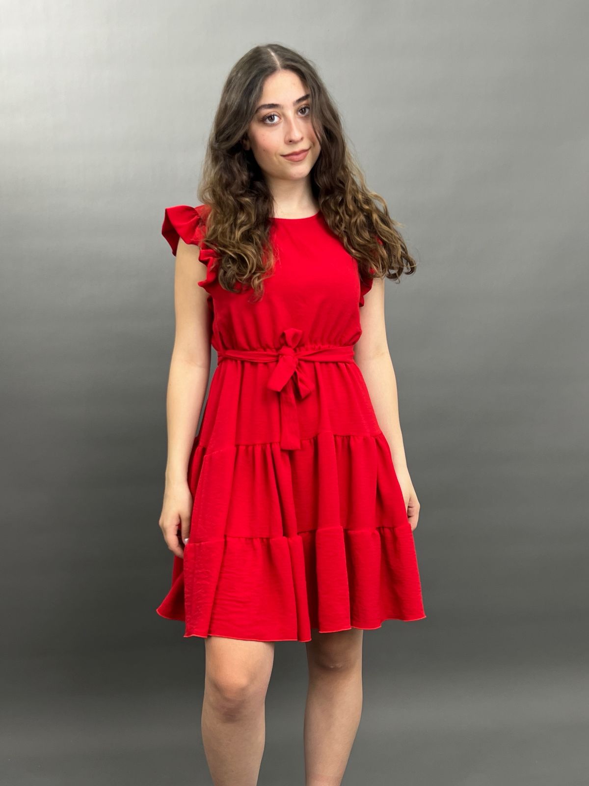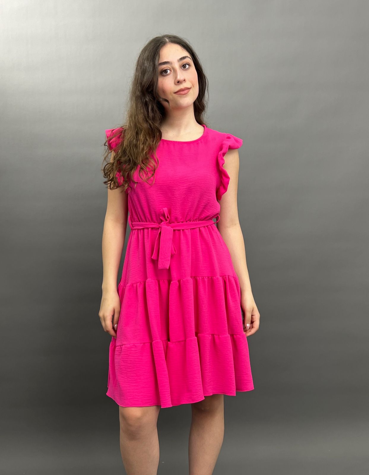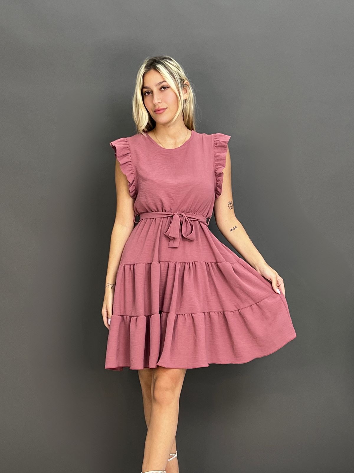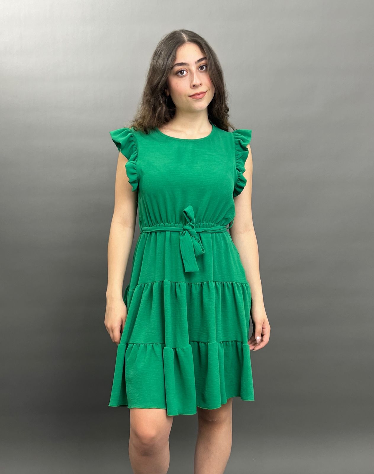 This charming dress features delicate ruffles on the shoulders and a flattering tie-waist design, creating a versatile and comfortable look for any occasion. Its flowing skirt offers a relaxed yet stylish silhouette.
