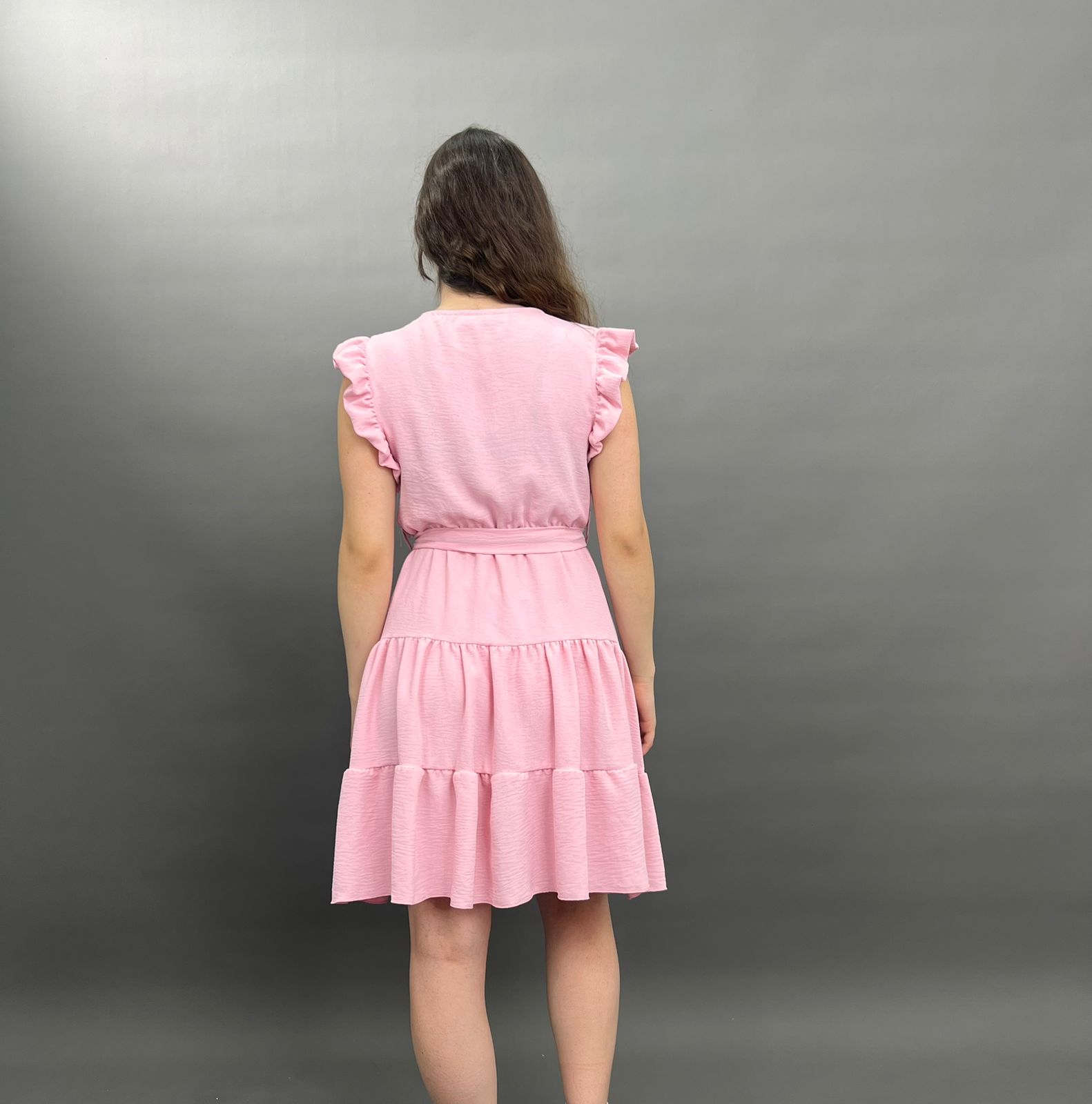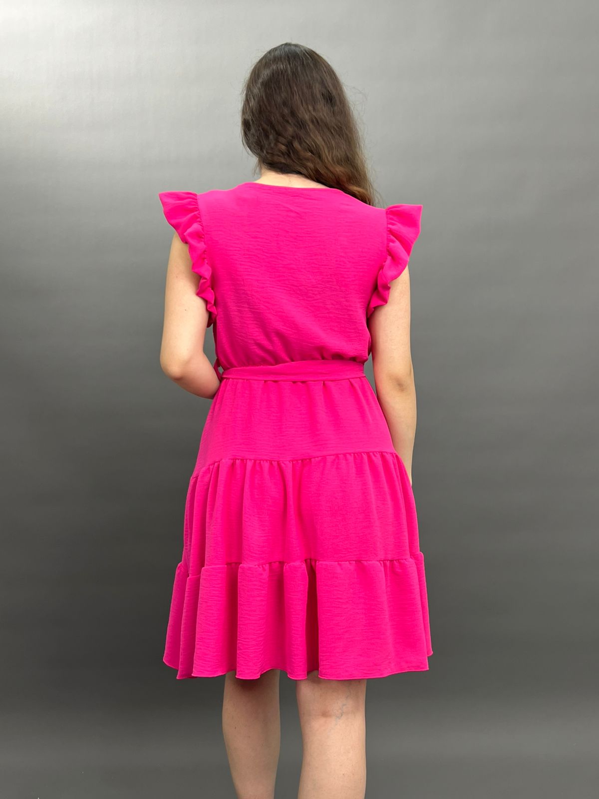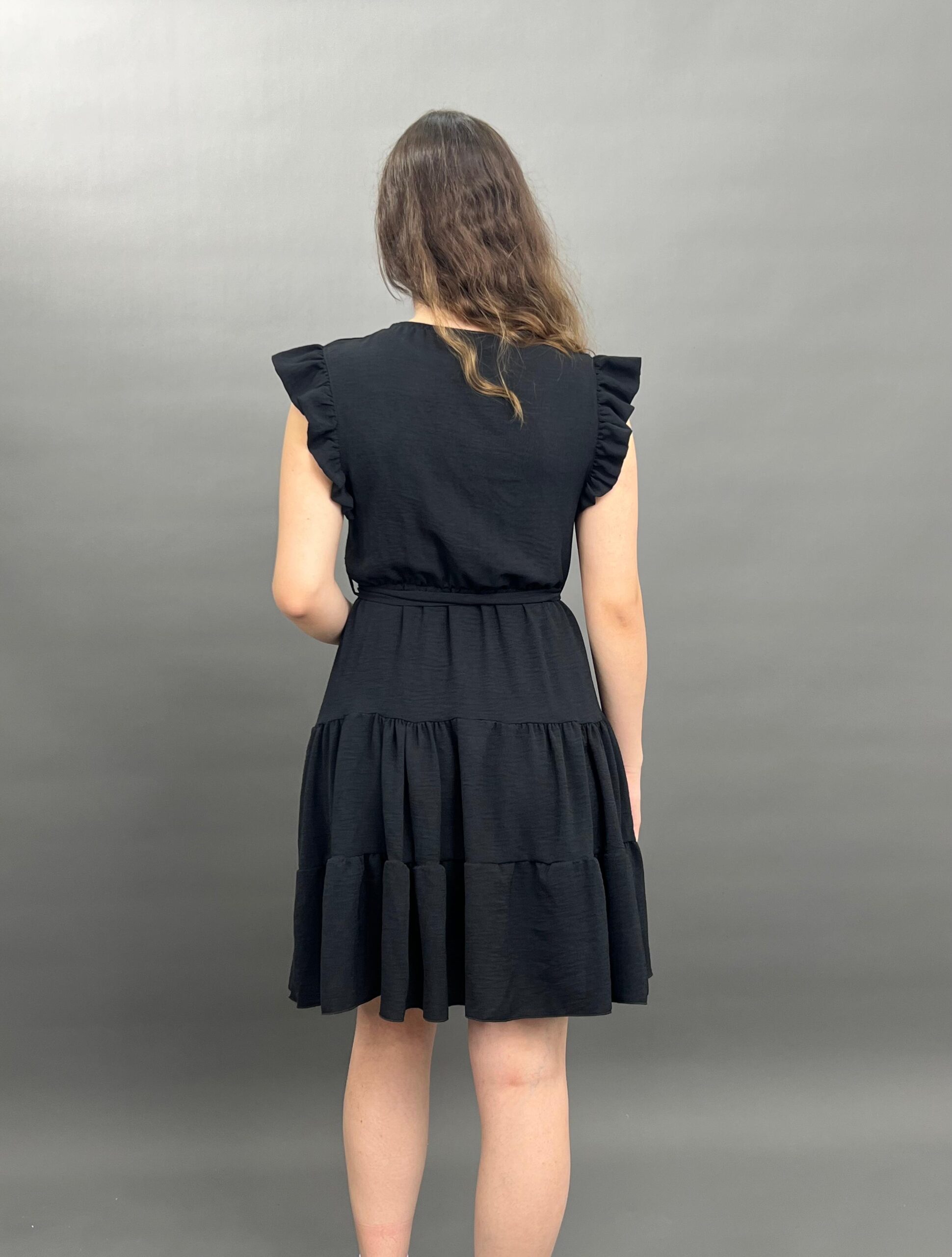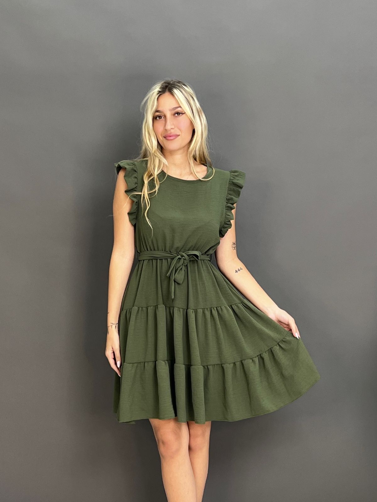 This charming dress features delicate ruffles on the shoulders and a flattering tie-waist design, creating a versatile and comfortable look for any occasion. Its flowing skirt offers a relaxed yet stylish silhouette.