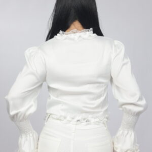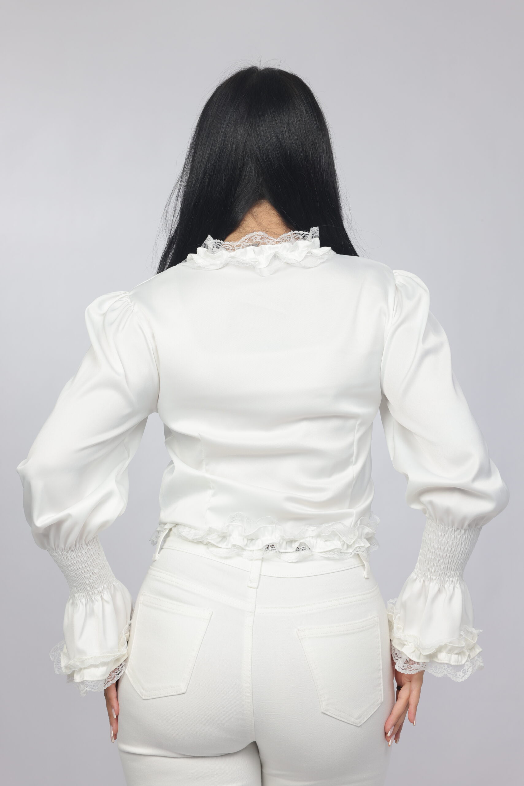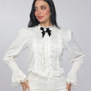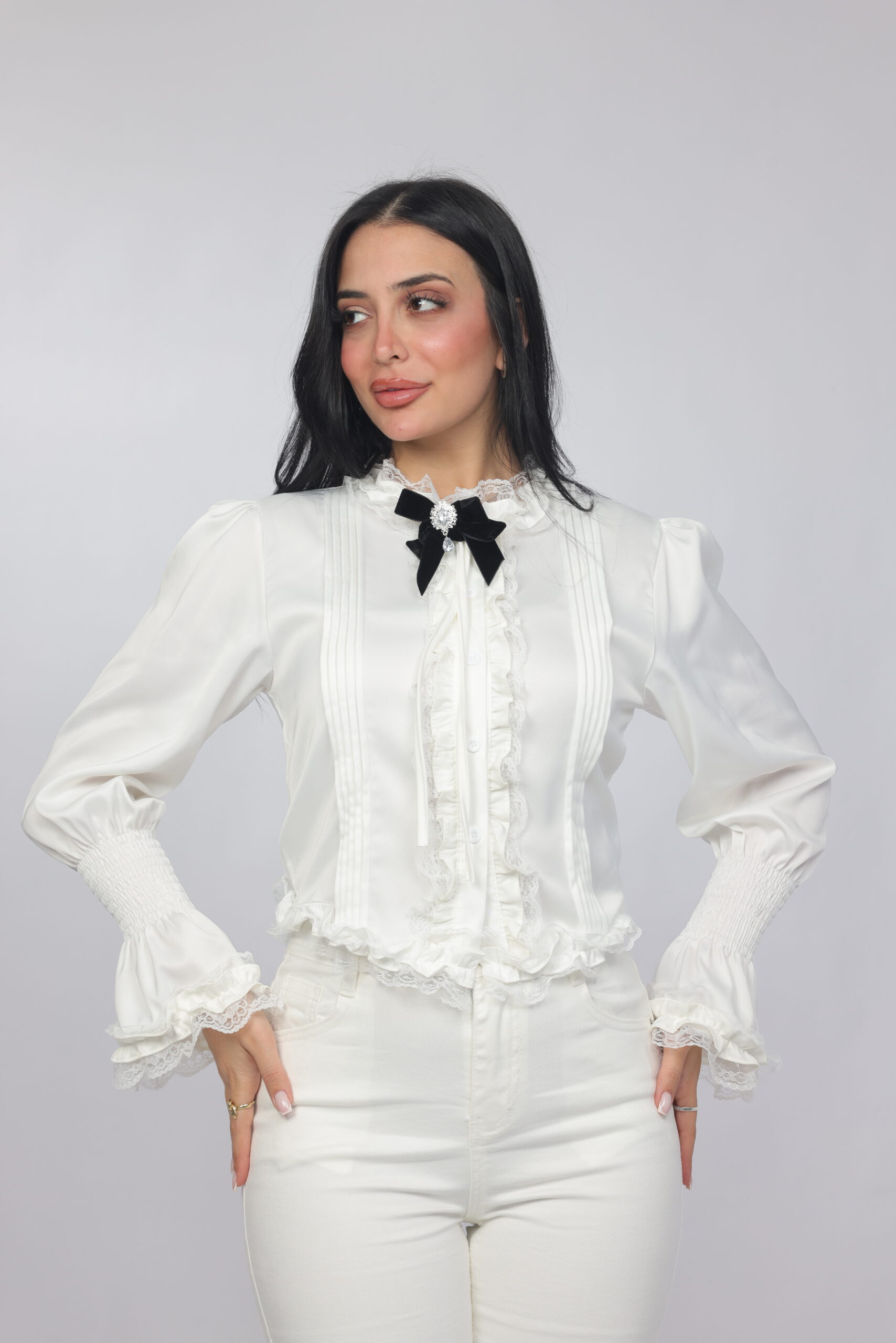 A refined feminine piece designed with delicate lace trims and soft ruffle detailing. Featuring pleated panels and a statement bow accent at the neckline, this blouse brings timeless elegance to any outfit. Perfect for dressy occasions or sophisticated everyday styling.