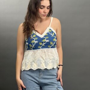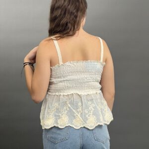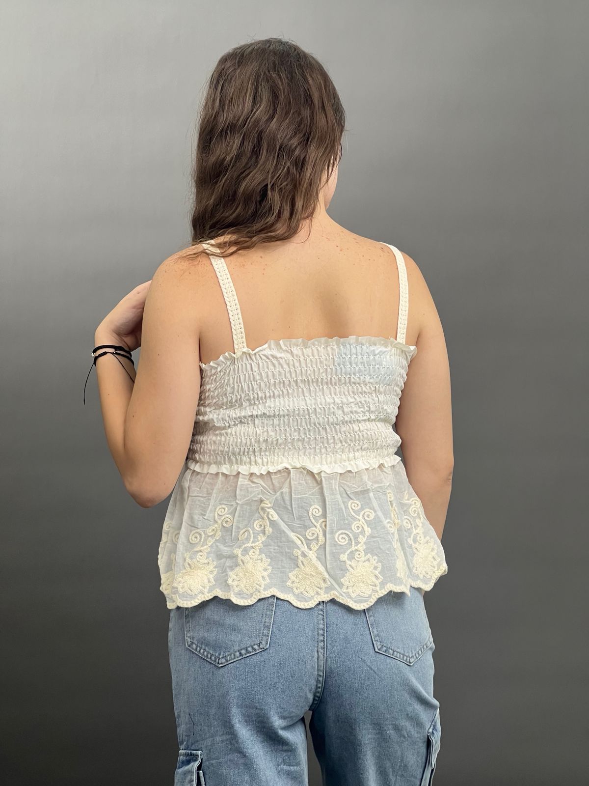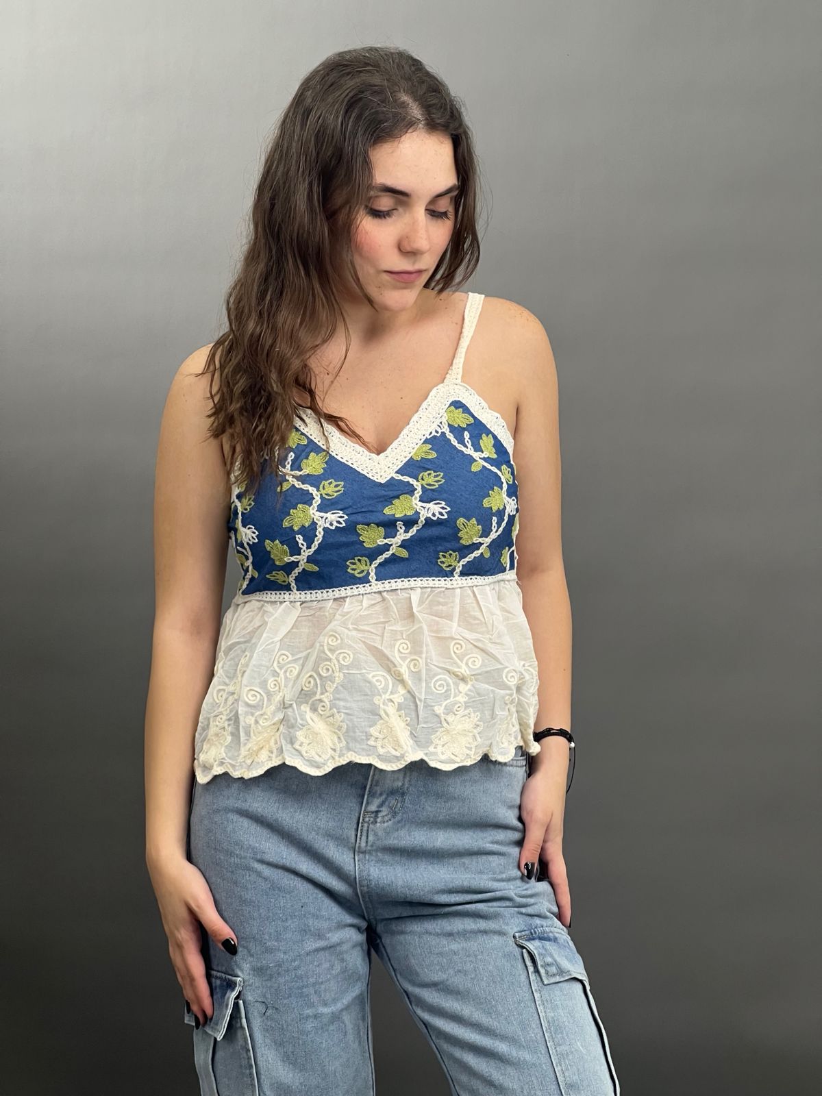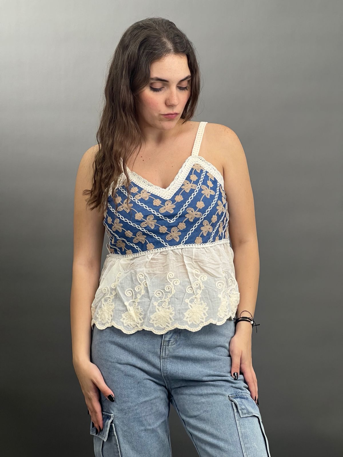 This delicate camisole features a flattering V-neckline and slender straps. It boasts intricate floral embroidery over a textured crochet base, with a contrasting lower panel and a charming scalloped hem, perfect for a bohemian-inspired ensemble.