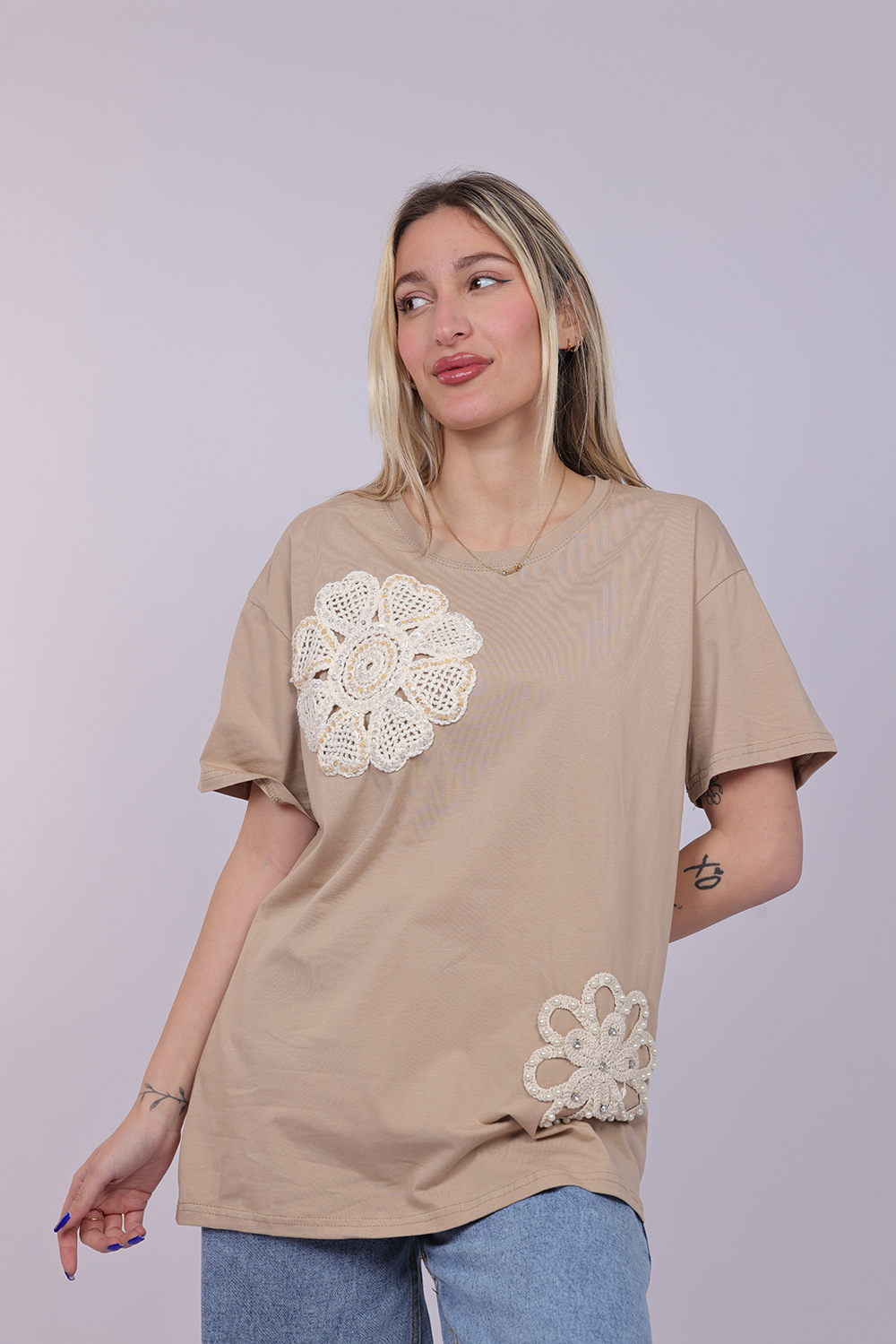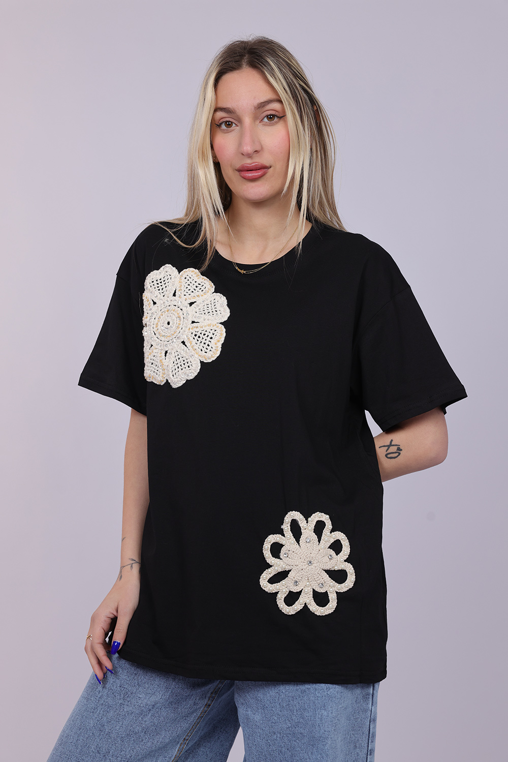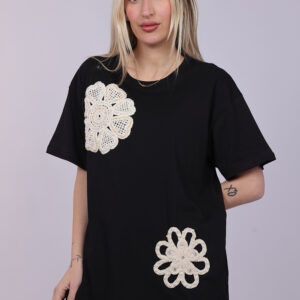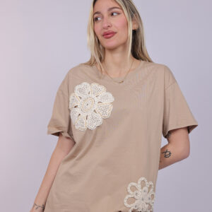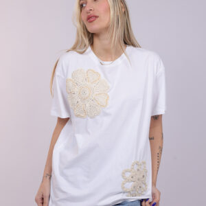 A stylish T-shirt featuring decorative crochet-style floral appliqués that add a unique handcrafted touch to the design. The oversized silhouette creates a relaxed and modern look, while the floral details give the piece a soft feminine feel. Perfect for casual everyday outfits, this T-shirt blends comfort with artistic detailing.