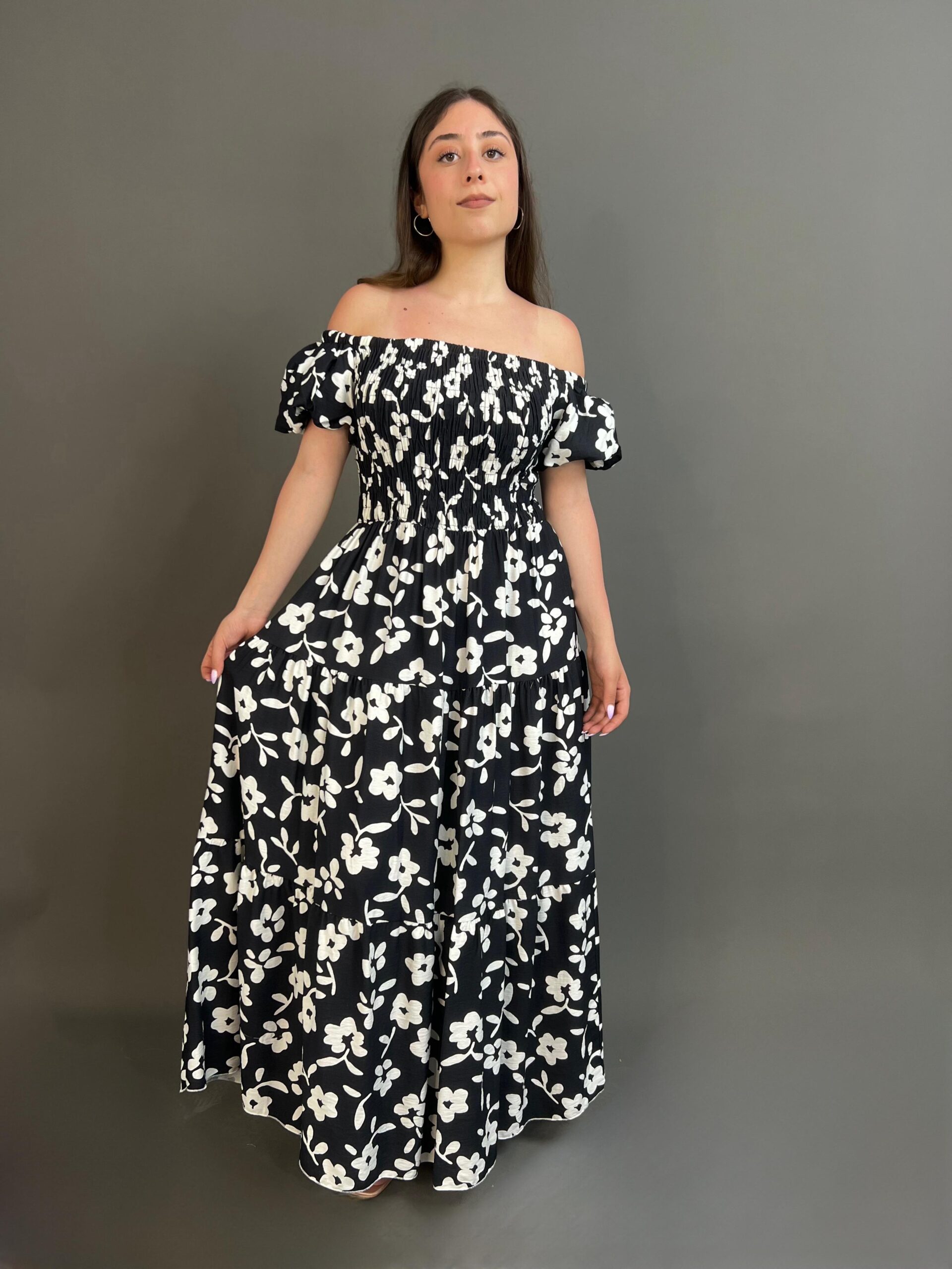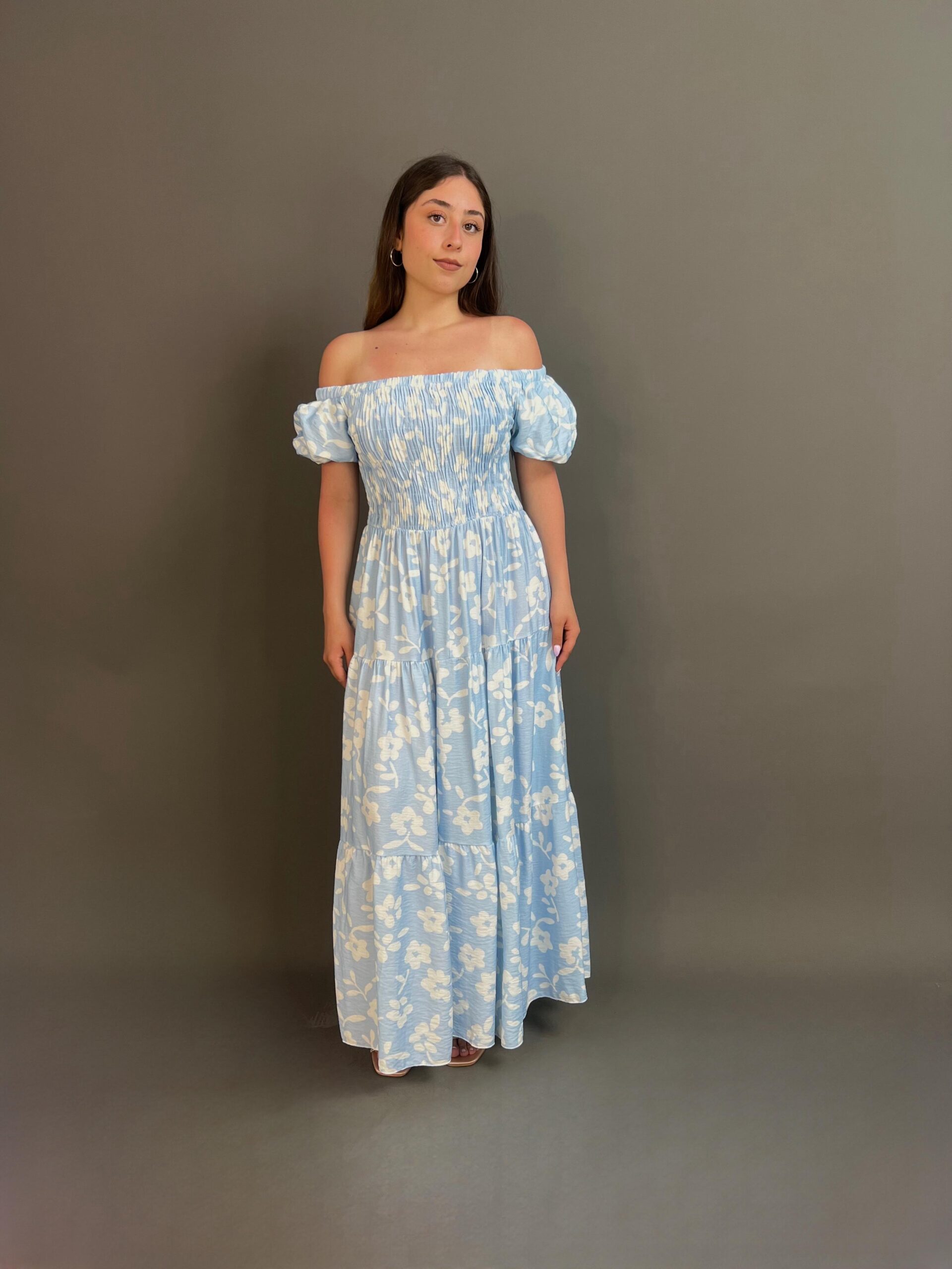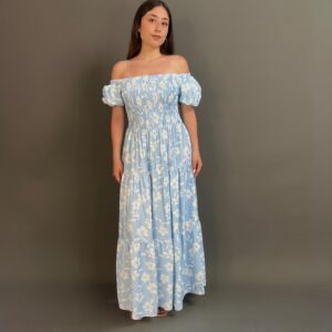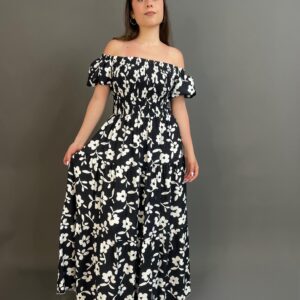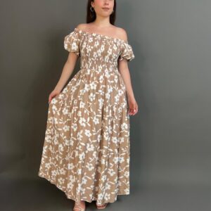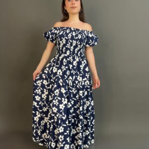 A romantic off-shoulder maxi dress adorned with an all-over floral print. Featuring a flowy silhouette and elasticized neckline for a comfortable fit, it’s perfect for garden parties, beach days, or summer evenings out.