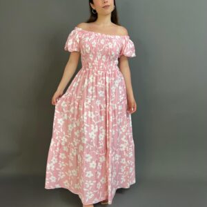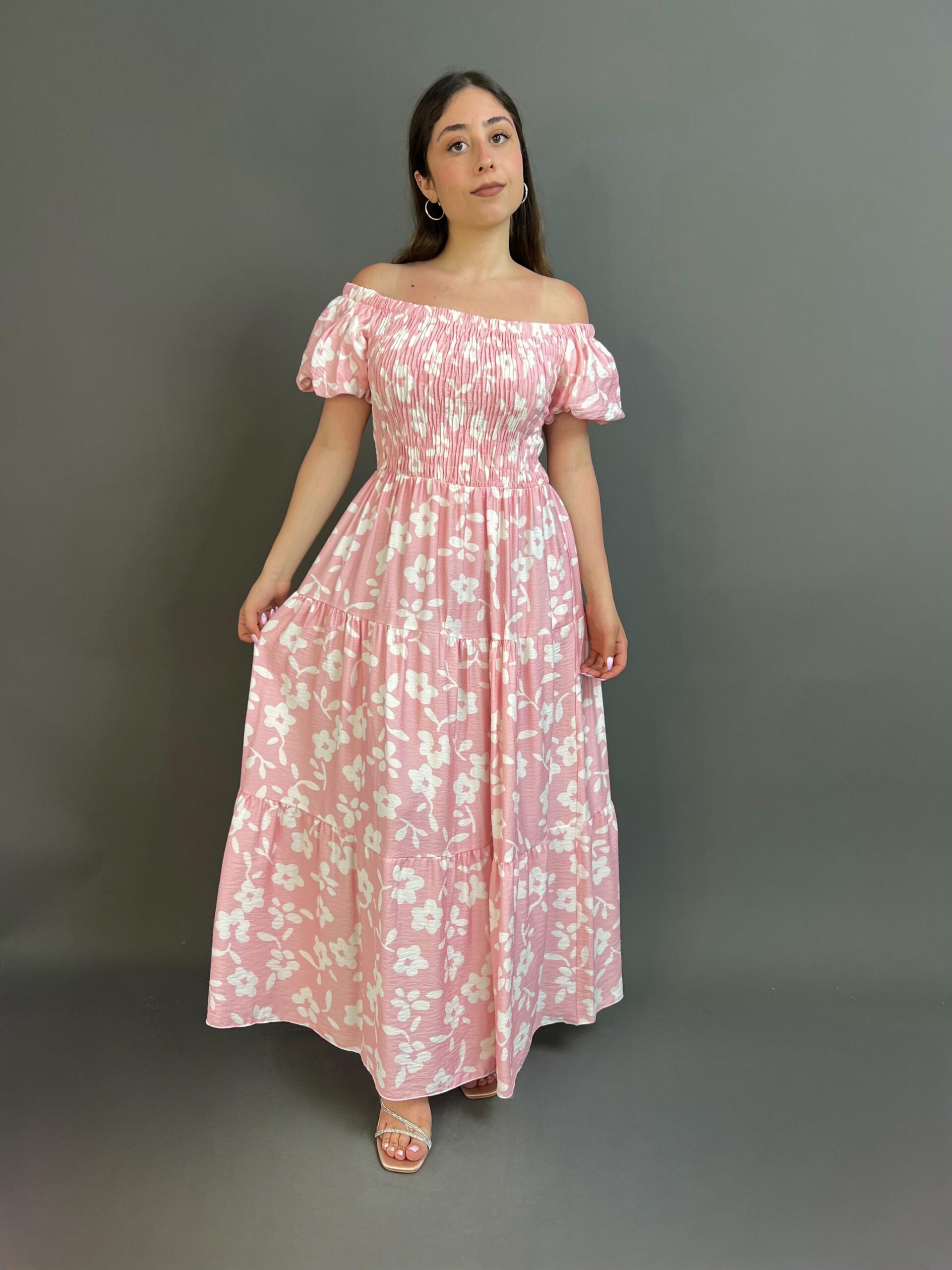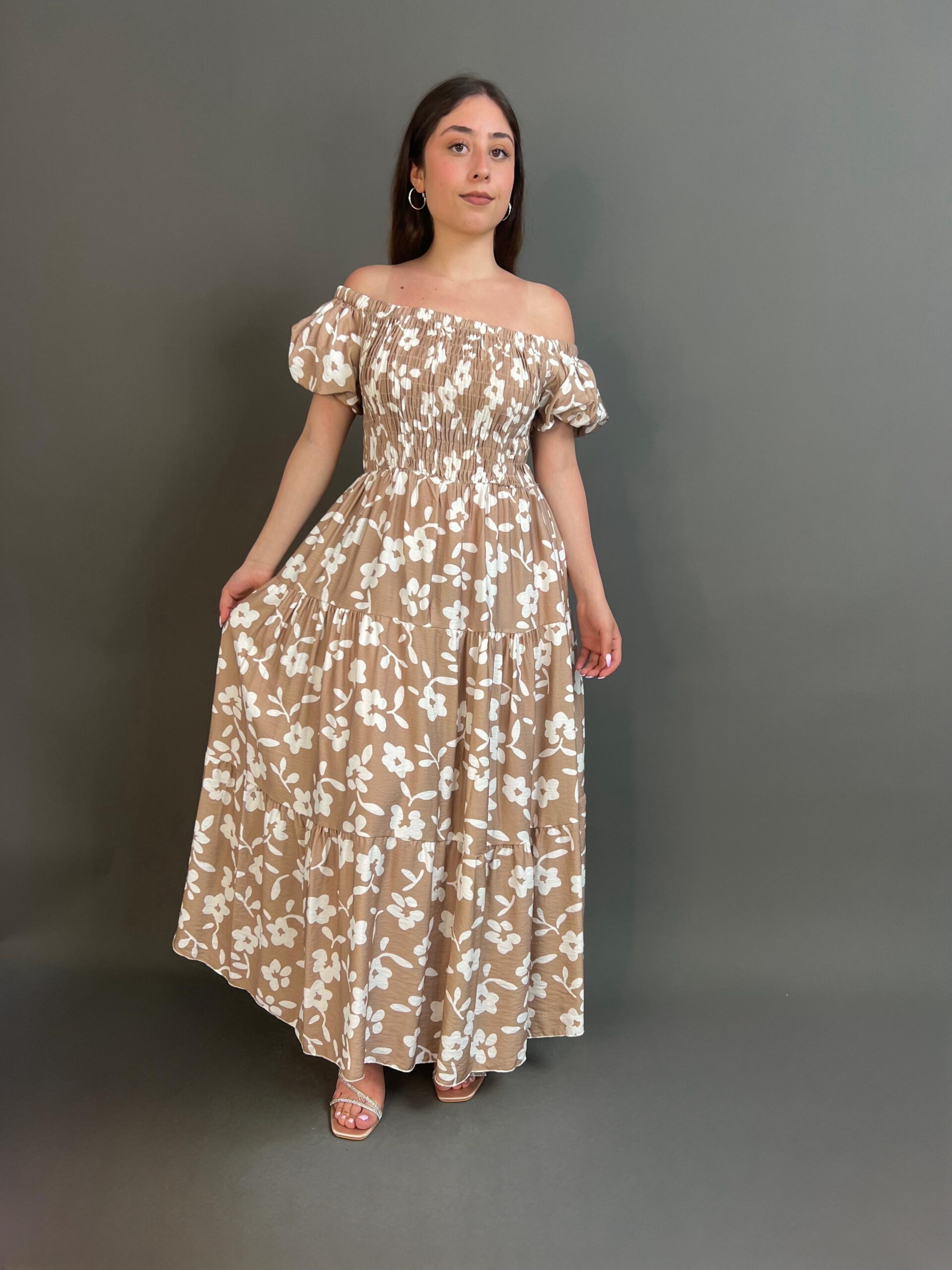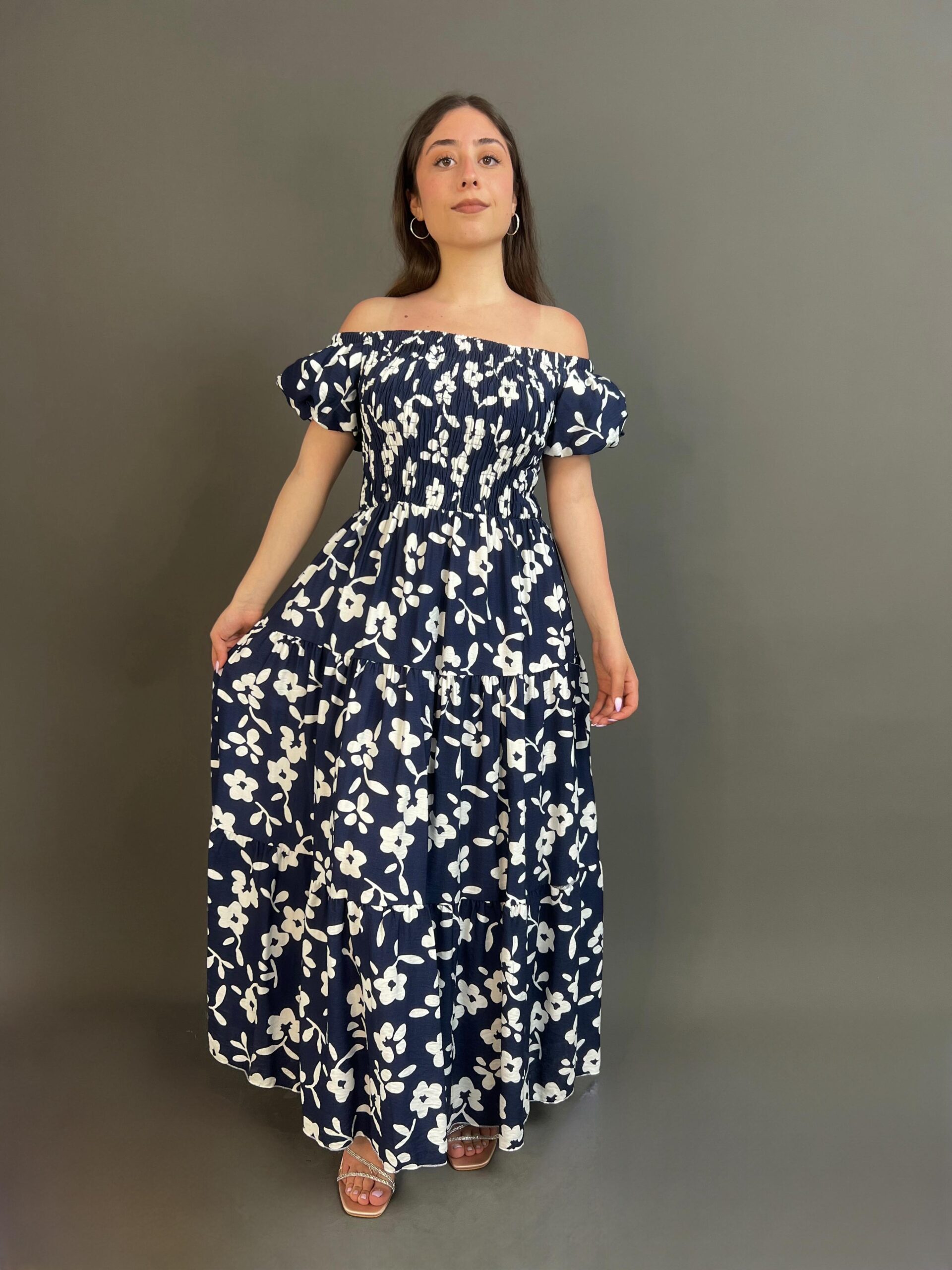 A romantic off-shoulder maxi dress adorned with an all-over floral print. Featuring a flowy silhouette and elasticized neckline for a comfortable fit, it’s perfect for garden parties, beach days, or summer evenings out.