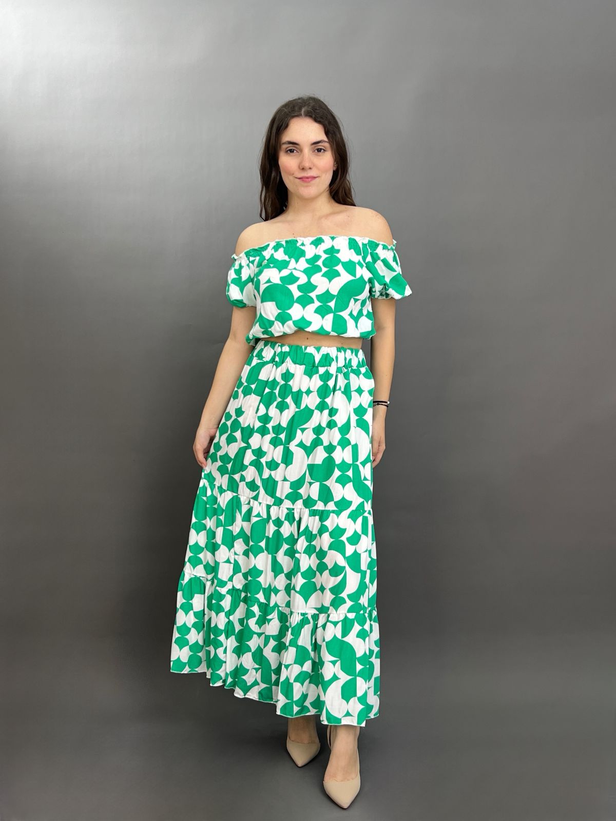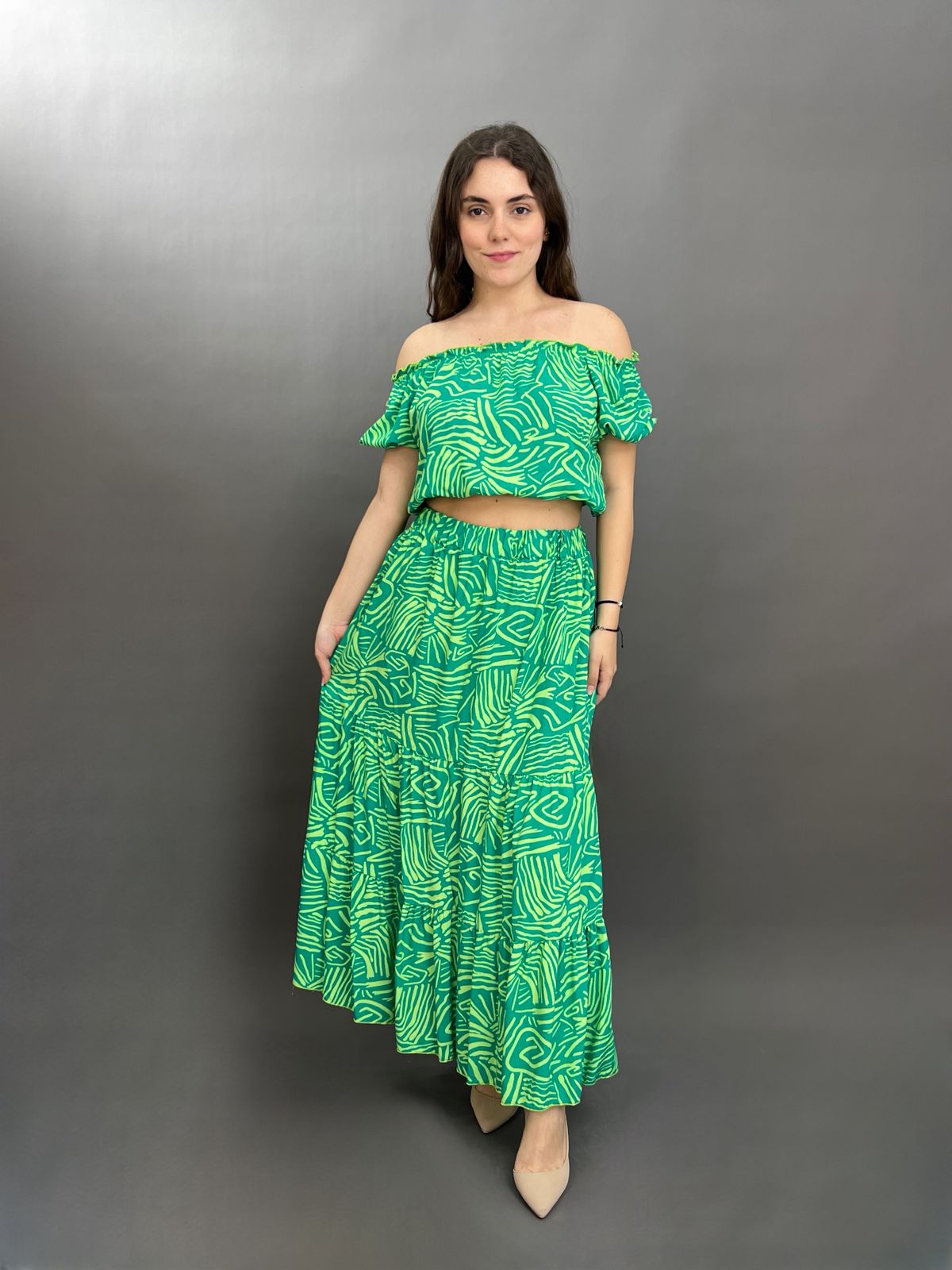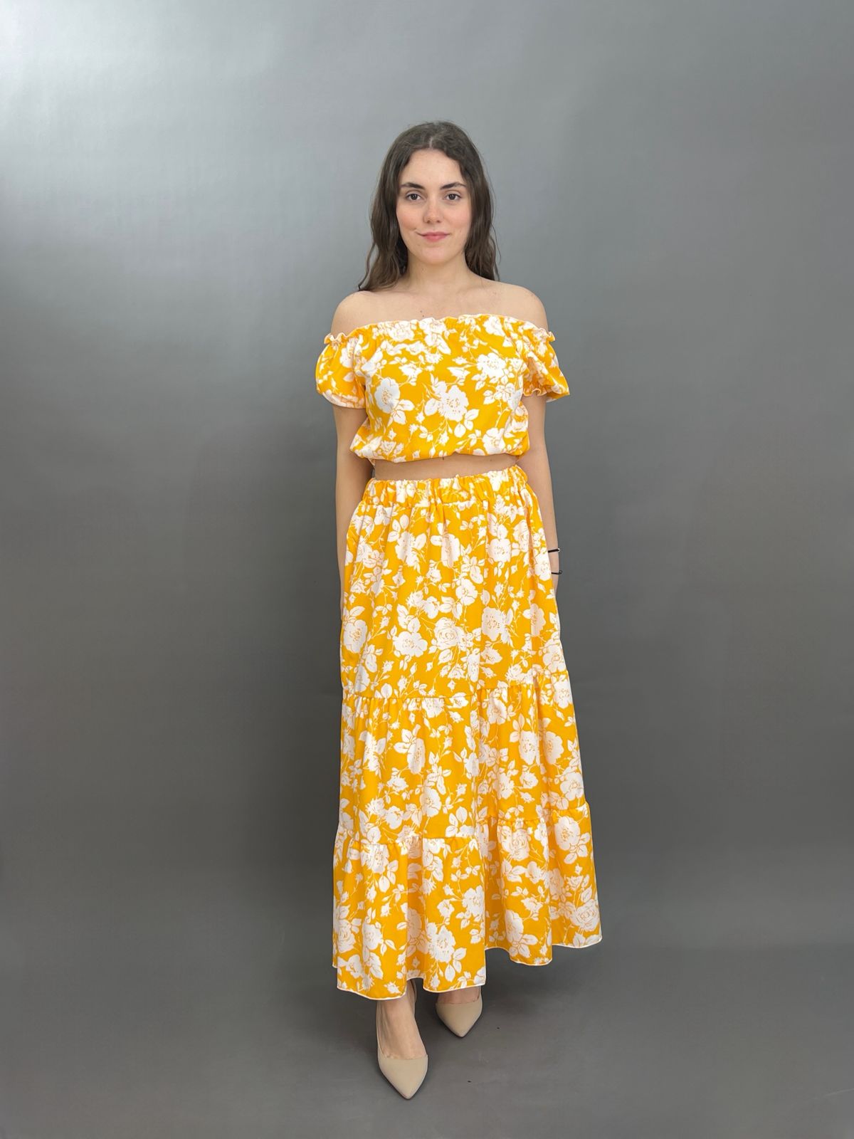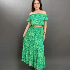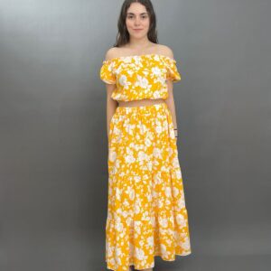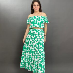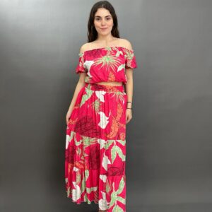 This vibrant two-piece set features a charming floral pattern throughout. The top is designed with an elasticated off-shoulder neckline and short sleeves, while the matching maxi skirt boasts a comfortable elastic waistband and a flowing silhouette. It’s an ideal ensemble for a breezy, stylish look.