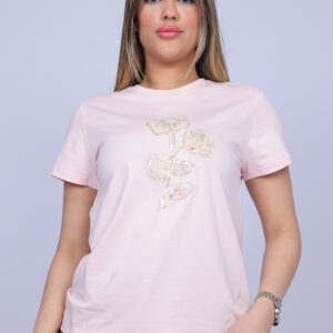 A delicate and elegant T-shirt featuring a beautiful floral design enhanced with pearl-style and sparkling embellishments. The detailed flower artwork adds a soft feminine charm while keeping the look simple and stylish. Perfect for everyday outfits, this piece adds a subtle decorative touch to a classic casual T-shirt.