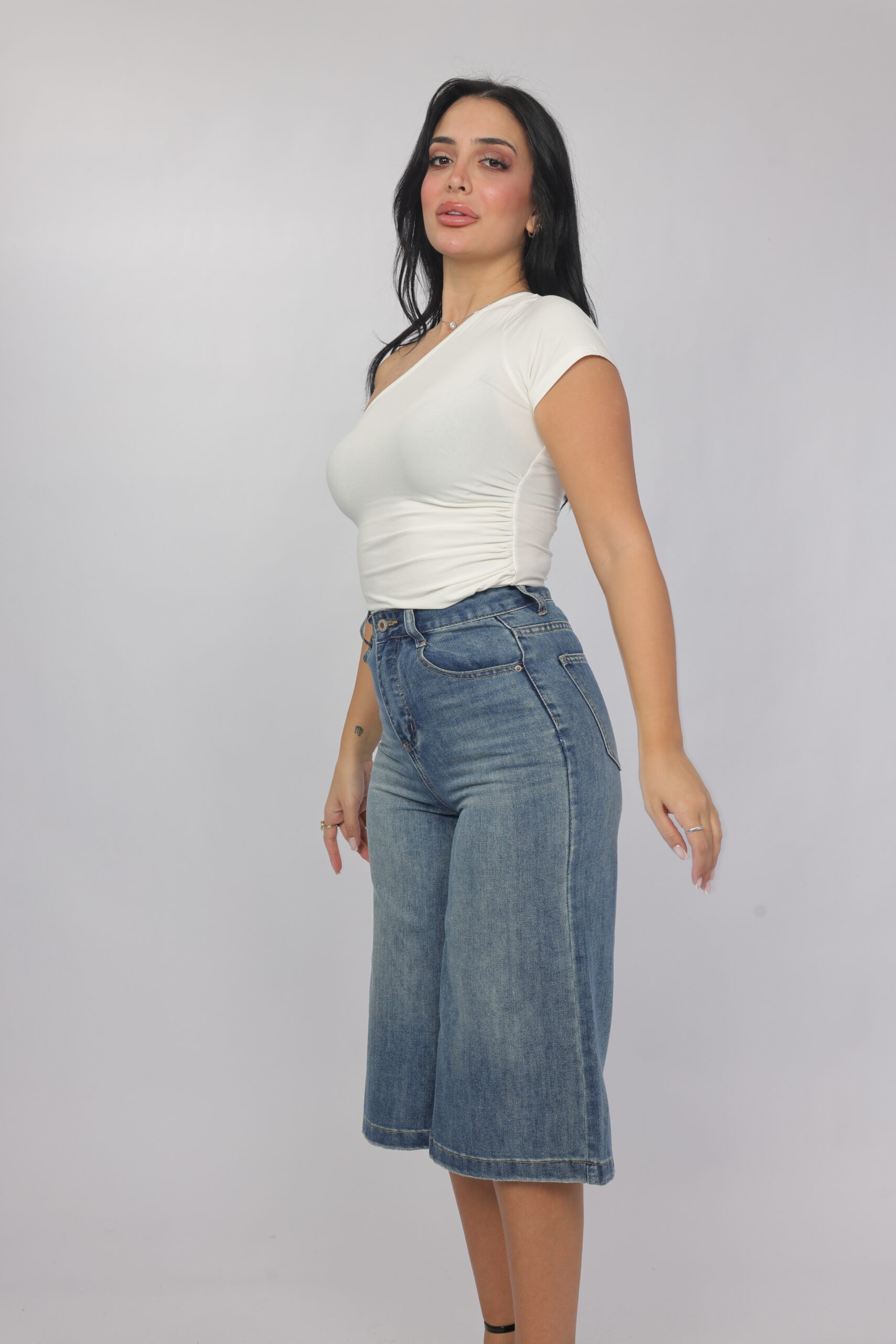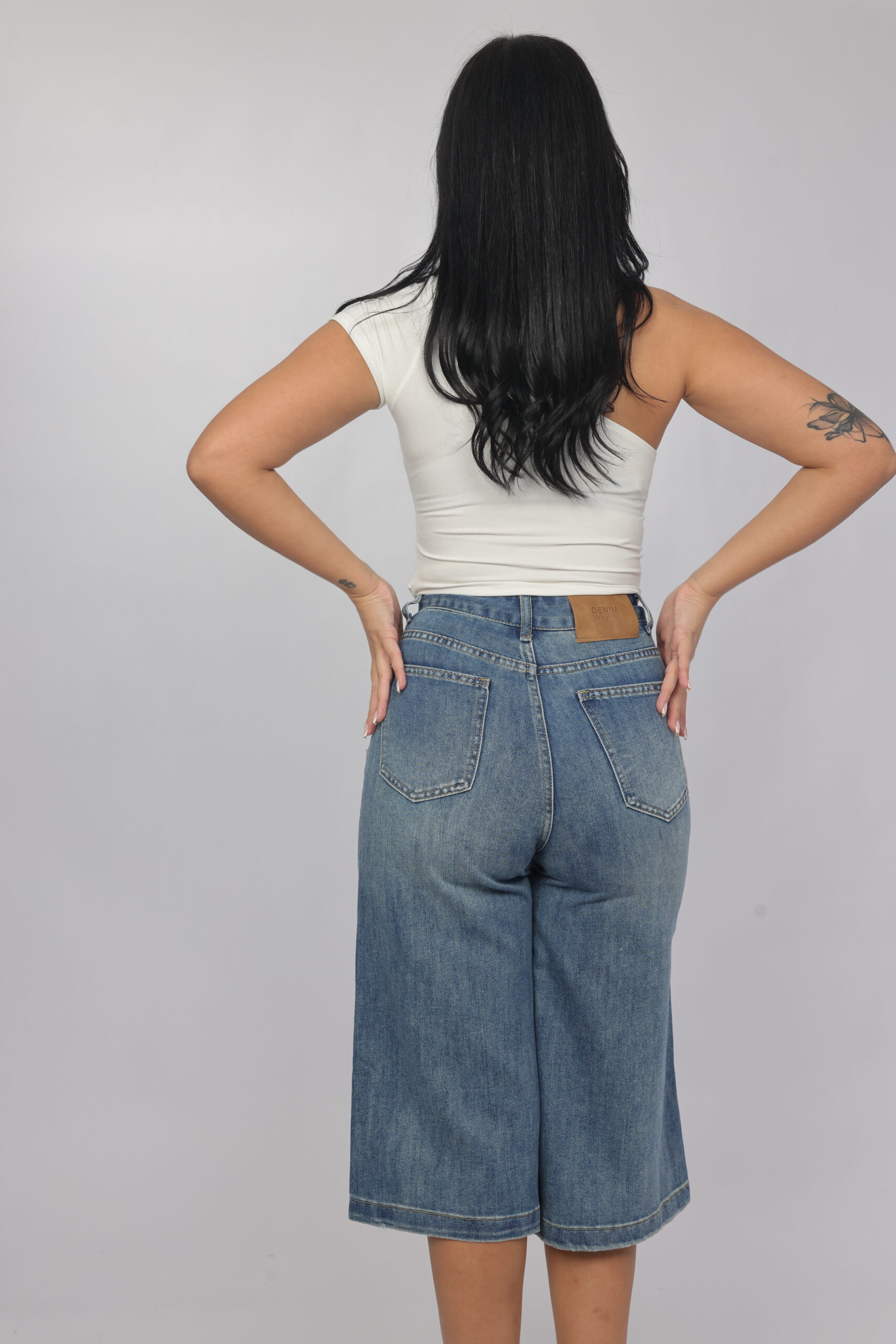 Modern, effortless, and ultra-flattering — these high-waist denim culottes are the perfect balance between comfort and style. Designed with a wide cropped leg, they create a structured yet flowy silhouette that elongates the legs while maintaining a relaxed feel. Dress them up with heels or keep it casual with sneakers — a versatile staple for every wardrobe.