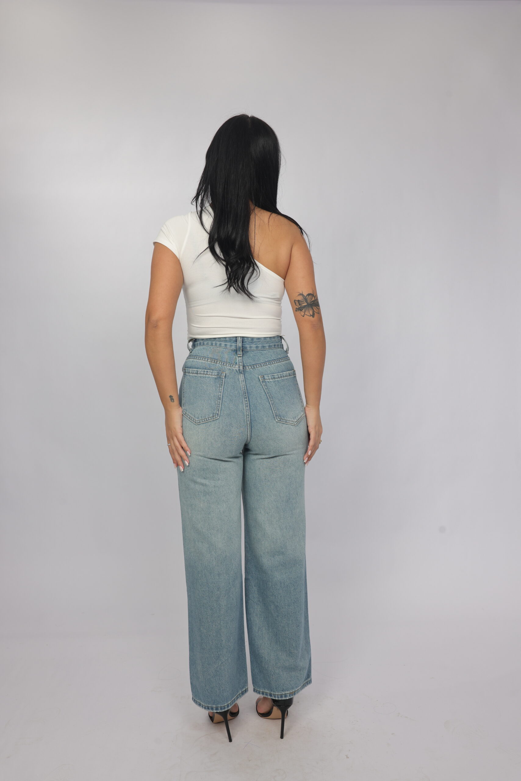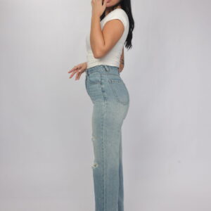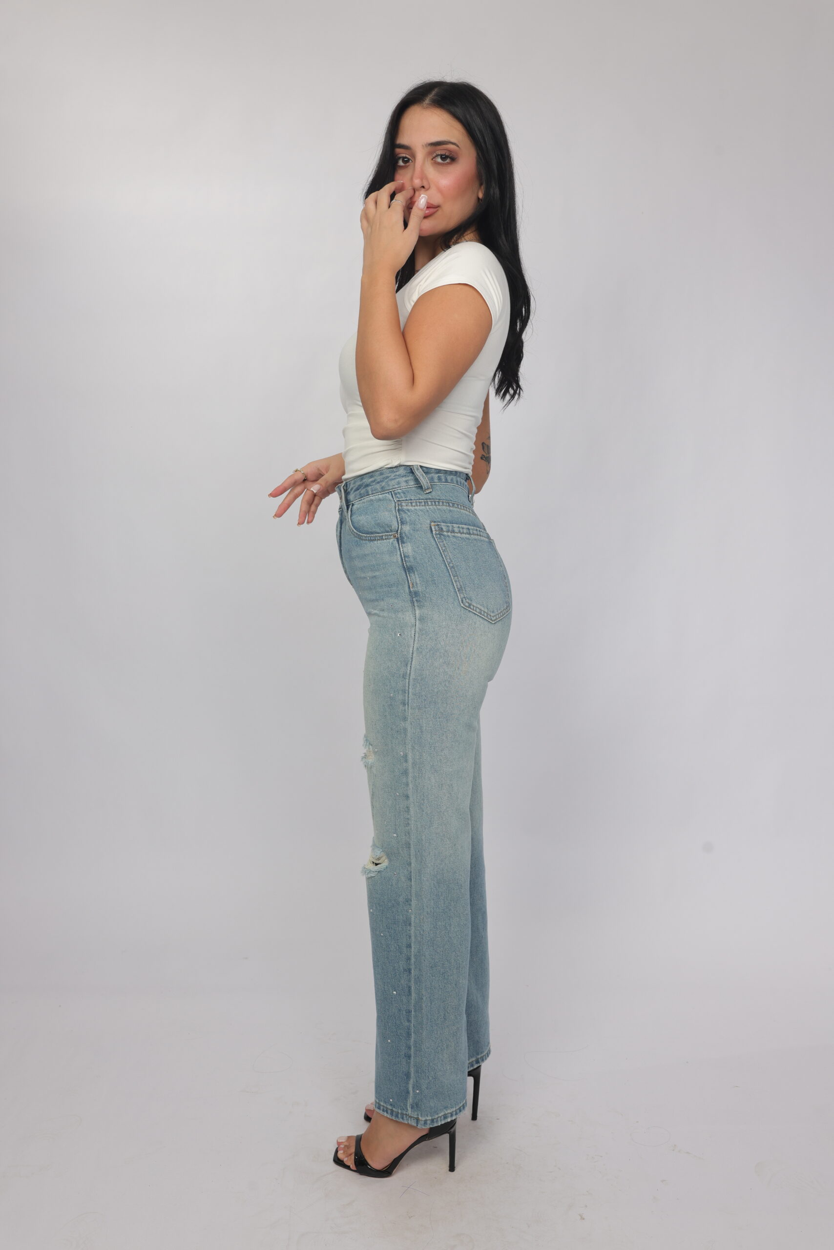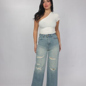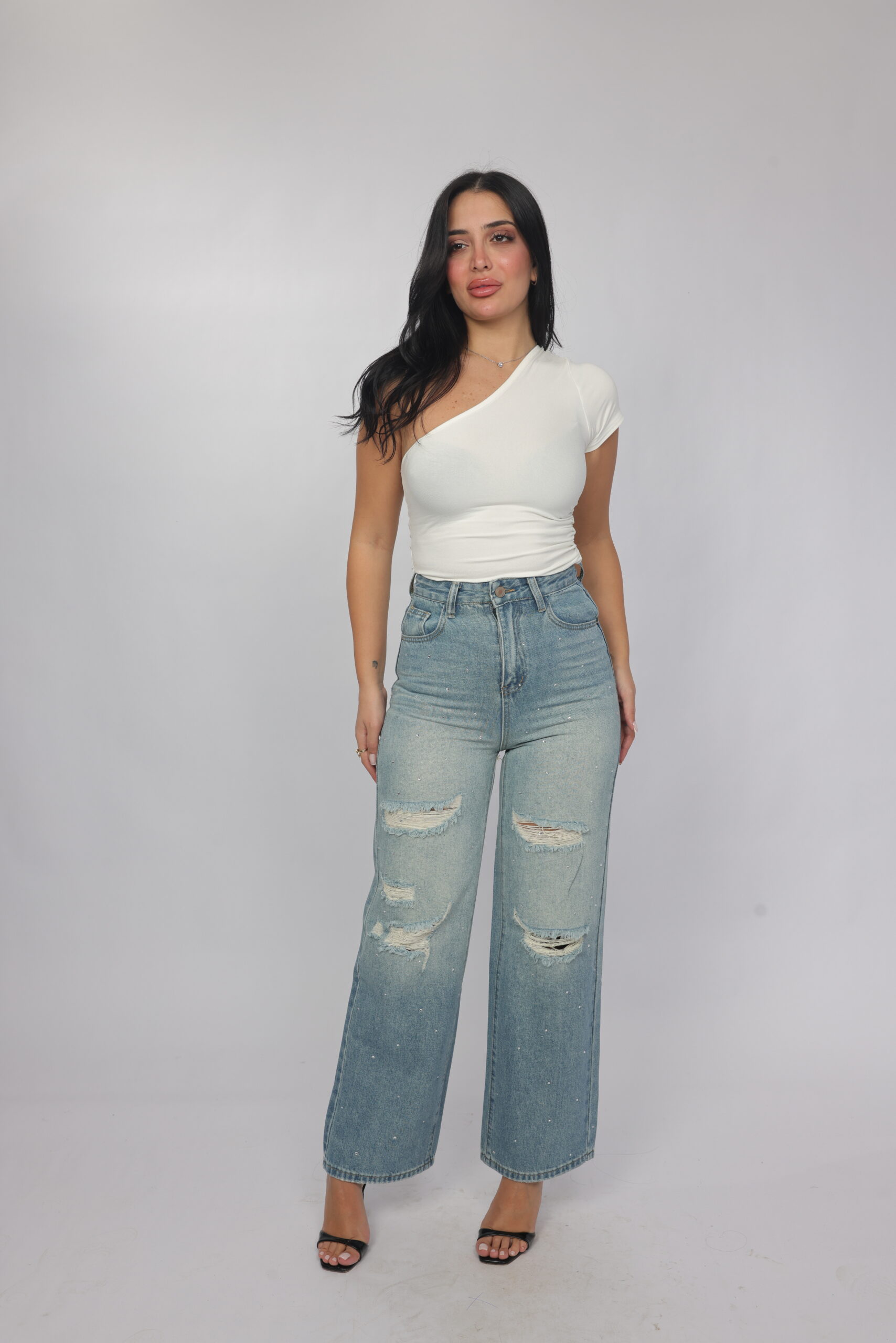 Bold, edgy, and effortlessly stylish — these high-waist distressed jeans are made to stand out. Featuring a flattering fitted waist with a wide-leg cut, they combine structure and comfort for a modern silhouette. The ripped details and subtle embellishments add a statement touch, perfect for elevating your everyday denim look. Pair them with heels for a chic vibe or sneakers for a cool casual outfit.