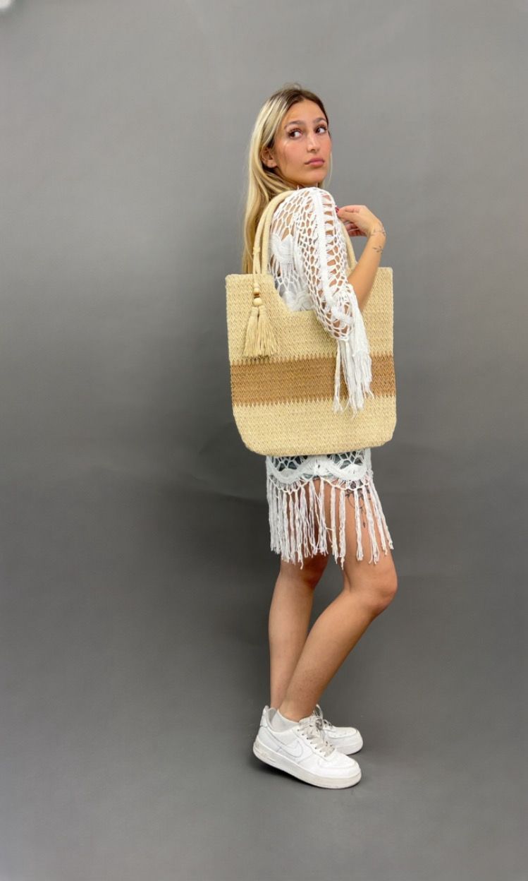 This rectangular tote bag features a distinct horizontal stripe pattern in its woven design, complemented by sturdy handles and a decorative tassel.