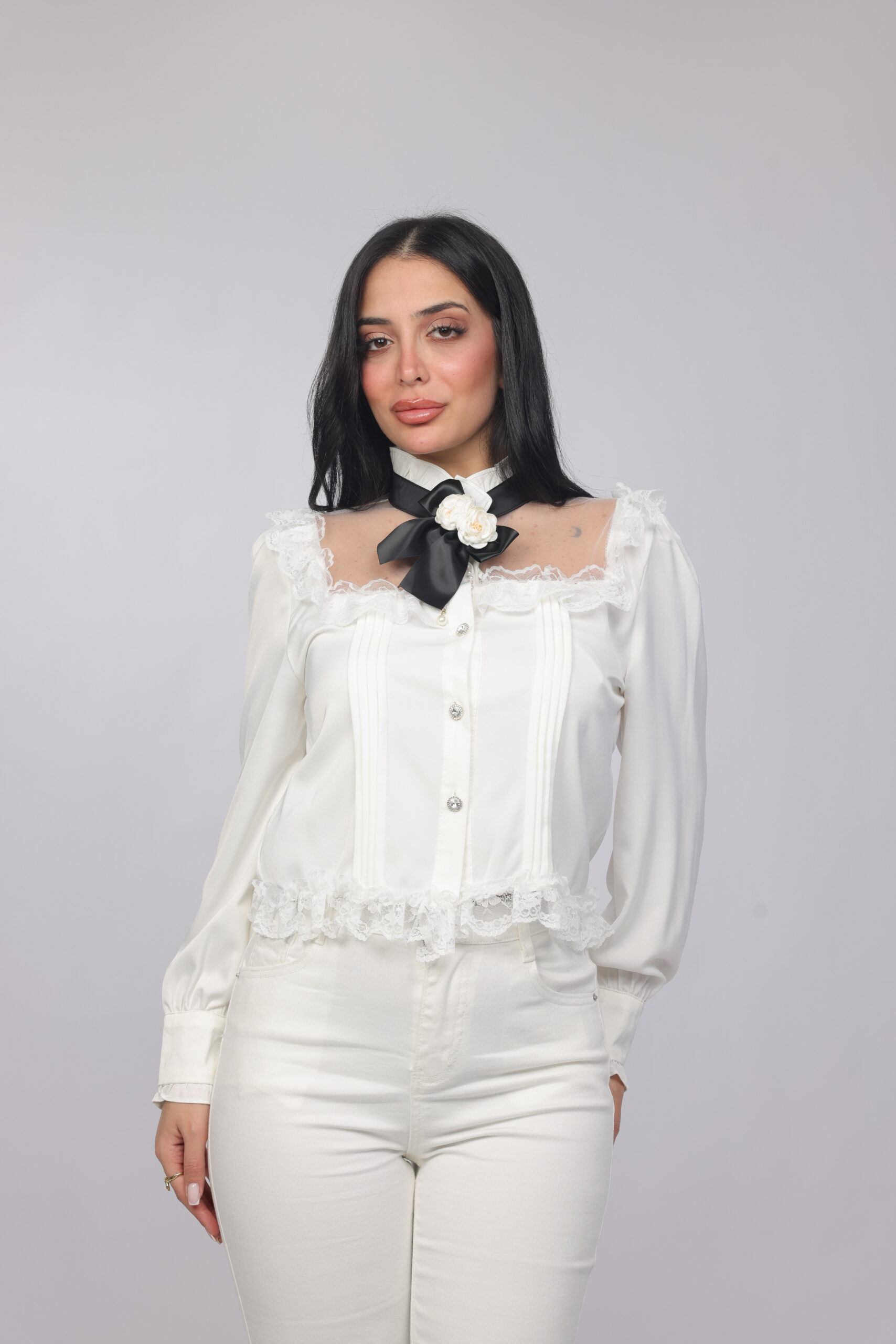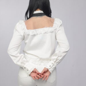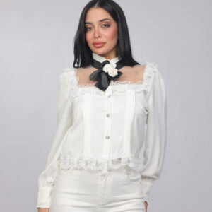 A sophisticated feminine piece designed with delicate lace accents and elegant pleated detailing. Featuring a statement bow neckline with a floral accent, this blouse blends vintage charm with modern refinement. Perfect for dressy occasions or elevated everyday styling.