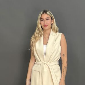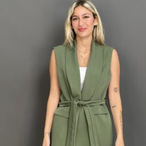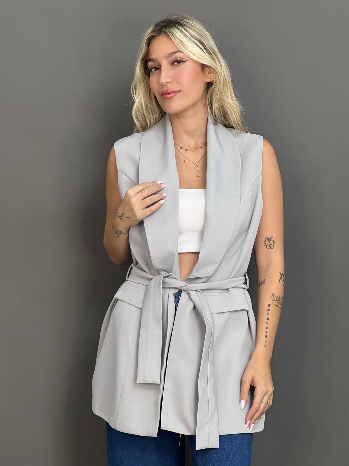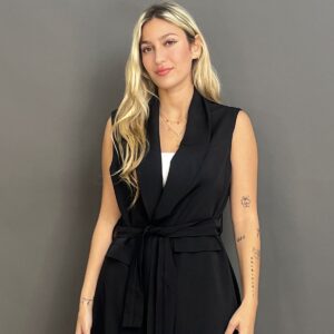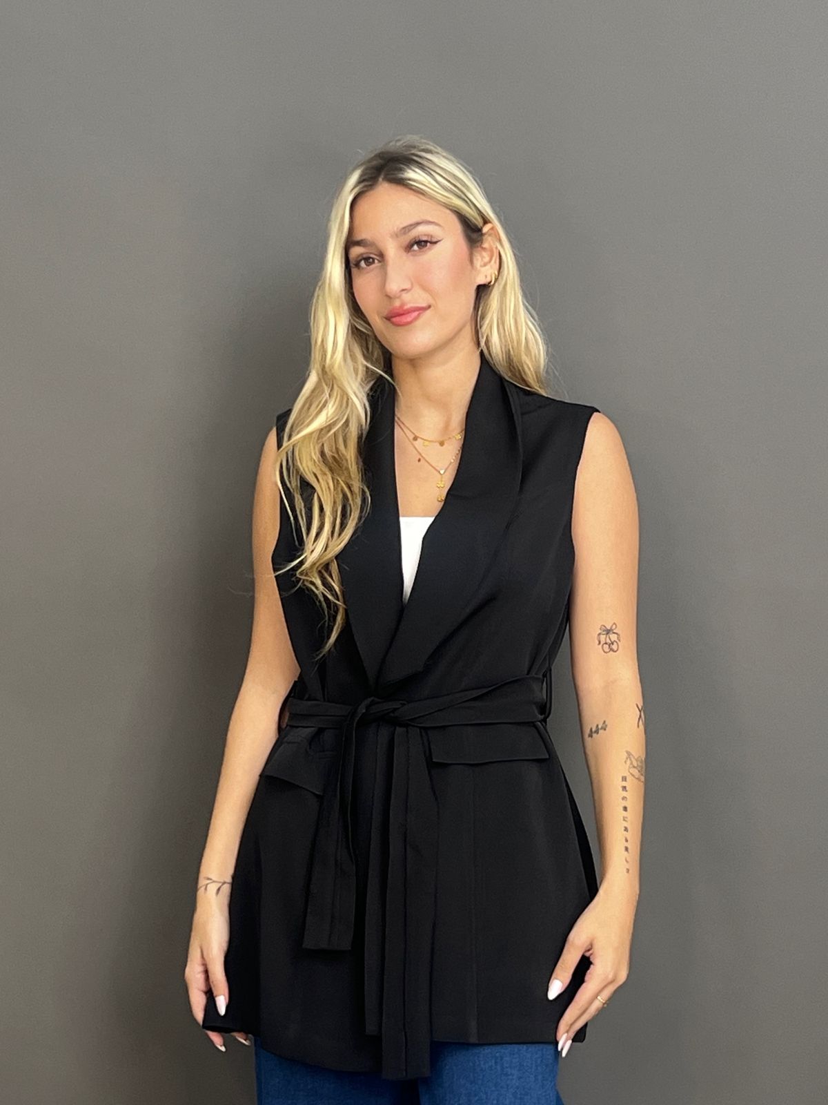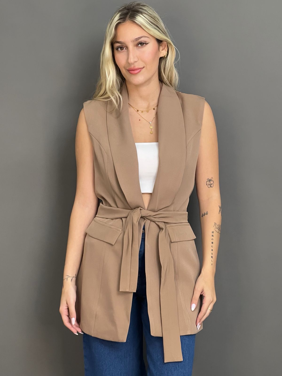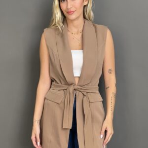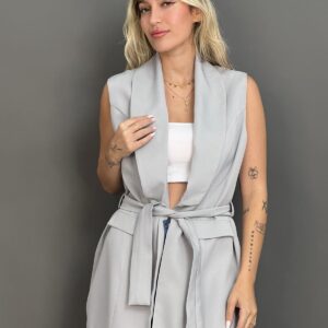 This is a long, sleeveless vest with a sophisticated lapel collar. It features a tie belt at the waist, which creates a cinched, tailored silhouette. The piece has a sleek, modern design, perfect for layering.