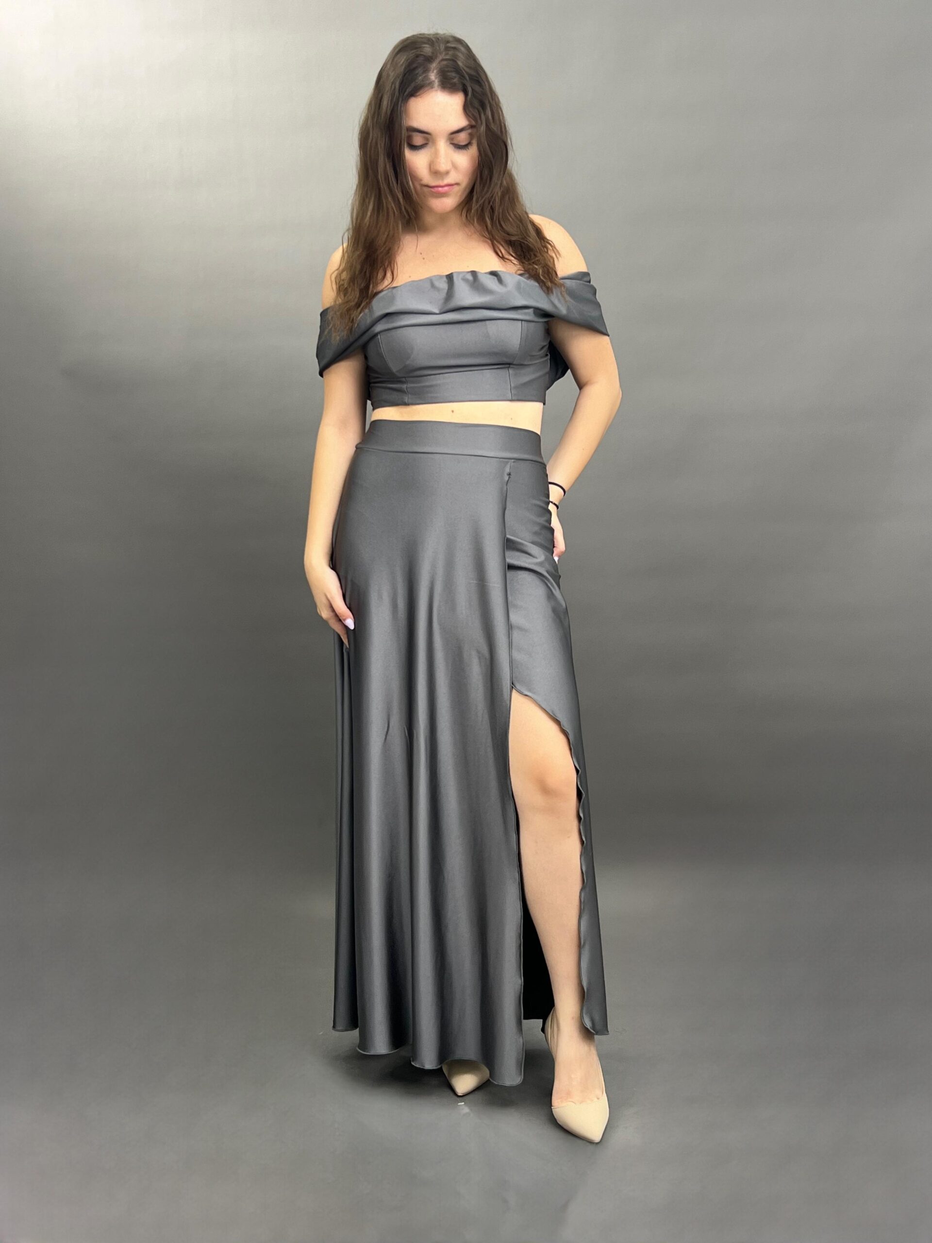 This elegant two-piece ensemble features an alluring off-shoulder top paired with a flowing maxi skirt. The skirt boasts a high slit, adding a touch of sophistication and movement to this stylish outfit, perfect for special occasions.