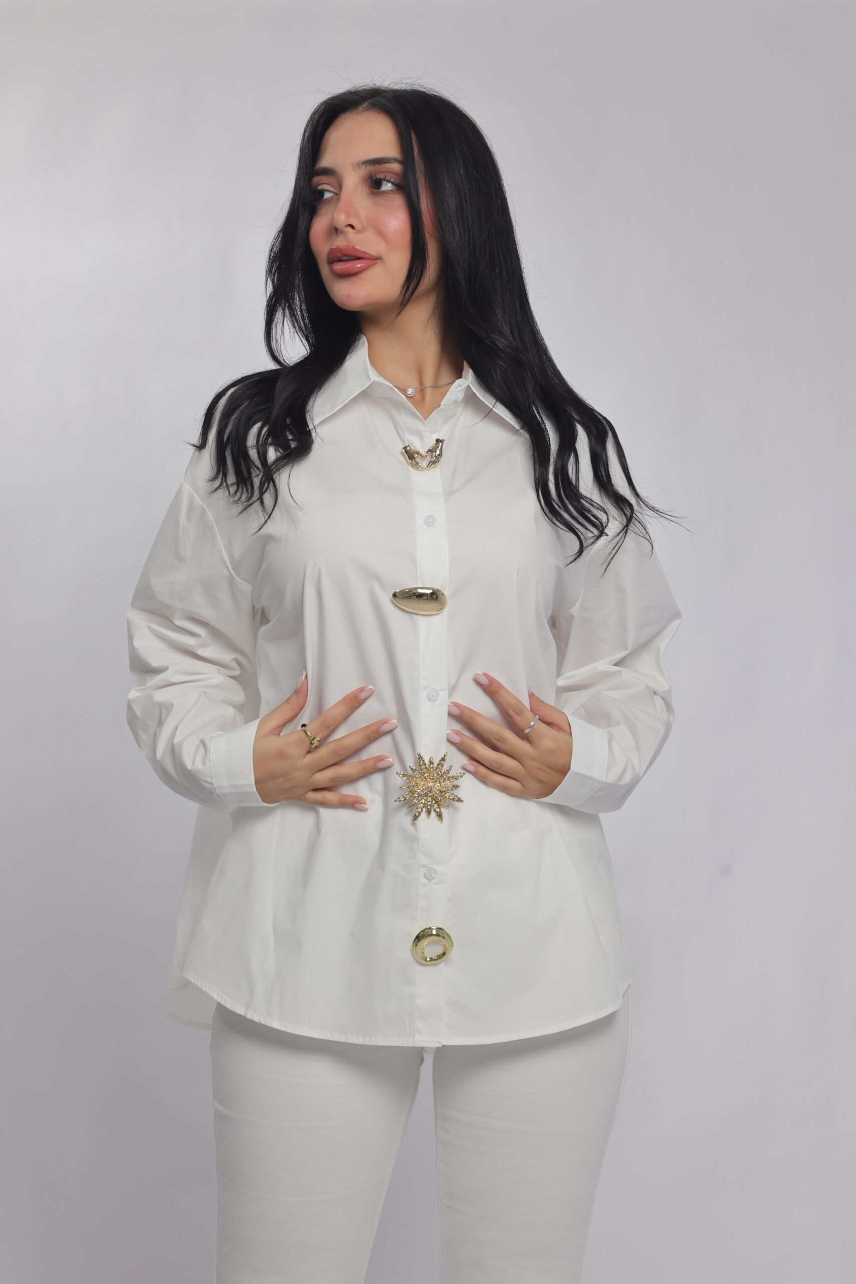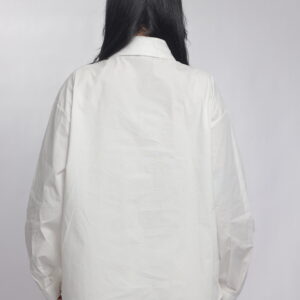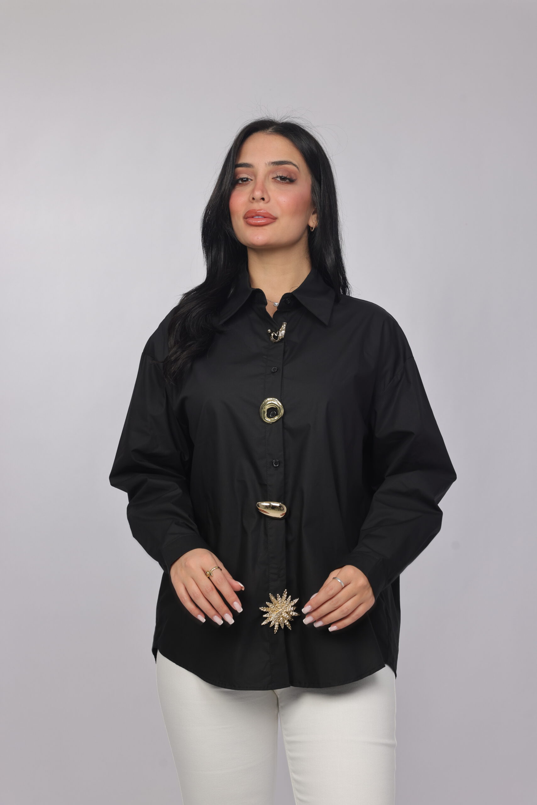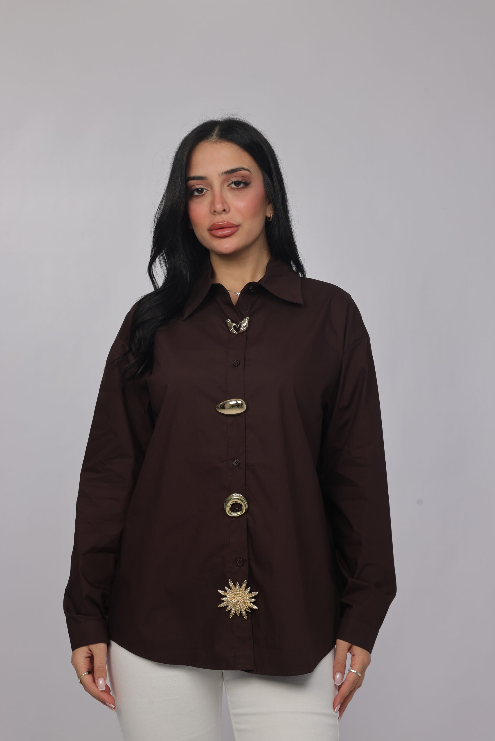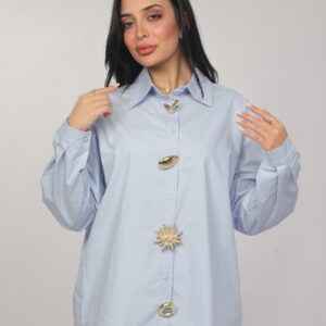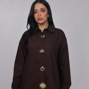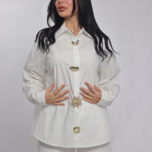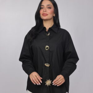 A bold twist on a classic silhouette. This oversized chemise combines a structured collar and relaxed fit with eye-catching decorative details along the front, giving it a modern statement look. Perfect for styling with tailored pants or denim for a chic, elevated outfit.