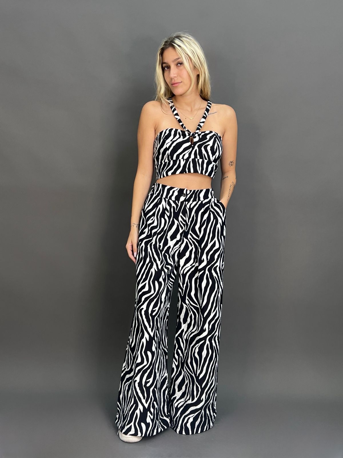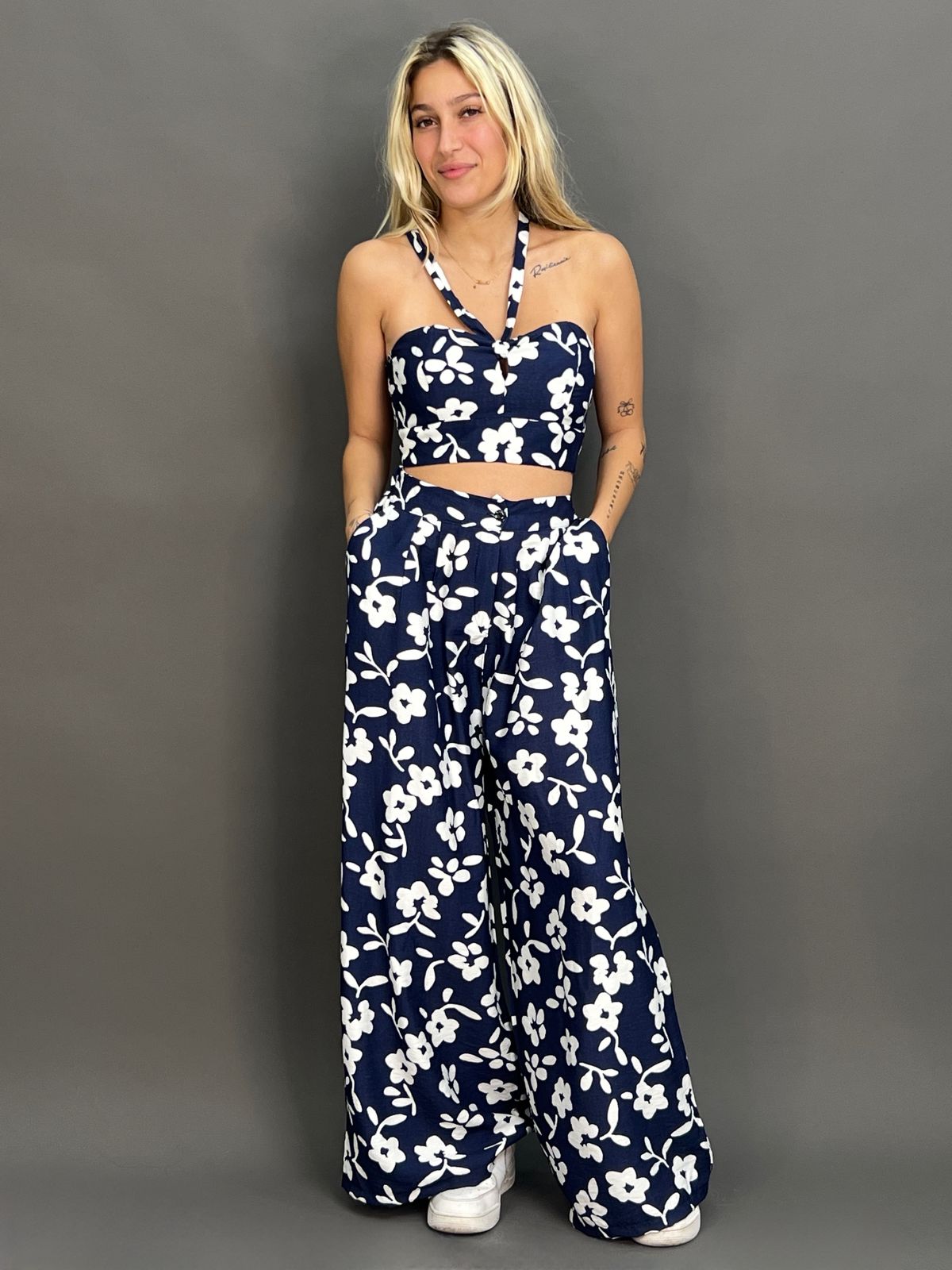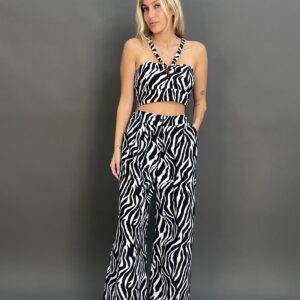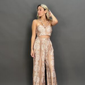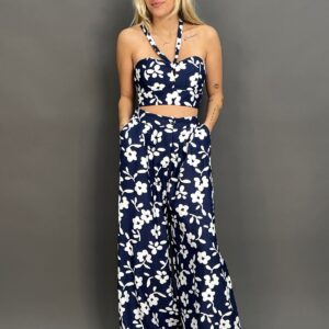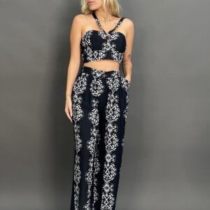 This two-piece set features a matching paisley pattern on both the top and pants. The top is a cropped halter design, while the high-waisted, wide-leg pants have a relaxed fit and side pockets, making for a coordinated and stylish outfit.