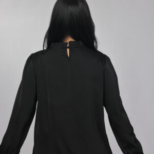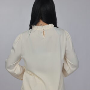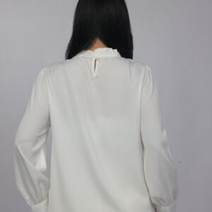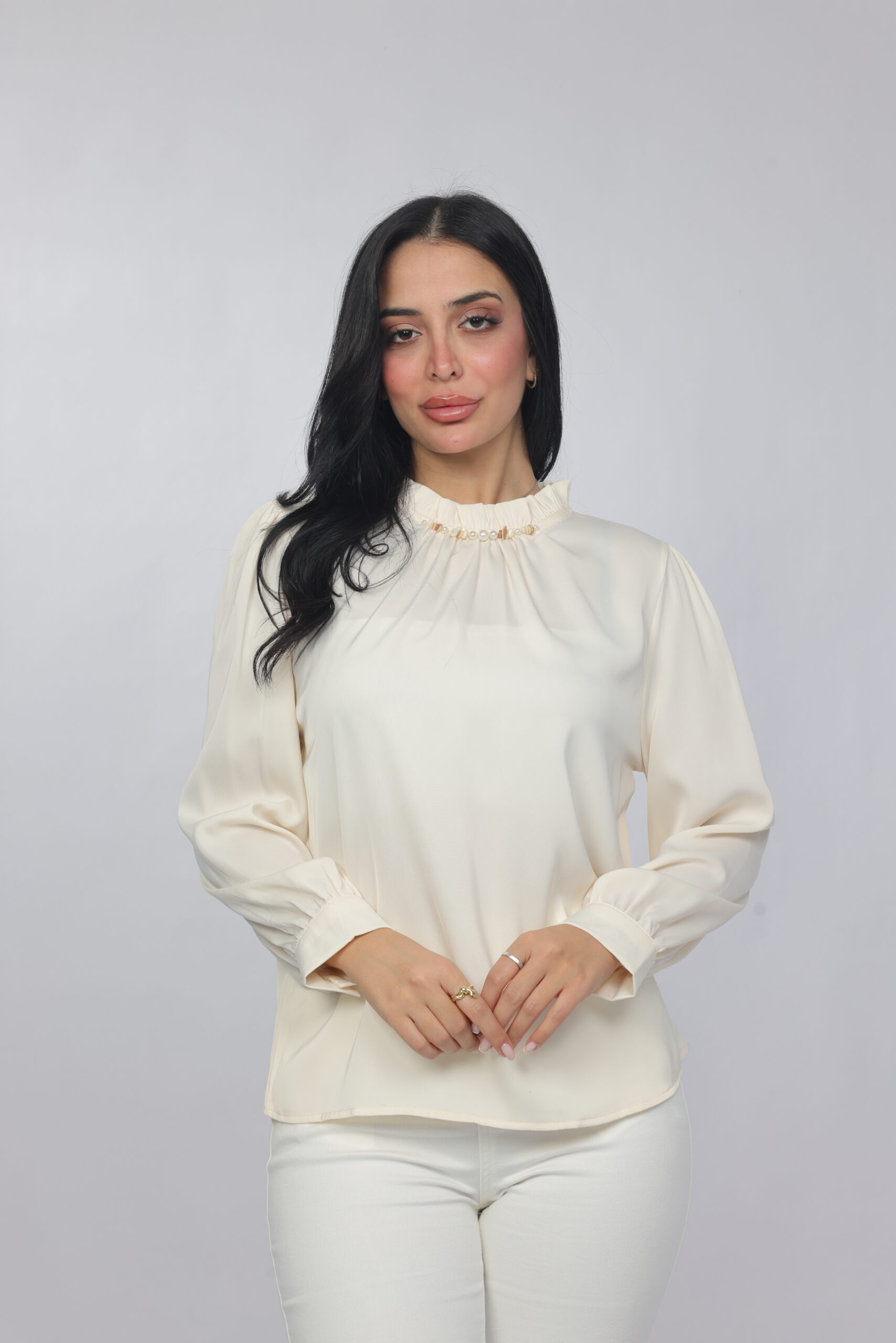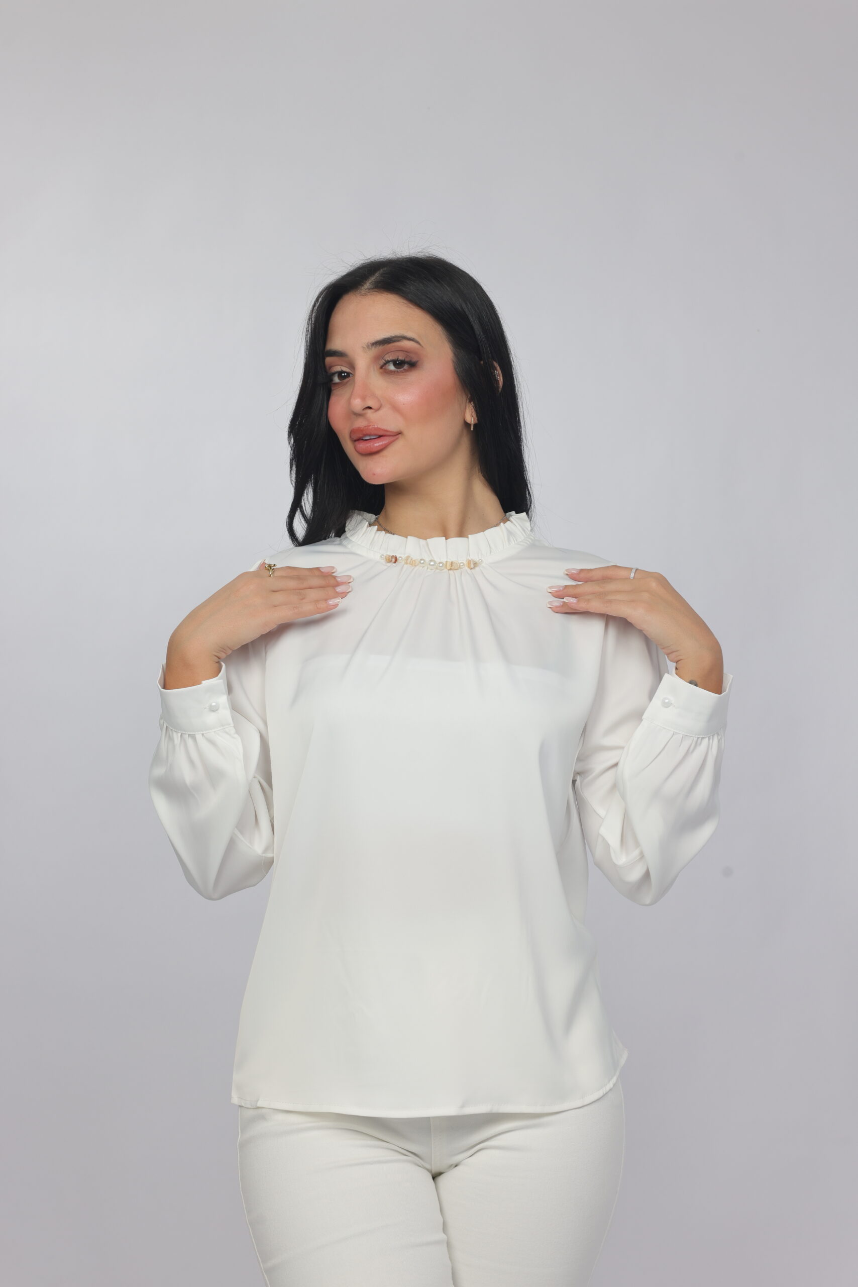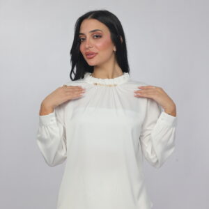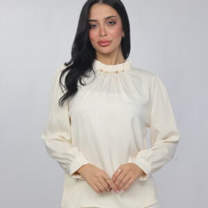 A timeless and refined blouse designed with a soft draped silhouette and delicate pearl detailing along the neckline. This piece combines simplicity with elegance, making it perfect for office wear, formal occasions, or polished everyday styling.