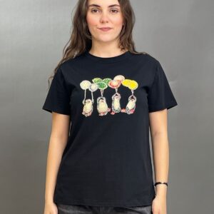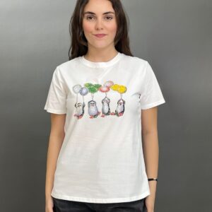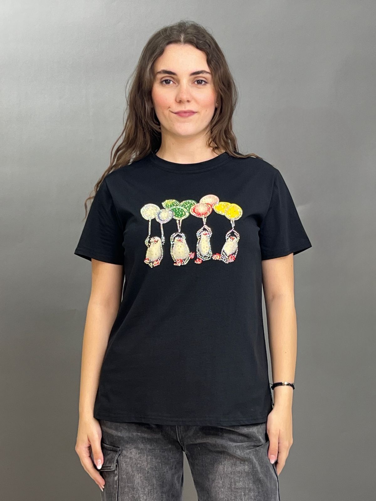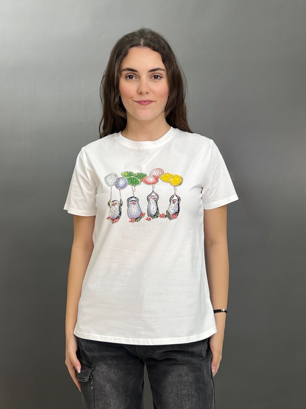 This fun short-sleeve tee features an adorable graphic print of whimsical creatures holding colorful balloons, bringing a cheerful and lighthearted touch to any outfit.