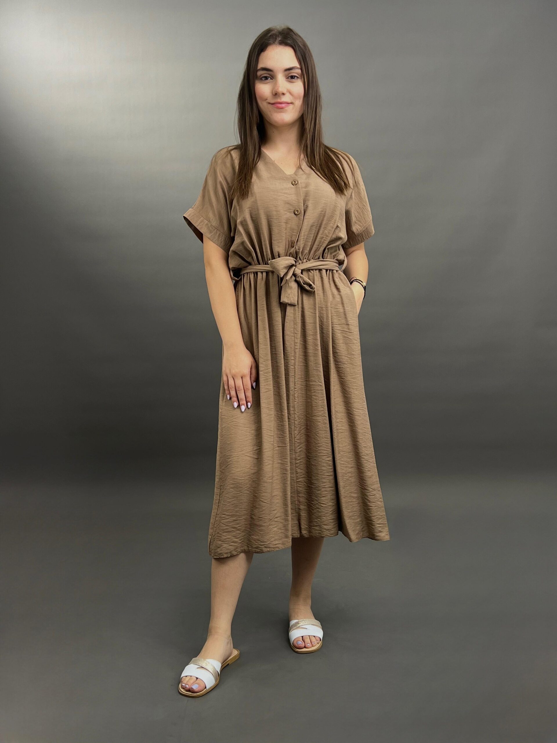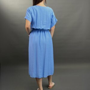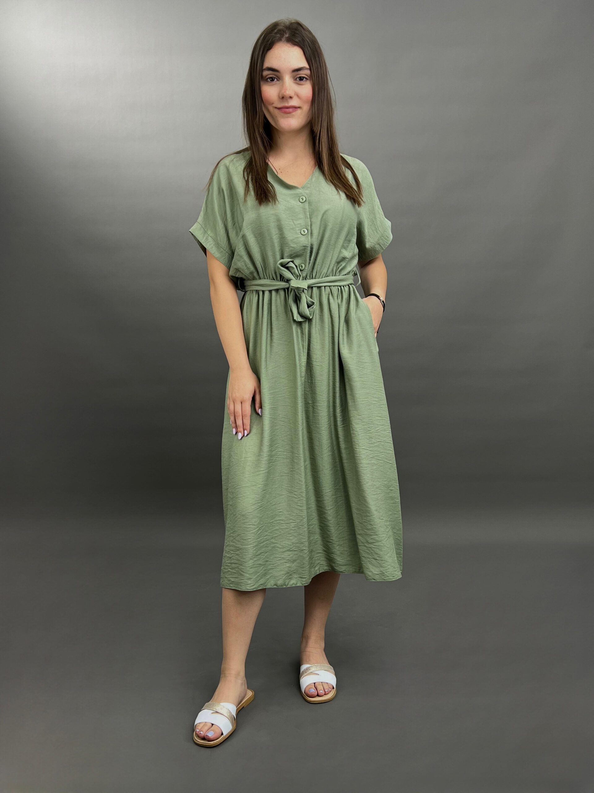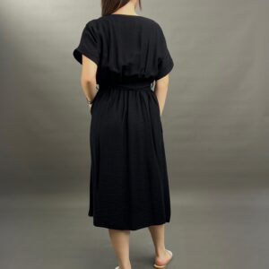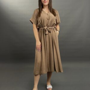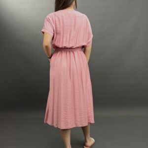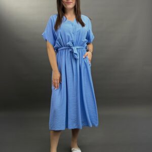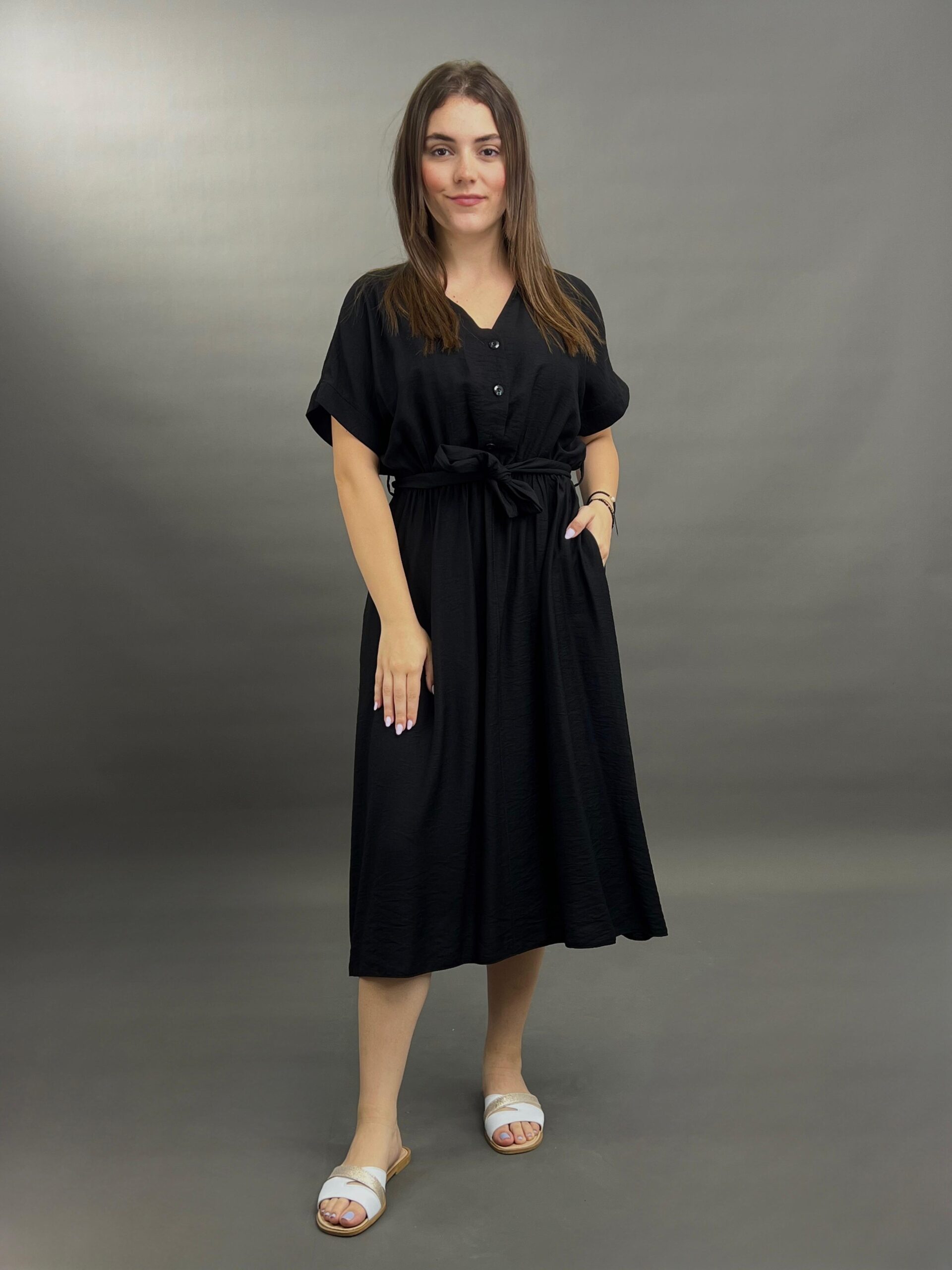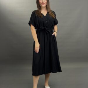 This comfortable midi dress features a classic button-front design and practical side pockets, offering a versatile and easy-to-wear style. Its relaxed silhouette and elbow-length sleeves make it perfect for everyday elegance.
