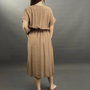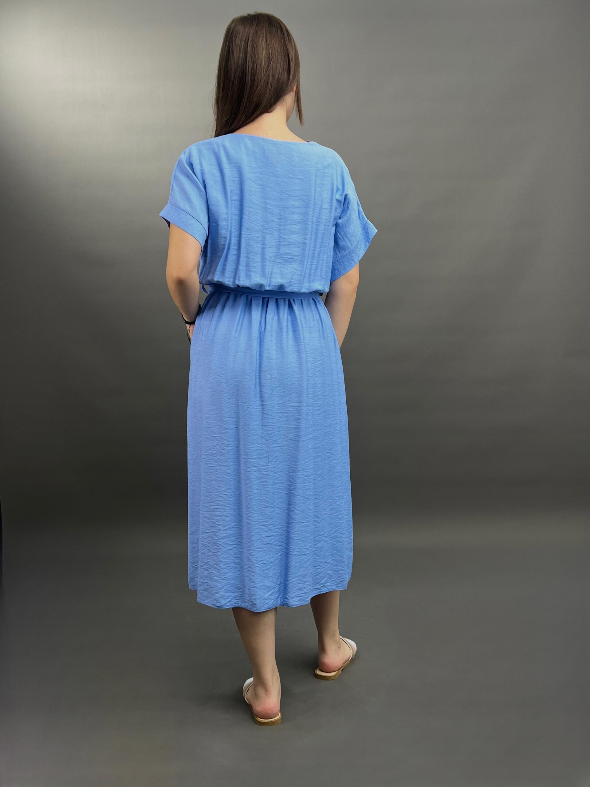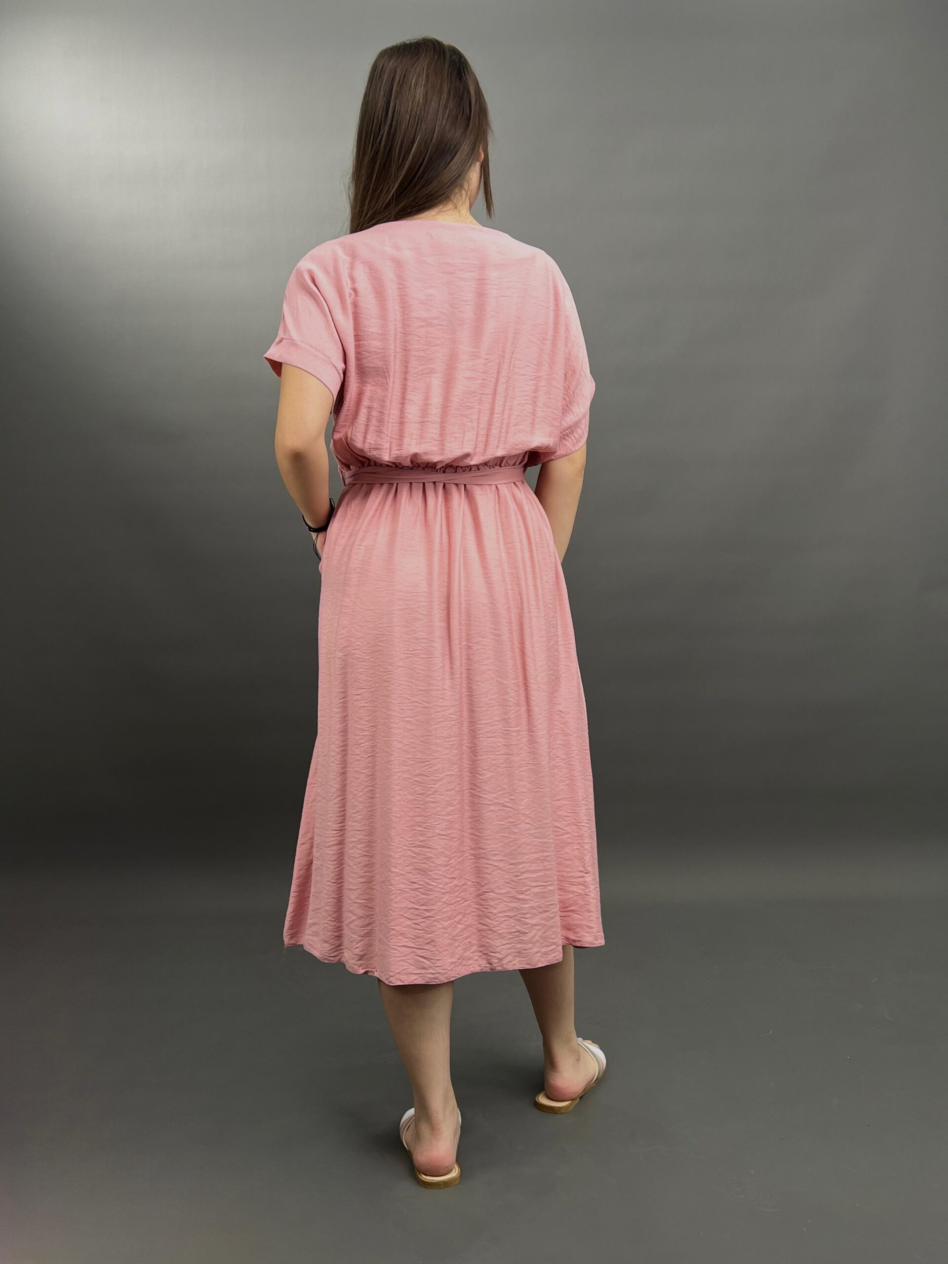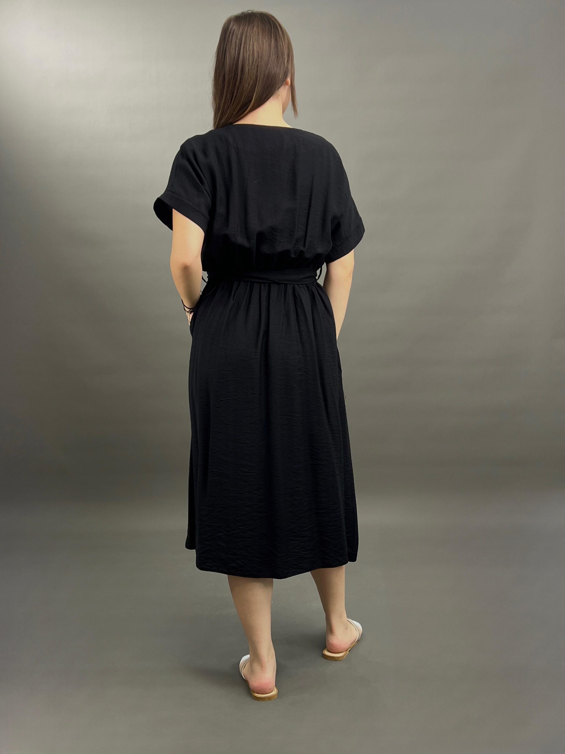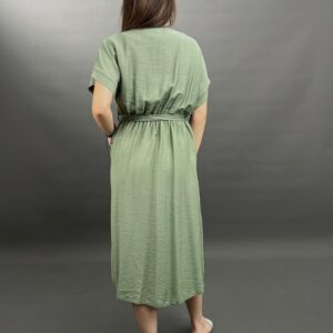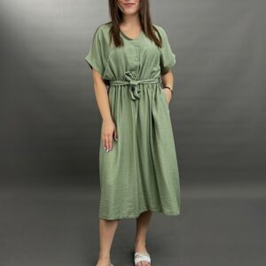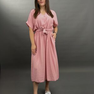 This comfortable midi dress features a classic button-front design and practical side pockets, offering a versatile and easy-to-wear style. Its relaxed silhouette and elbow-length sleeves make it perfect for everyday elegance.
