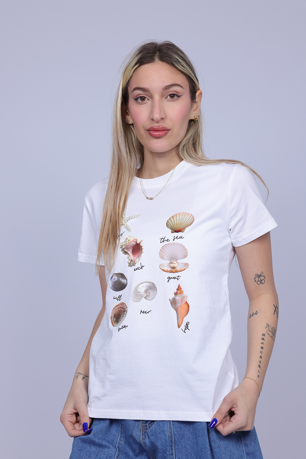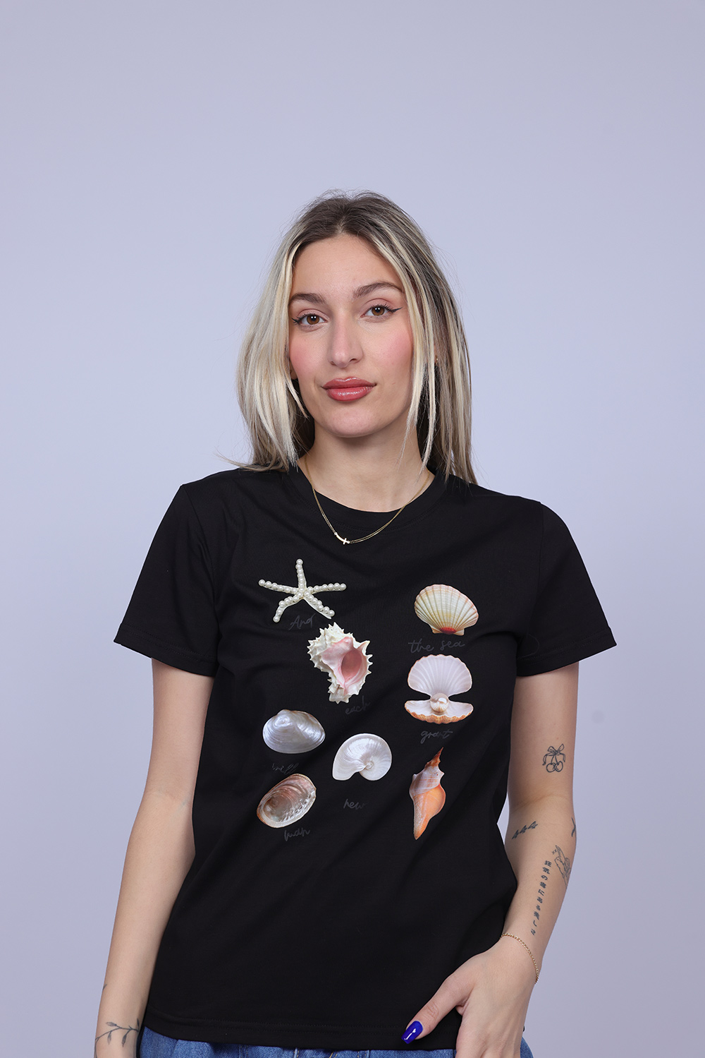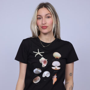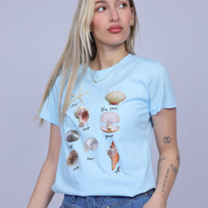 A stylish T-shirt featuring a delicate sea-inspired graphic with illustrated shells and ocean elements that create a fresh and artistic look. The design brings a relaxed coastal vibe, making it perfect for casual everyday outfits. Lightweight and comfortable, this T-shirt adds a soft and playful touch to your wardrobe.