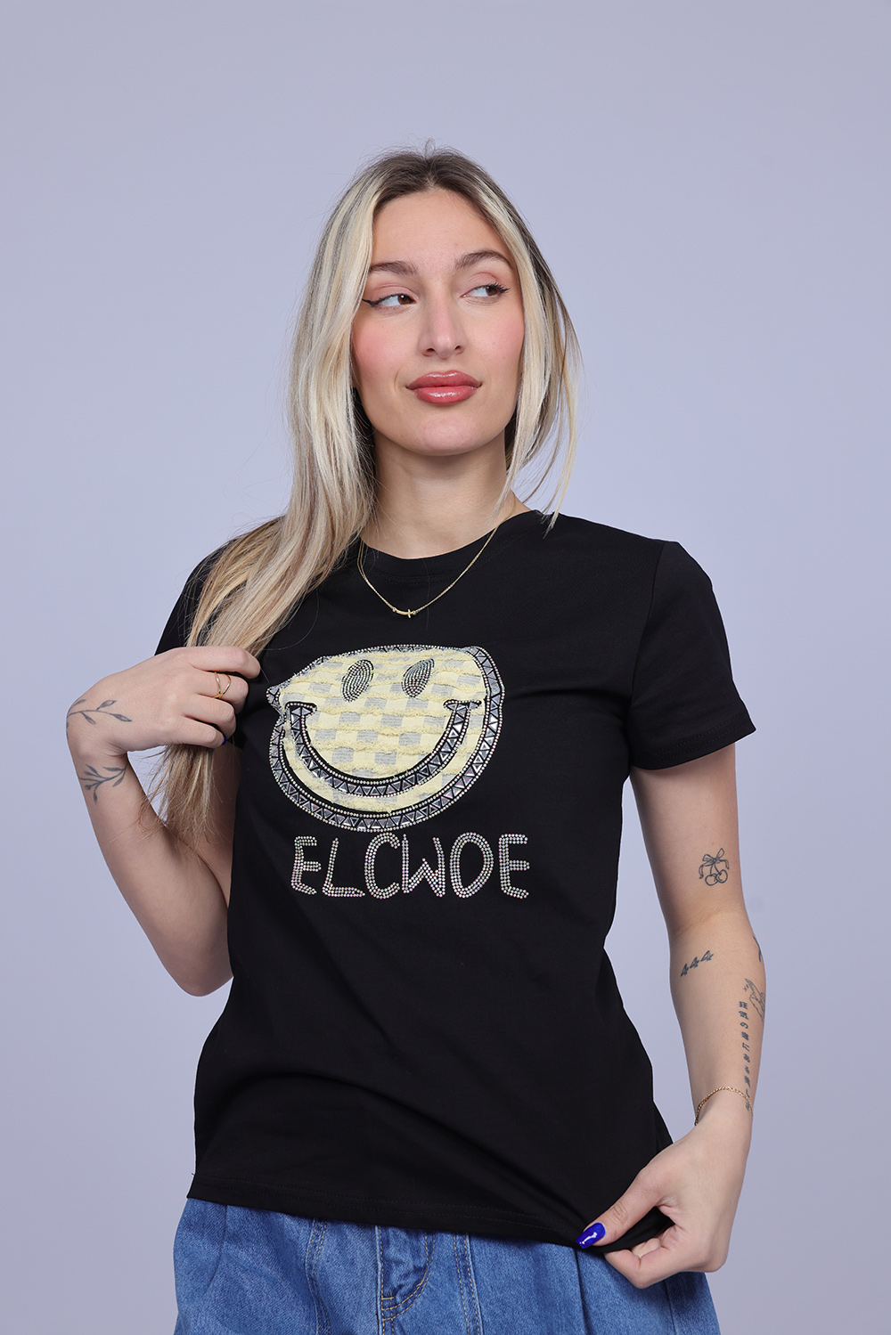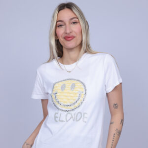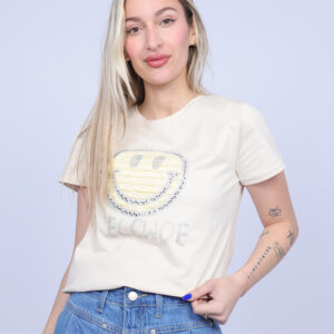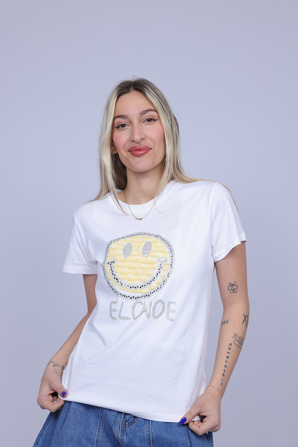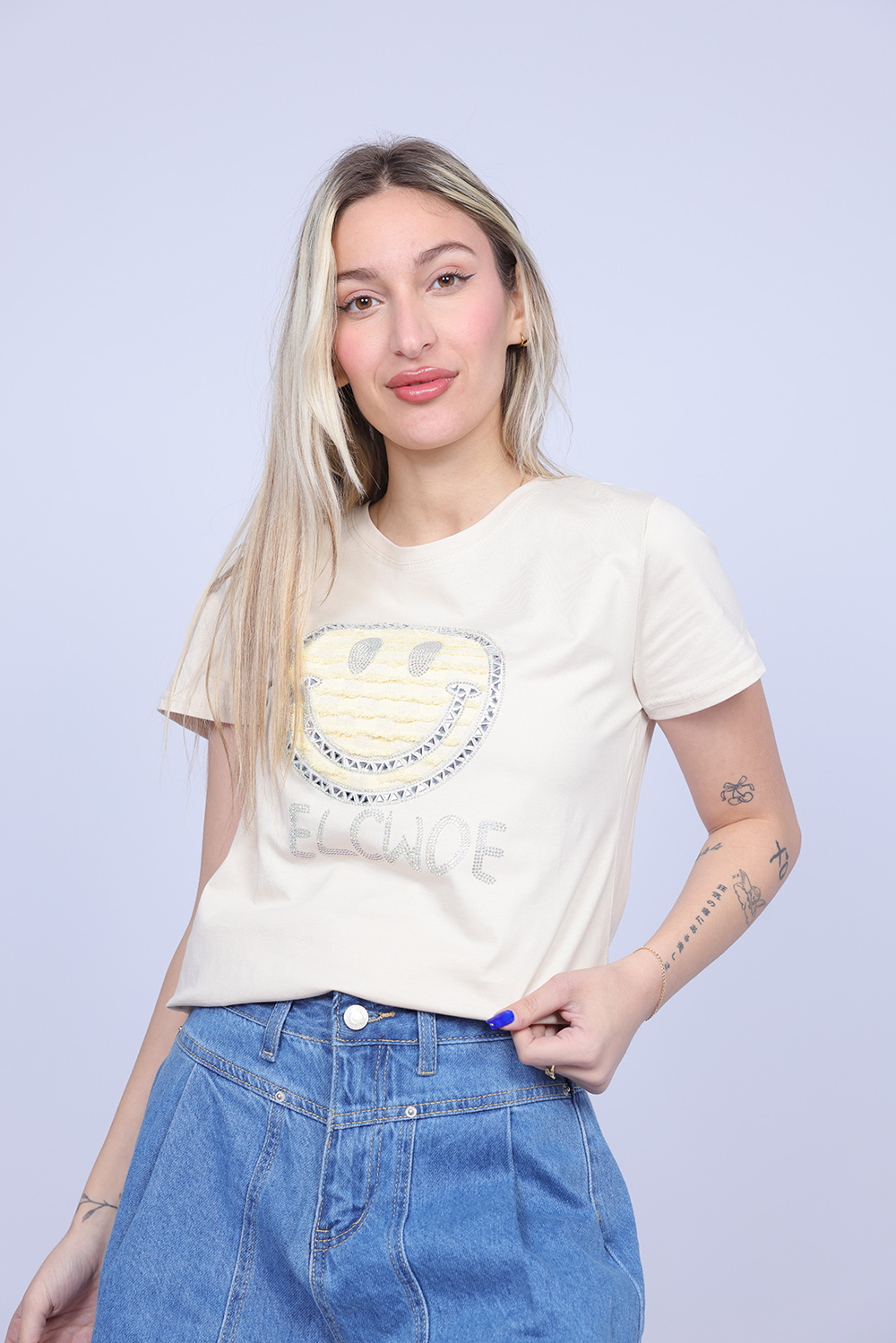 A fun and expressive T-shirt featuring a bold smile graphic that brings a playful vibe to any casual outfit. The design combines textured detailing with decorative embellishments, creating a unique statement piece that stands out effortlessly. Perfect for everyday wear, this T-shirt adds personality and a cheerful touch to your look.