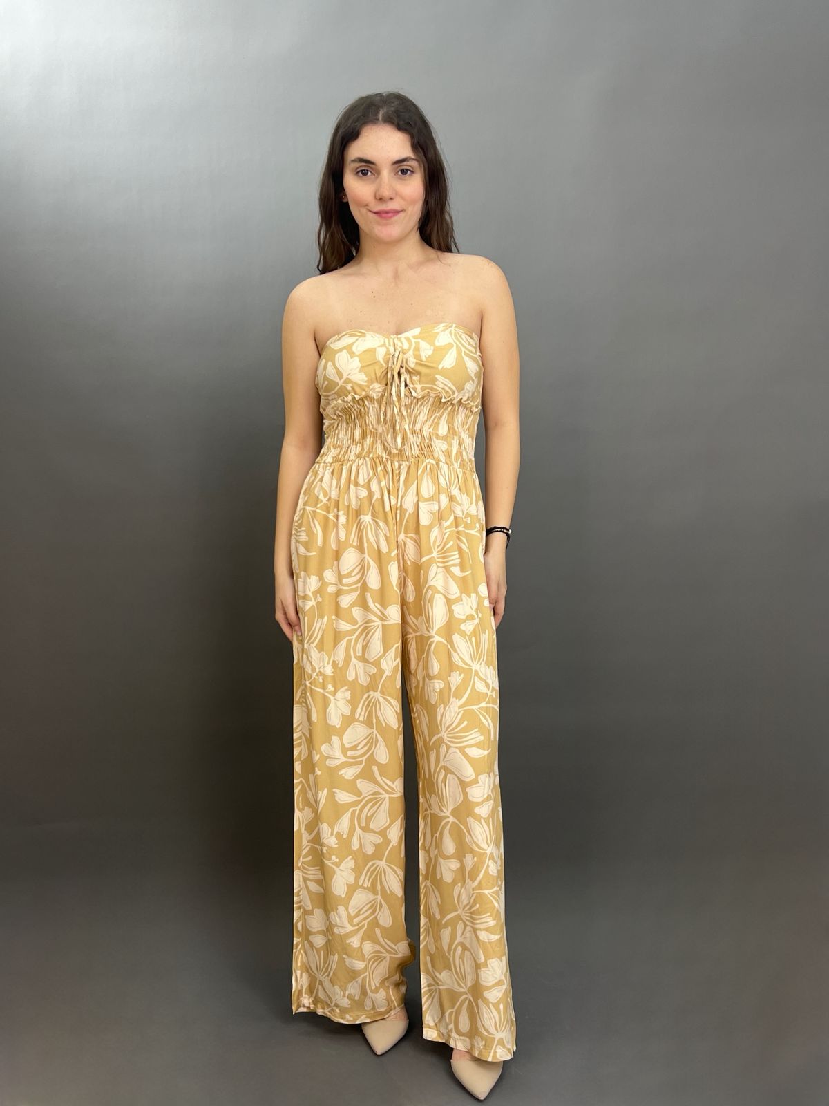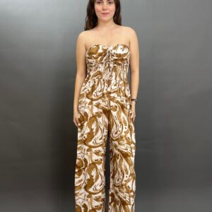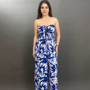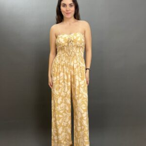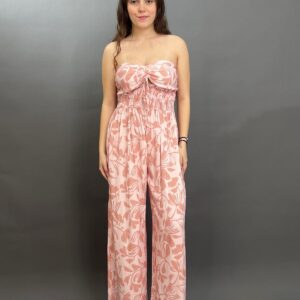 This chic one-piece features a comfortable smocked bodice, creating a flattering, fitted top that transitions into a flowing wide-leg pant. The all-over botanical pattern adds a touch of bohemian charm, making it a perfect choice for effortless style.