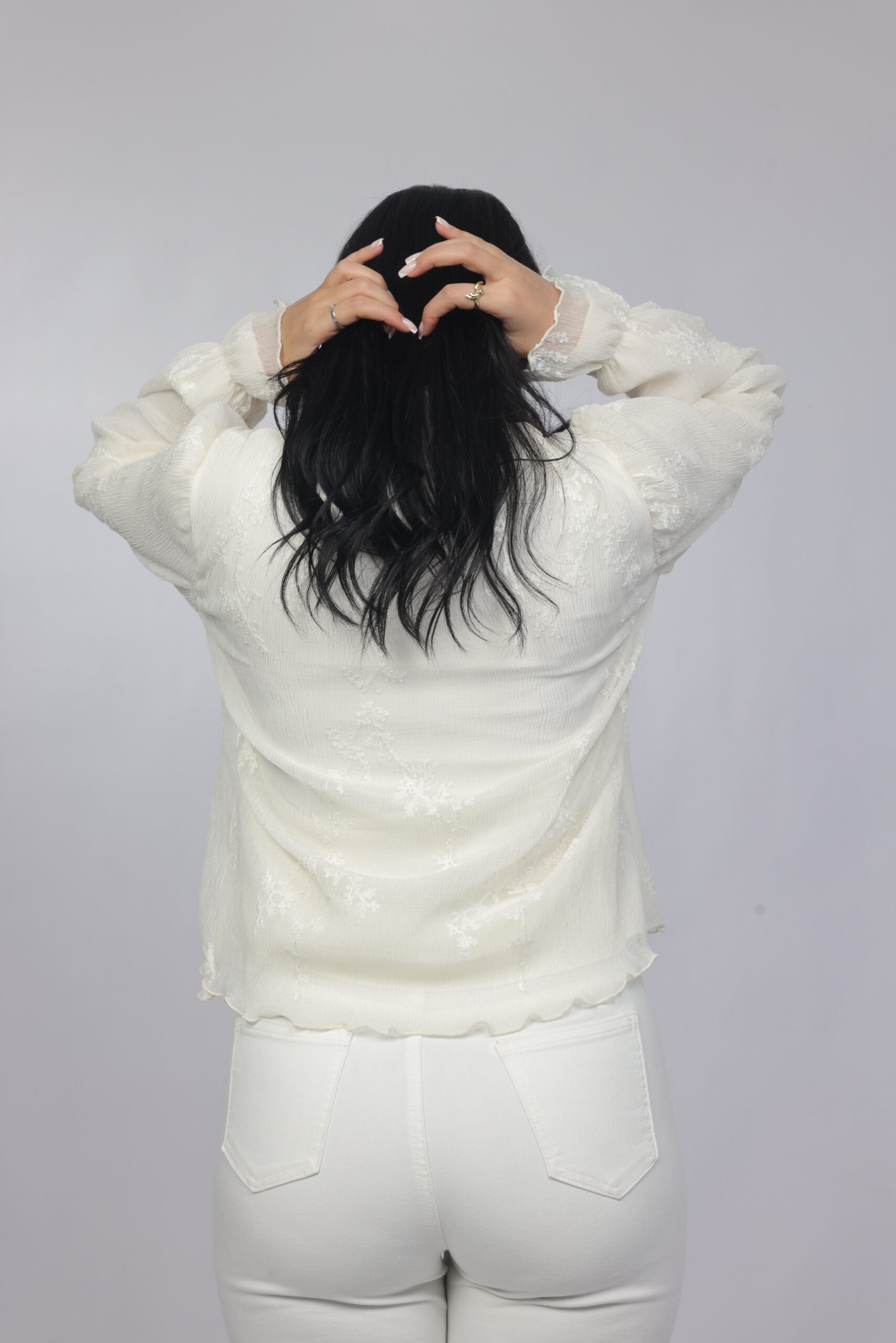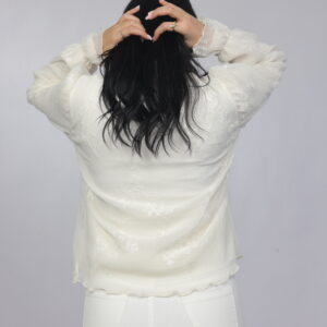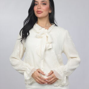 A delicate and graceful piece designed with a soft textured finish and an elegant bow neckline. This blouse offers a romantic silhouette with flowy sleeves and subtle detailing, making it perfect for both refined daytime looks and chic evening styling.