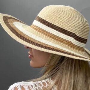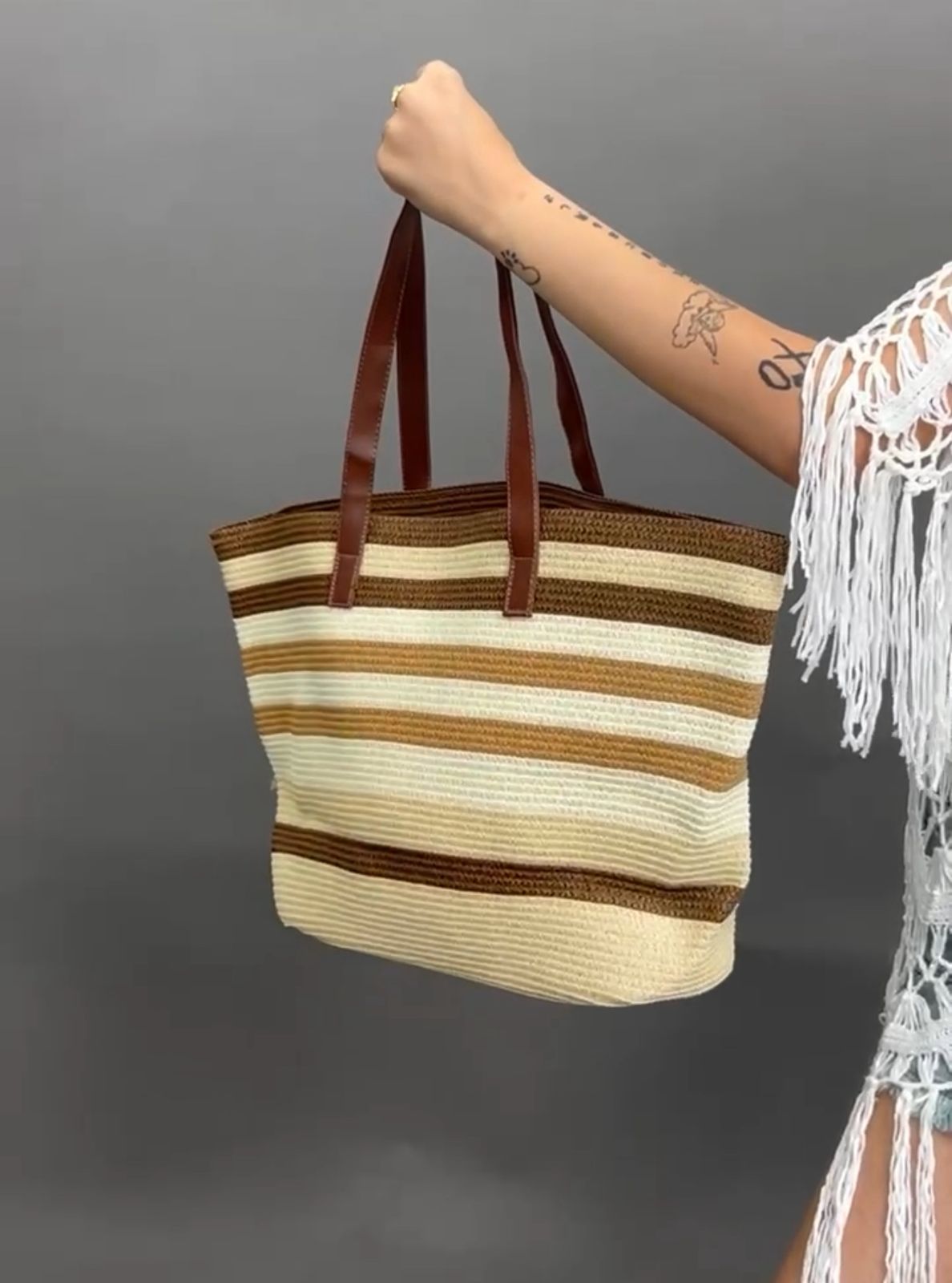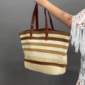 This set features a wide-brimmed straw hat with concentric circular stripes, paired with a matching striped straw tote bag with sturdy handles.