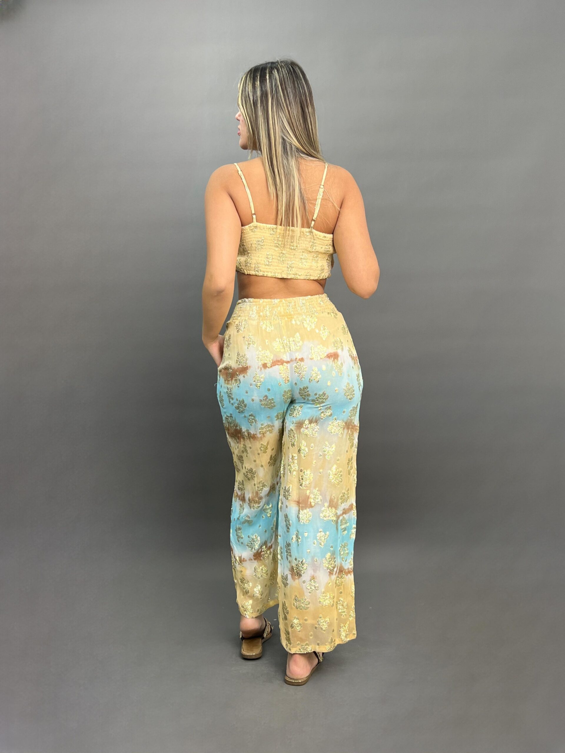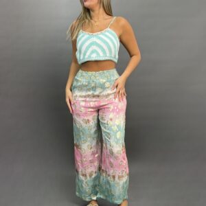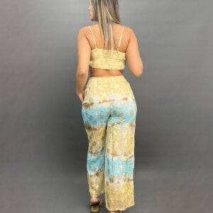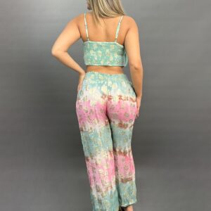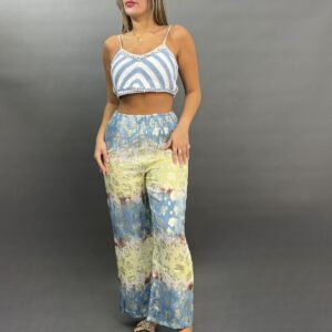 This chic two-piece set features a cropped camisole top with an elegant striped pattern and delicate spaghetti straps, perfectly complemented by relaxed wide-leg trousers. The trousers also boast a matching striped design, creating a cohesive and effortlessly stylish look suitable for casual outings or elevated relaxation.