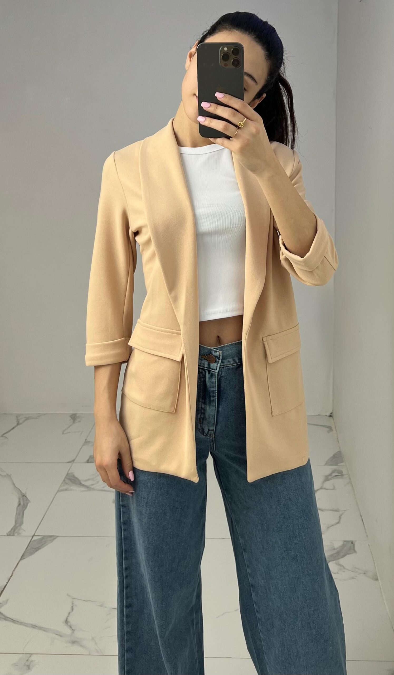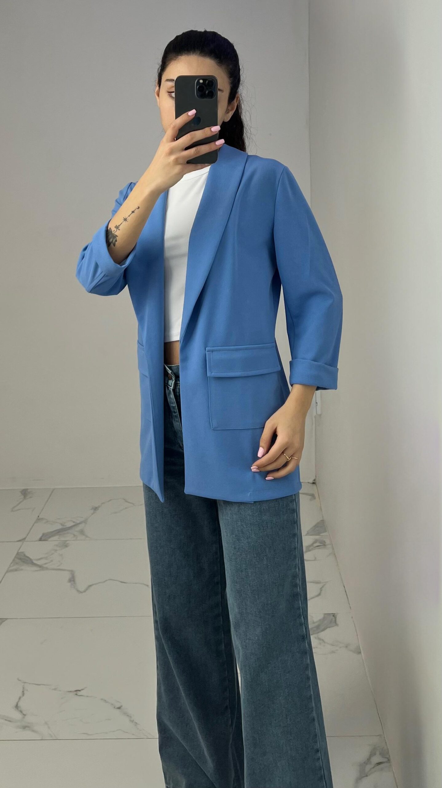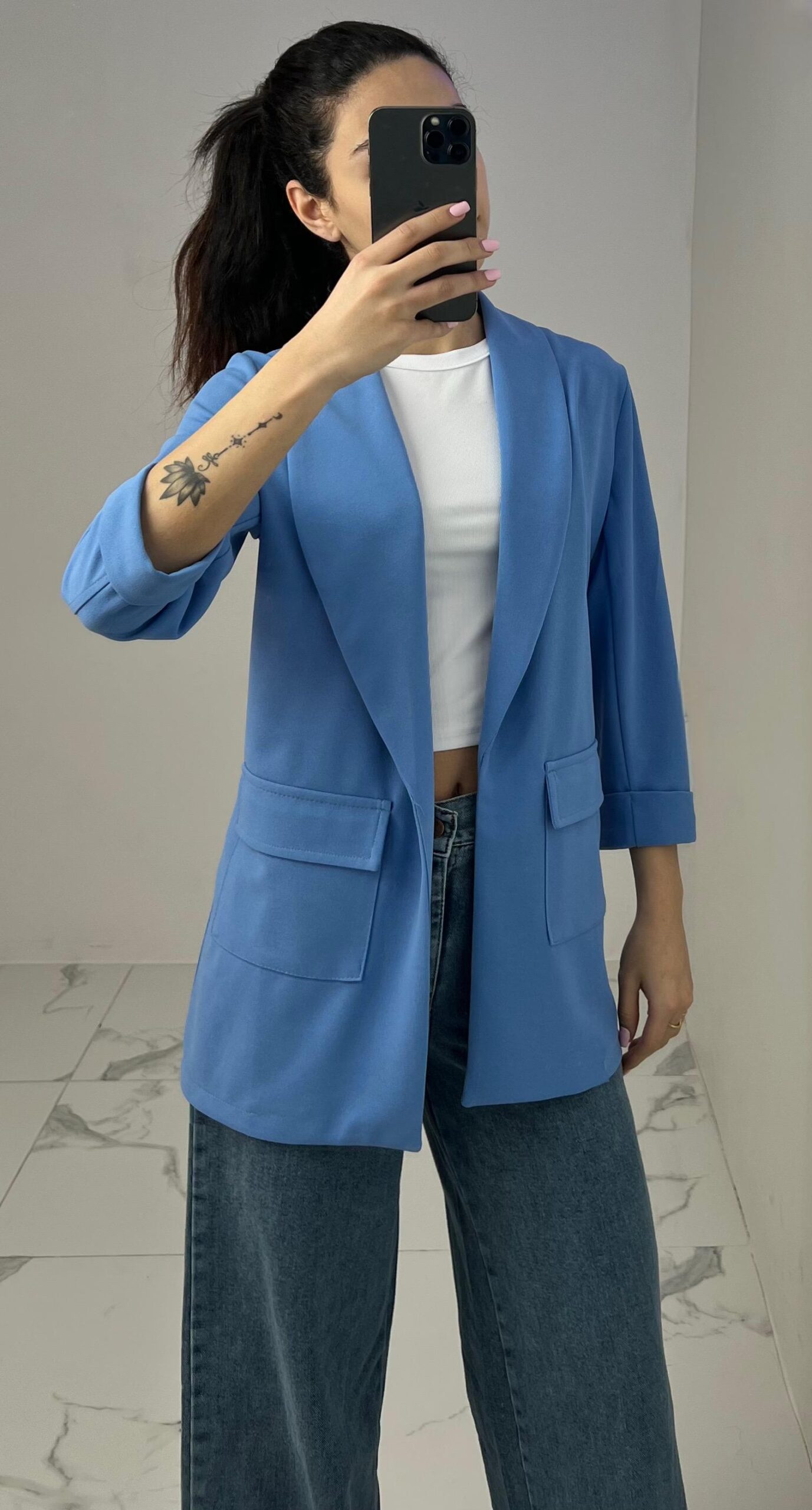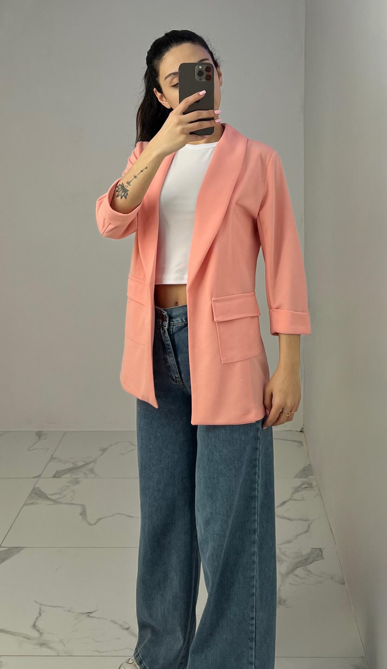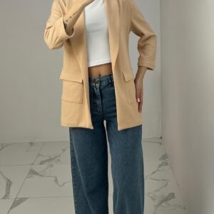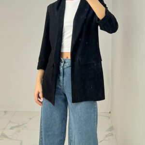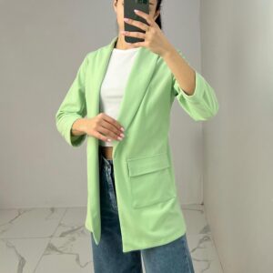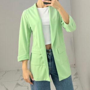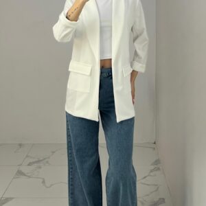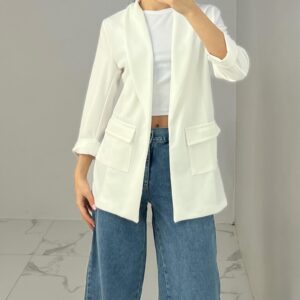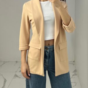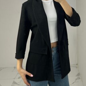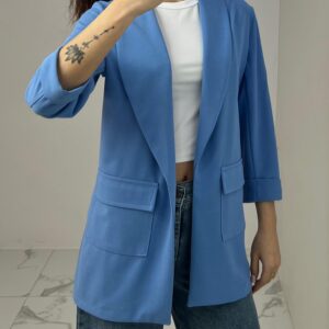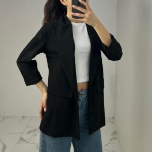 Tailored blazer featuring a sleek open front, structured shoulders, and flap pockets. Designed with rolled-up 3/4 sleeves for a modern and chic twist—perfect for elevating any smart-casual look. Fit: True To Size Model Size: M