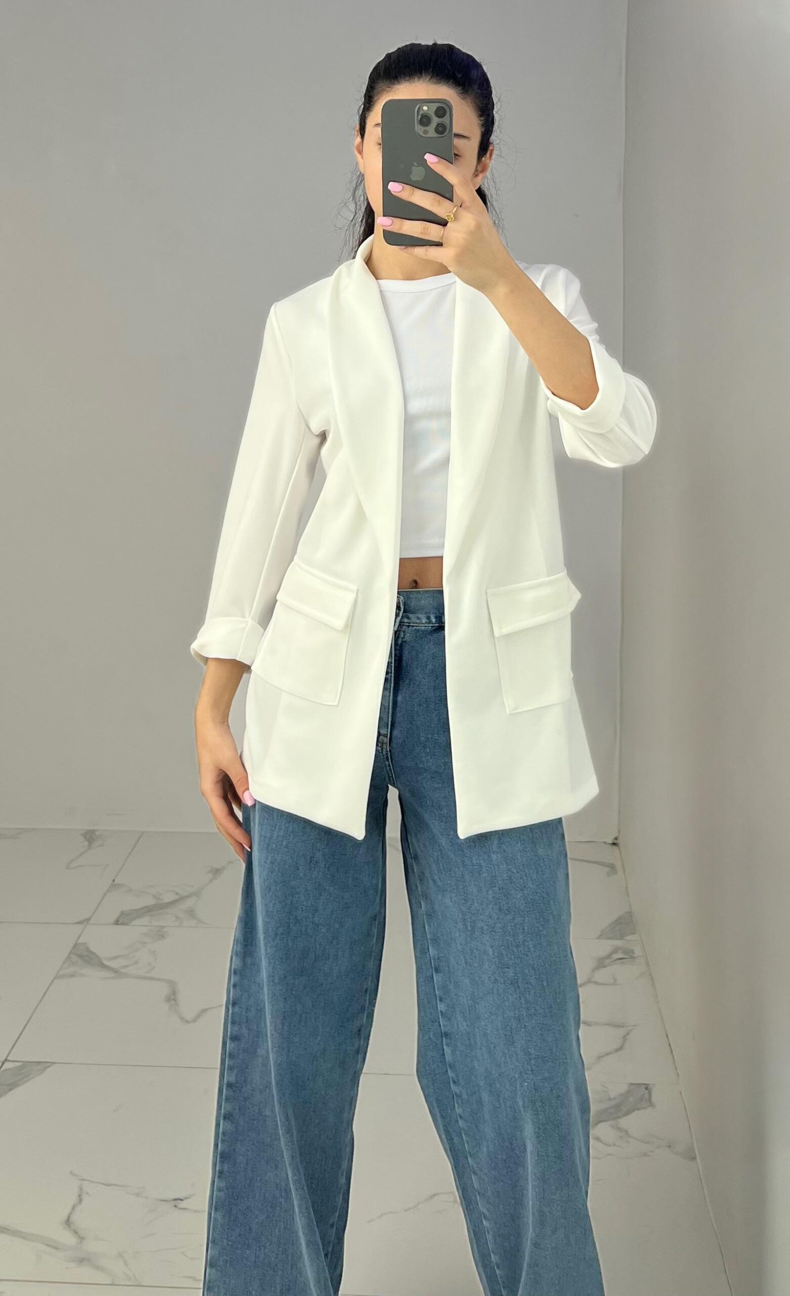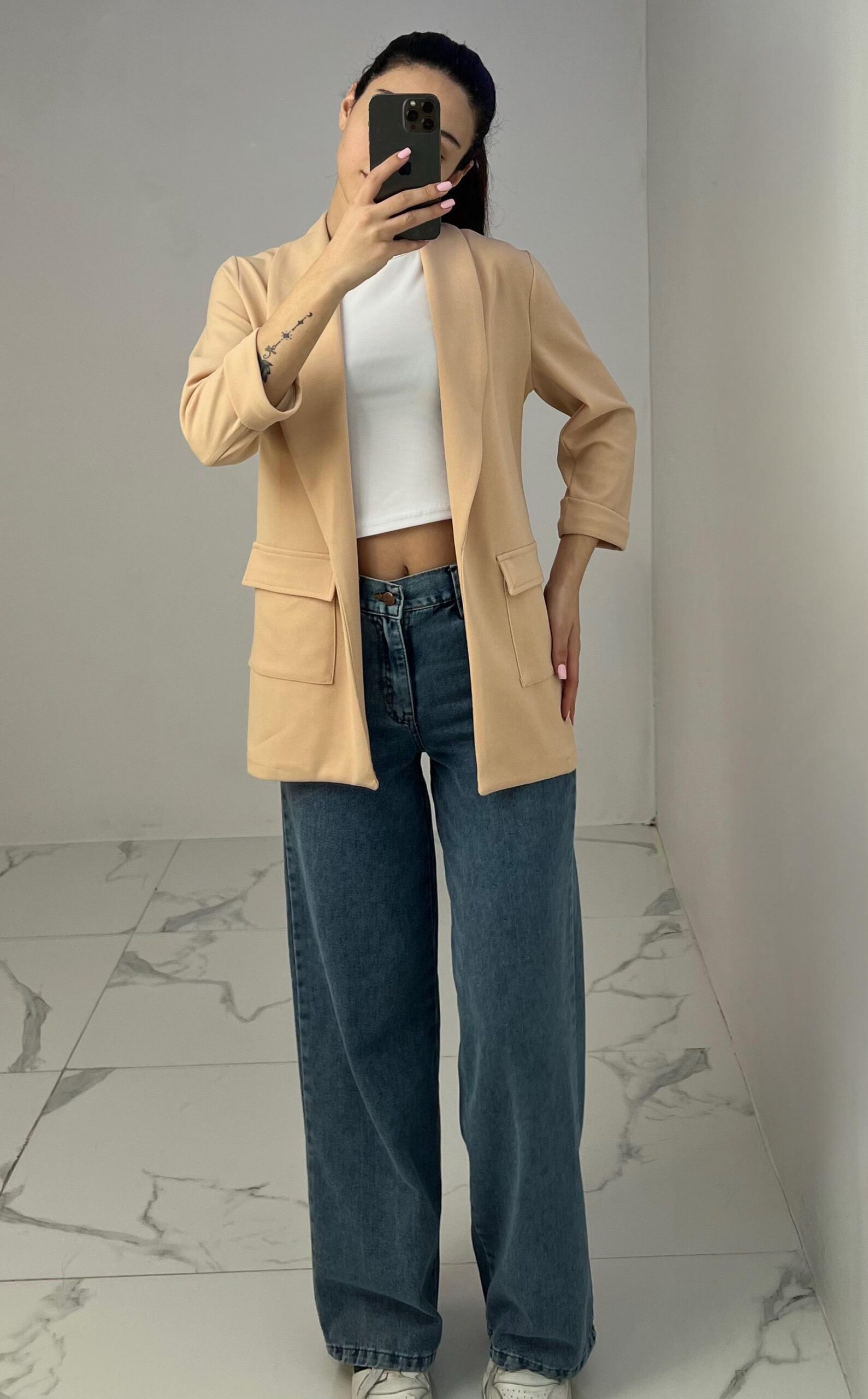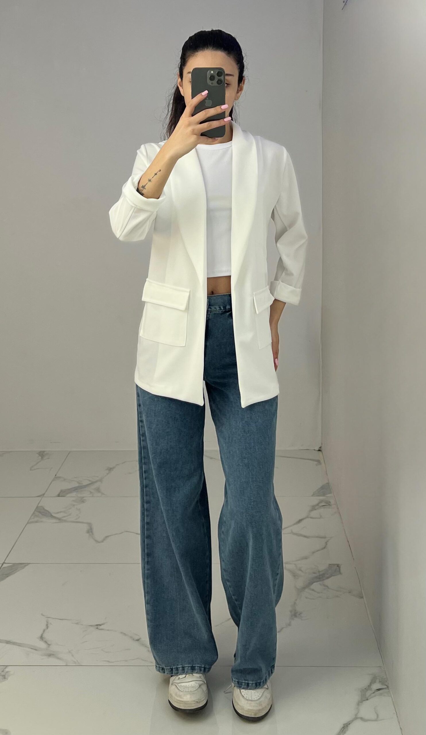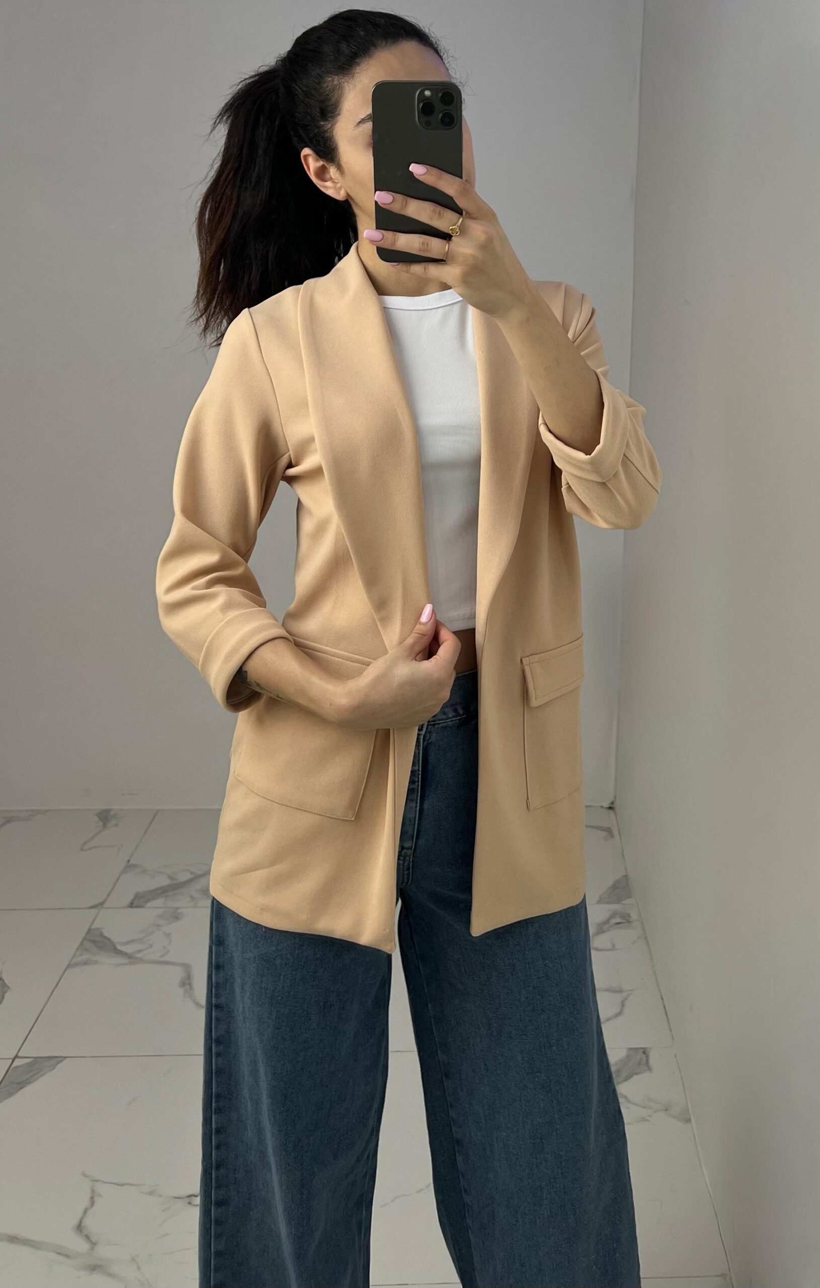 Tailored blazer featuring a sleek open front, structured shoulders, and flap pockets. Designed with rolled-up 3/4 sleeves for a modern and chic twist—perfect for elevating any smart-casual look. Fit: True To Size Model Size: M