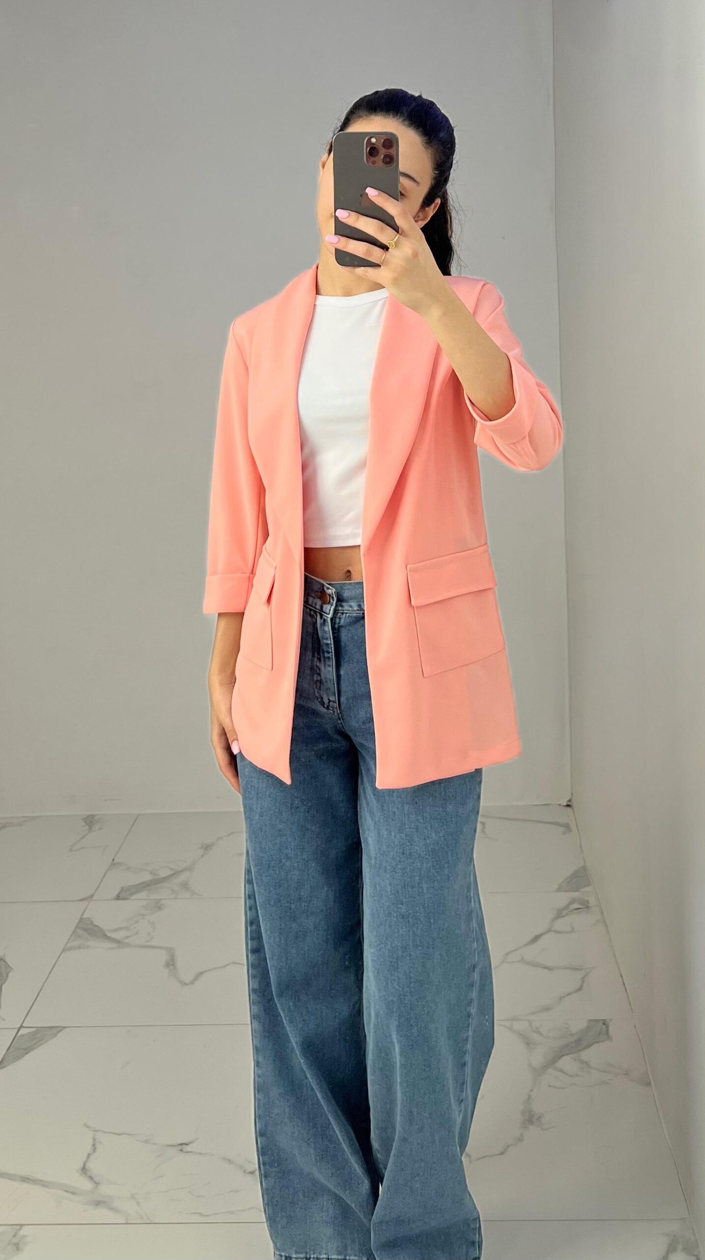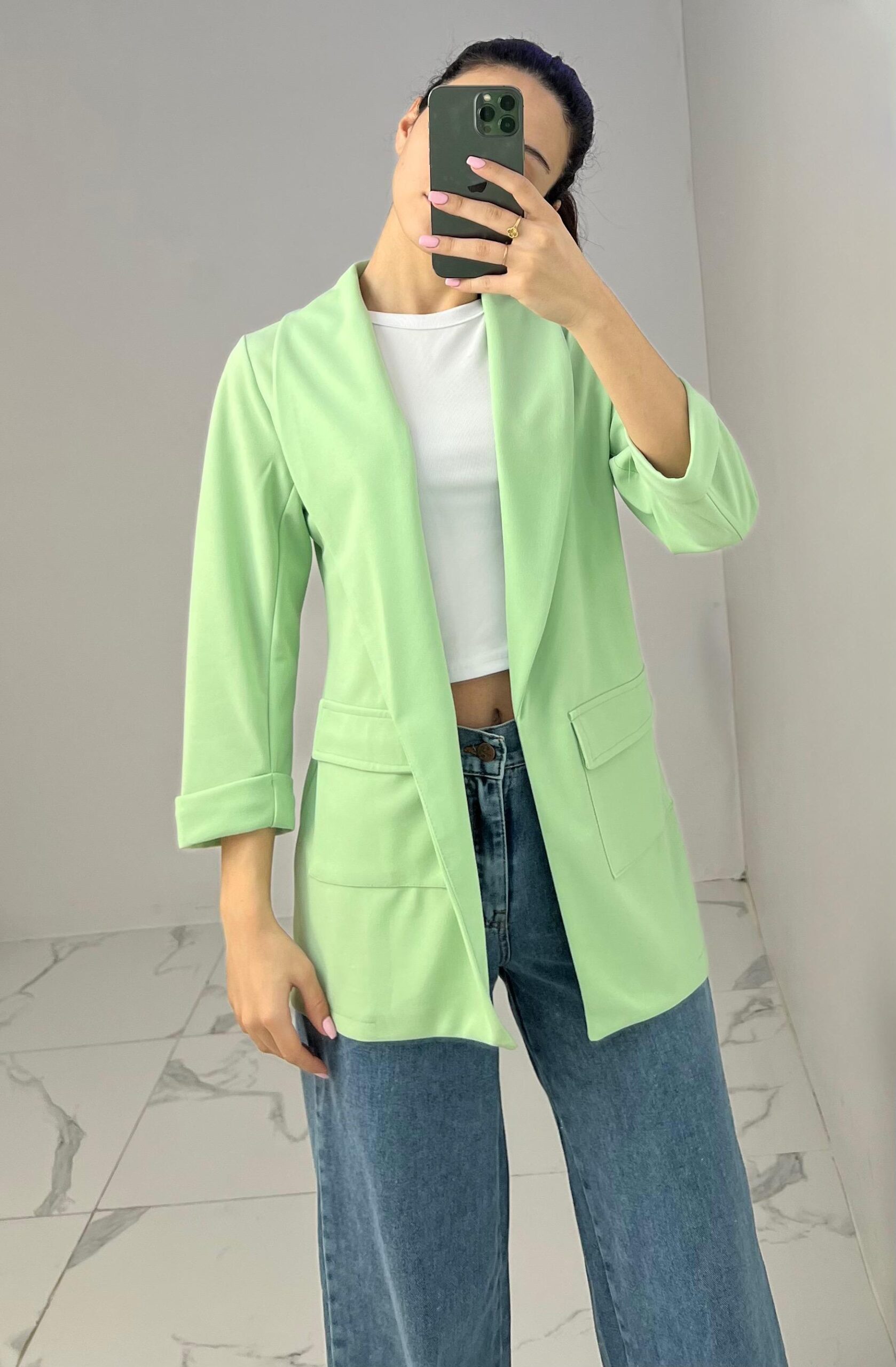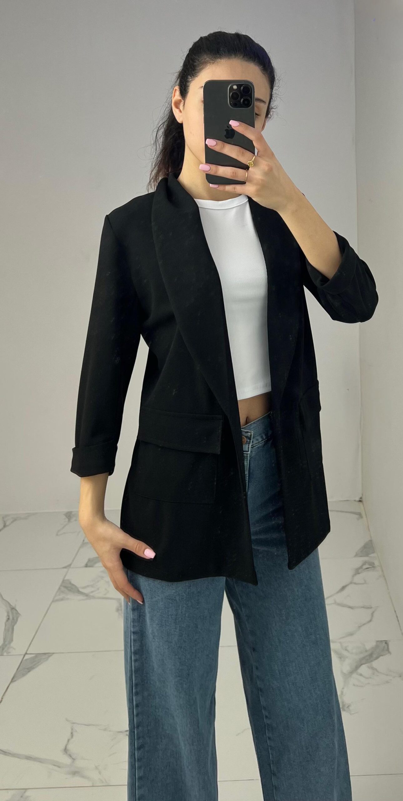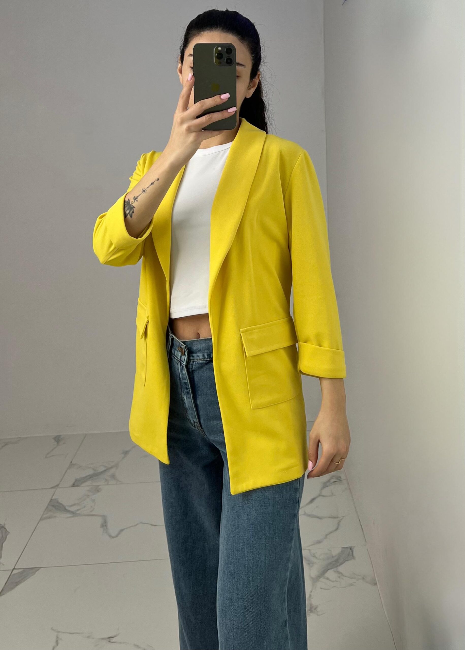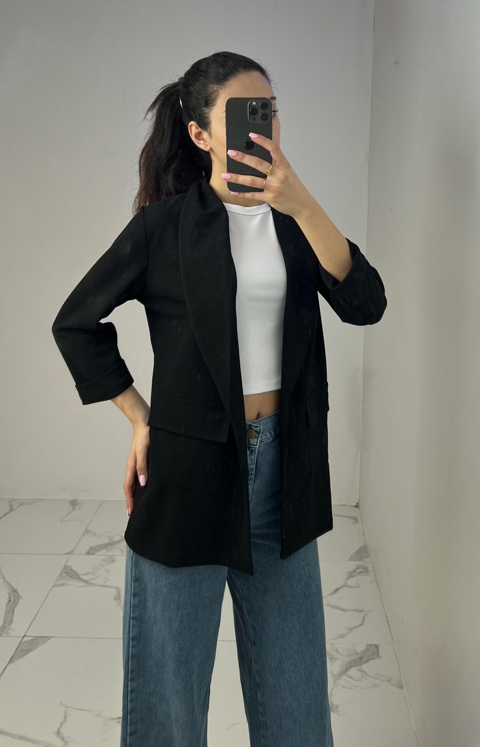Tailored blazer featuring a sleek open front, structured shoulders, and flap pockets. Designed with rolled-up 3/4 sleeves for a modern and chic twist—perfect for elevating any smart-casual look. Fit: True To Size Model Size: M