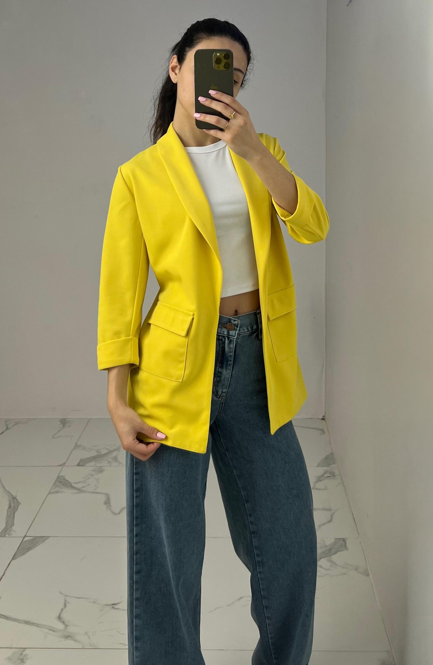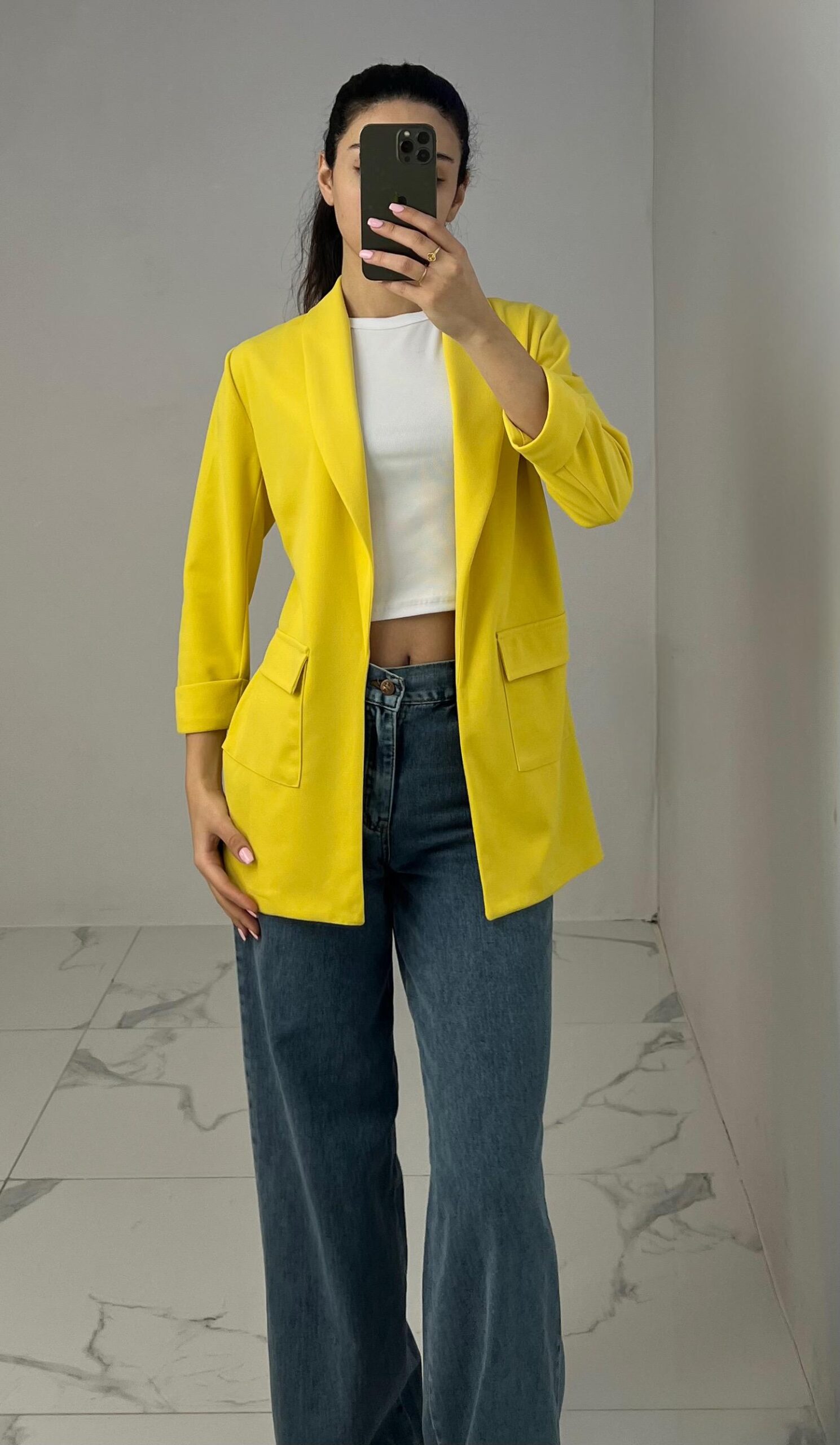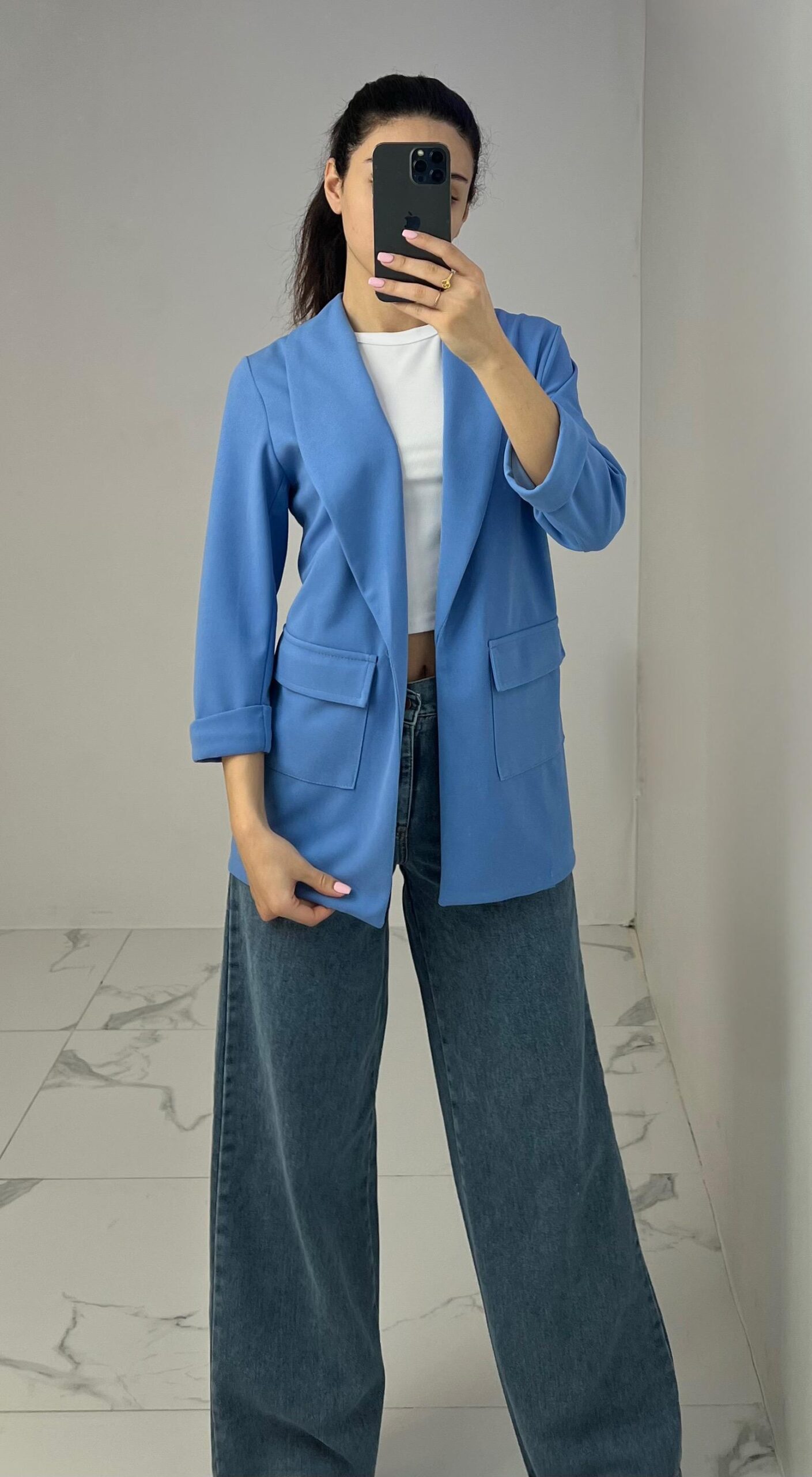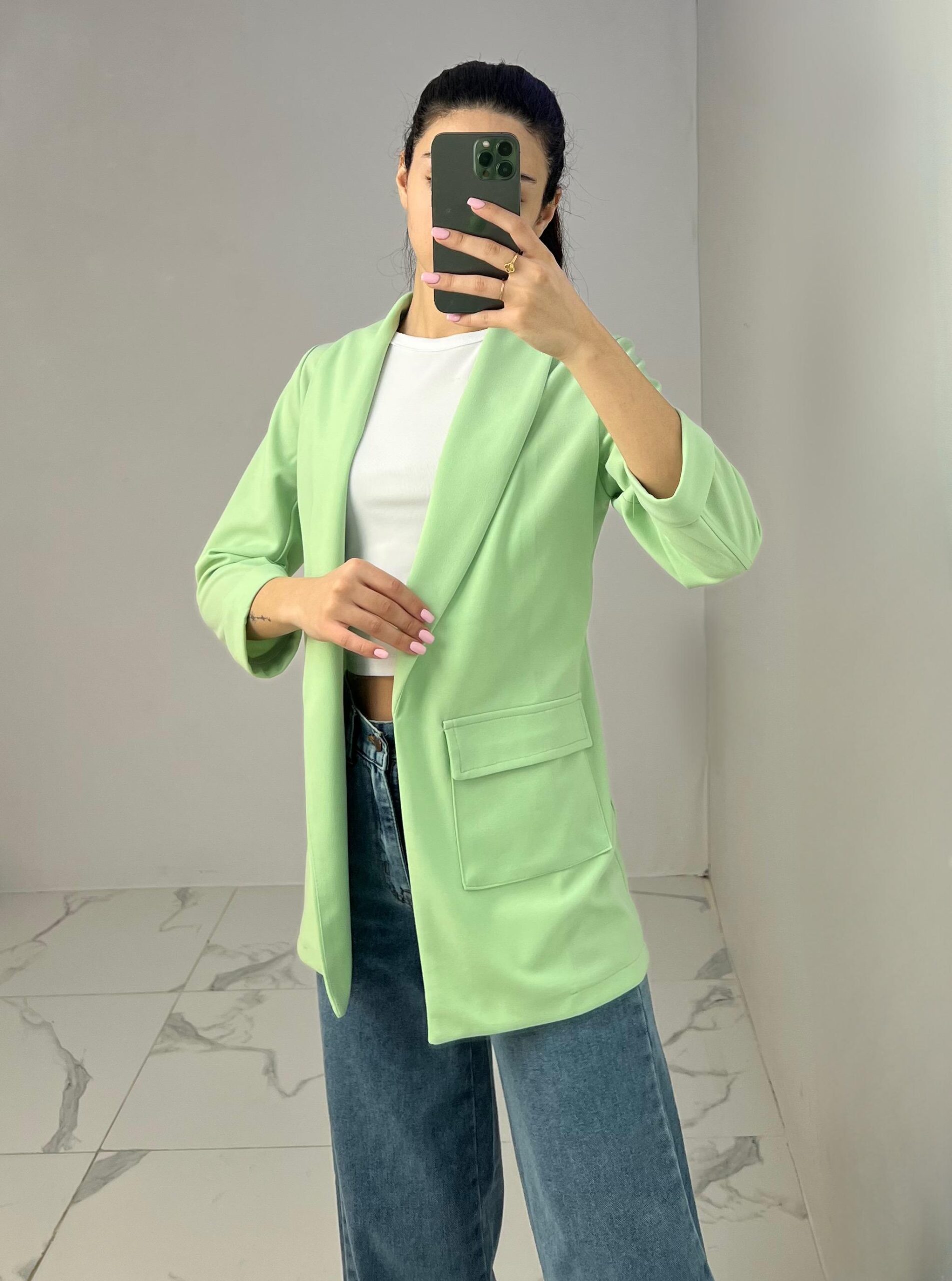 Tailored blazer featuring a sleek open front, structured shoulders, and flap pockets. Designed with rolled-up 3/4 sleeves for a modern and chic twist—perfect for elevating any smart-casual look. Fit: True To Size Model Size: M