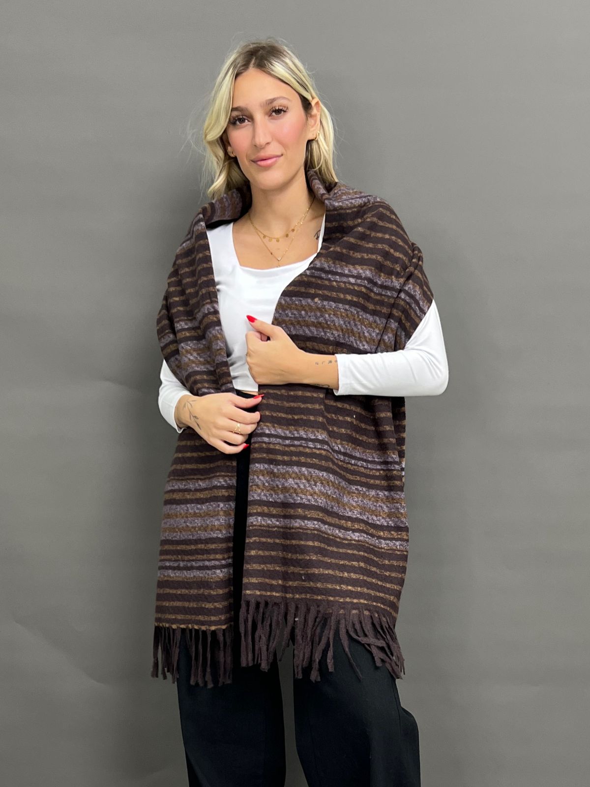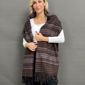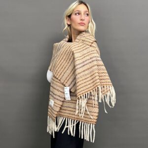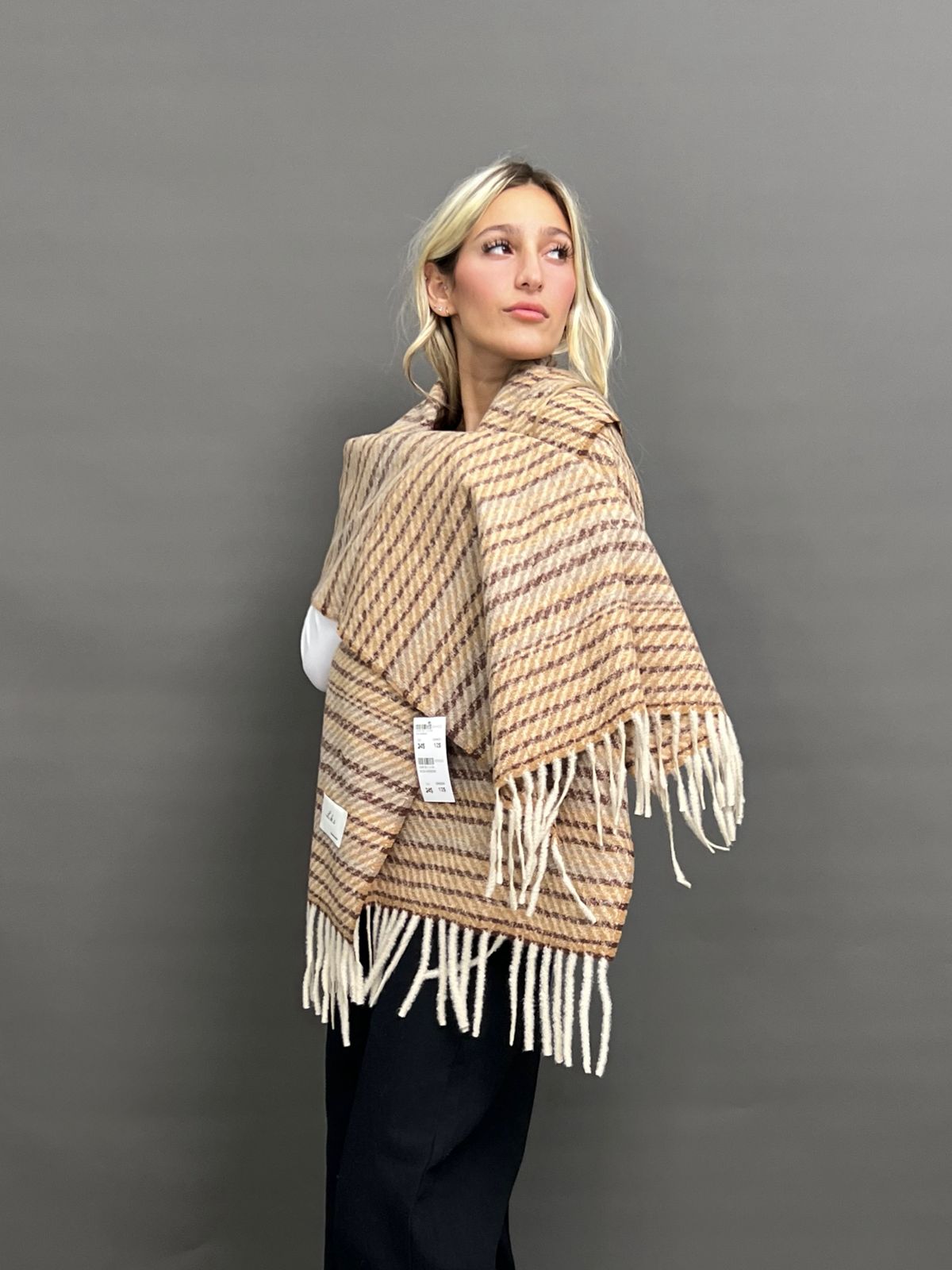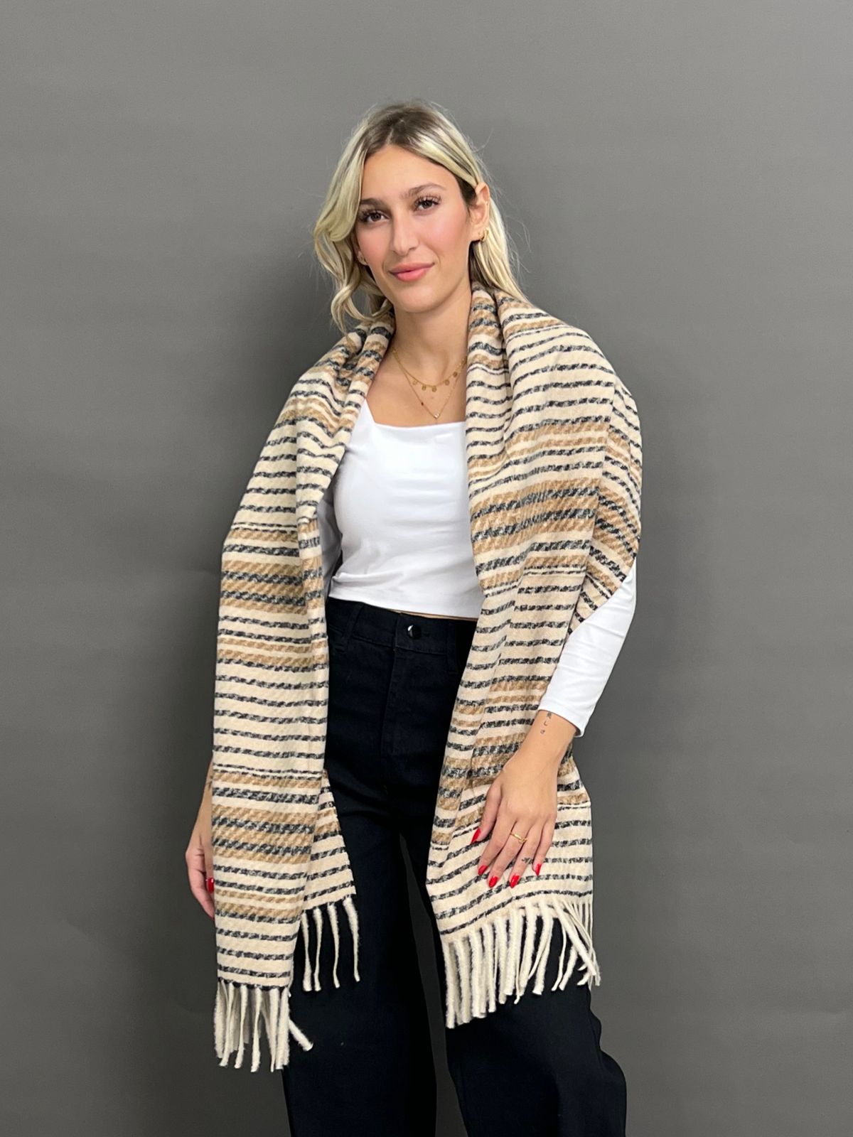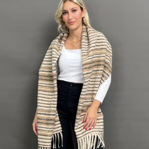 This chunky, oversized wrap is crafted from a soft, substantial fabric featuring a fine diagonal stripe or herringbone weave pattern. Designed for warmth and versatility, it can be styled as a shawl or a heavy neck scarf. The accessory is finished with thick, pronounced fringed edges for a cozy, rustic touch.